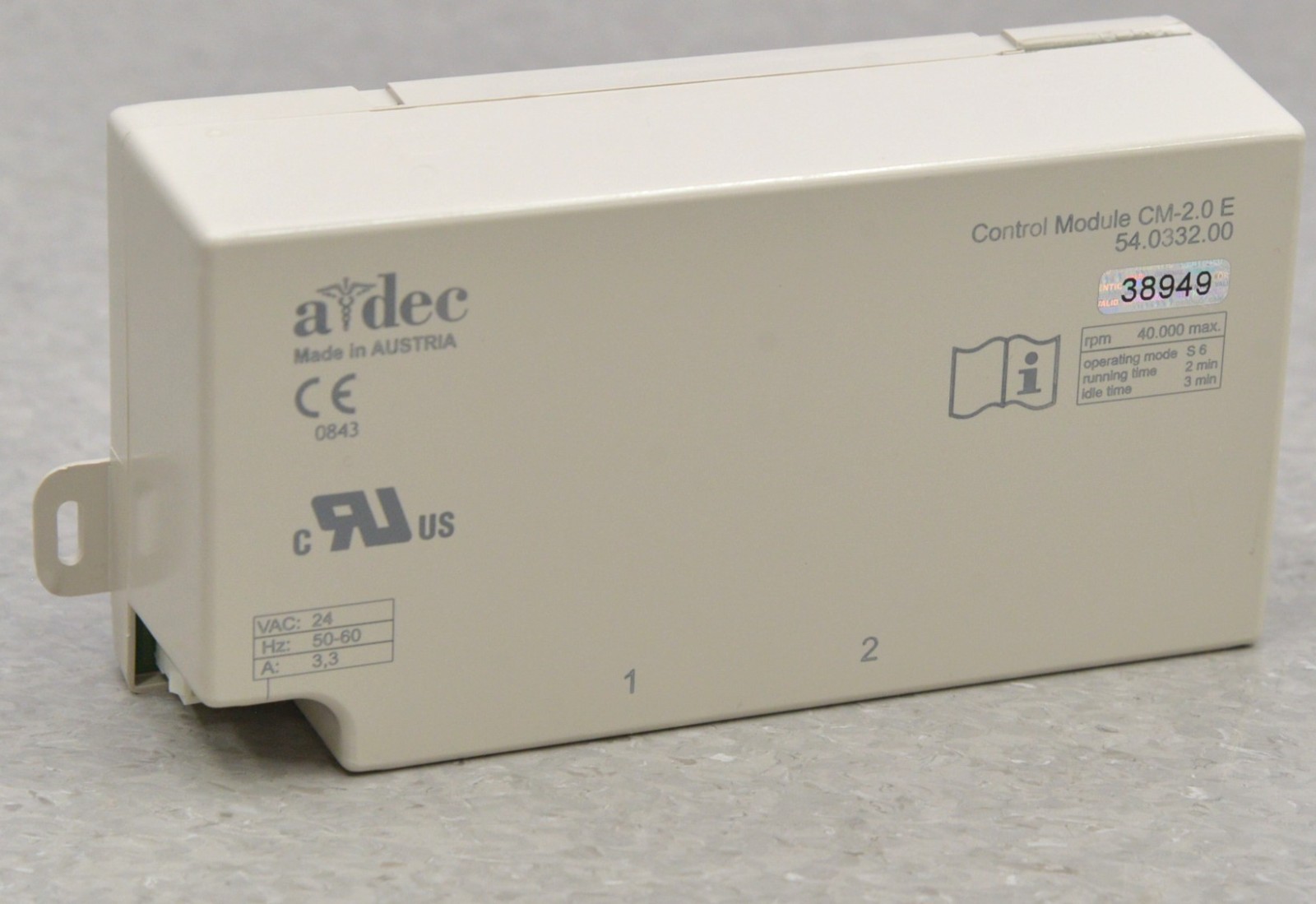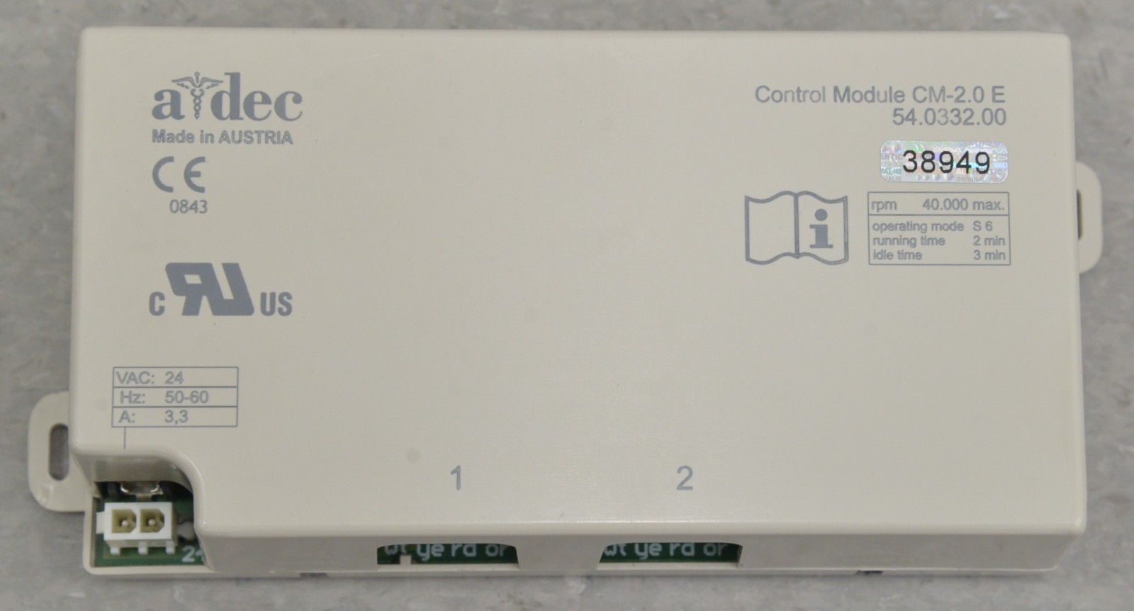 This Adec CM-2.0 E Control Module 54.0332.00 came from a working environment and is in good cosmetic condition. All connection points are clean and in excellent condition. There are no handpieces with this unit. There are some minor scuff marks from previous use (see photos). This unit comes with a 30 day satisfaction guarantee. Includes everything in the pictures and nothing else.