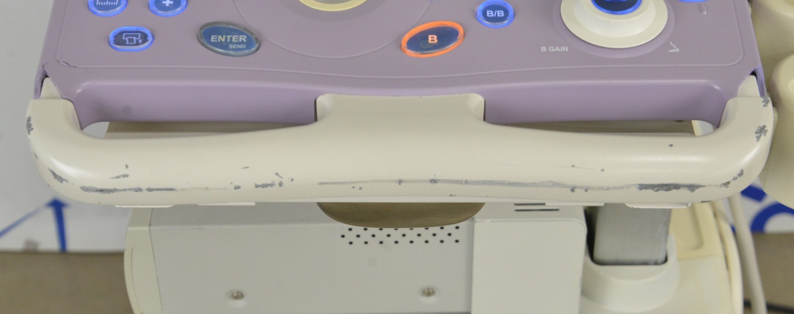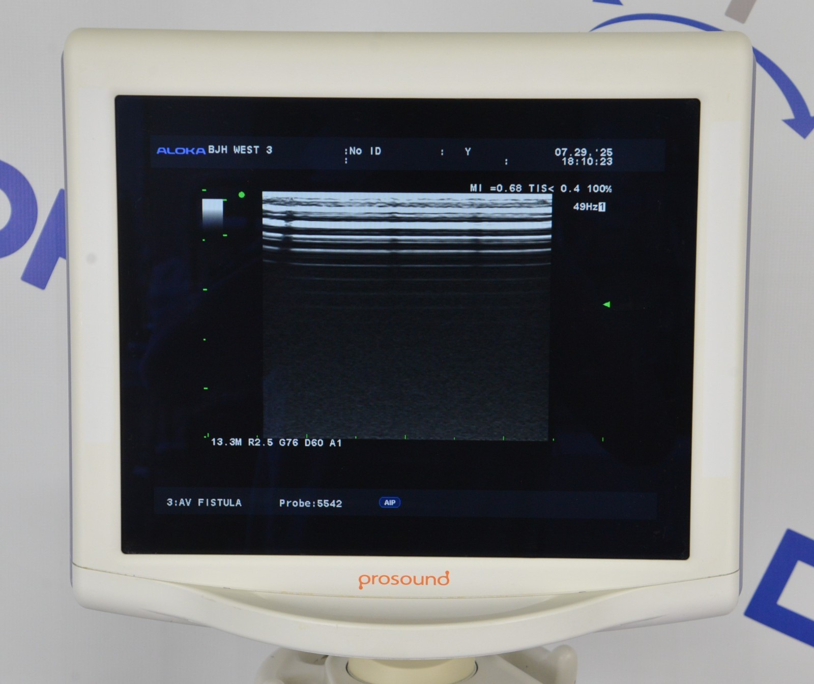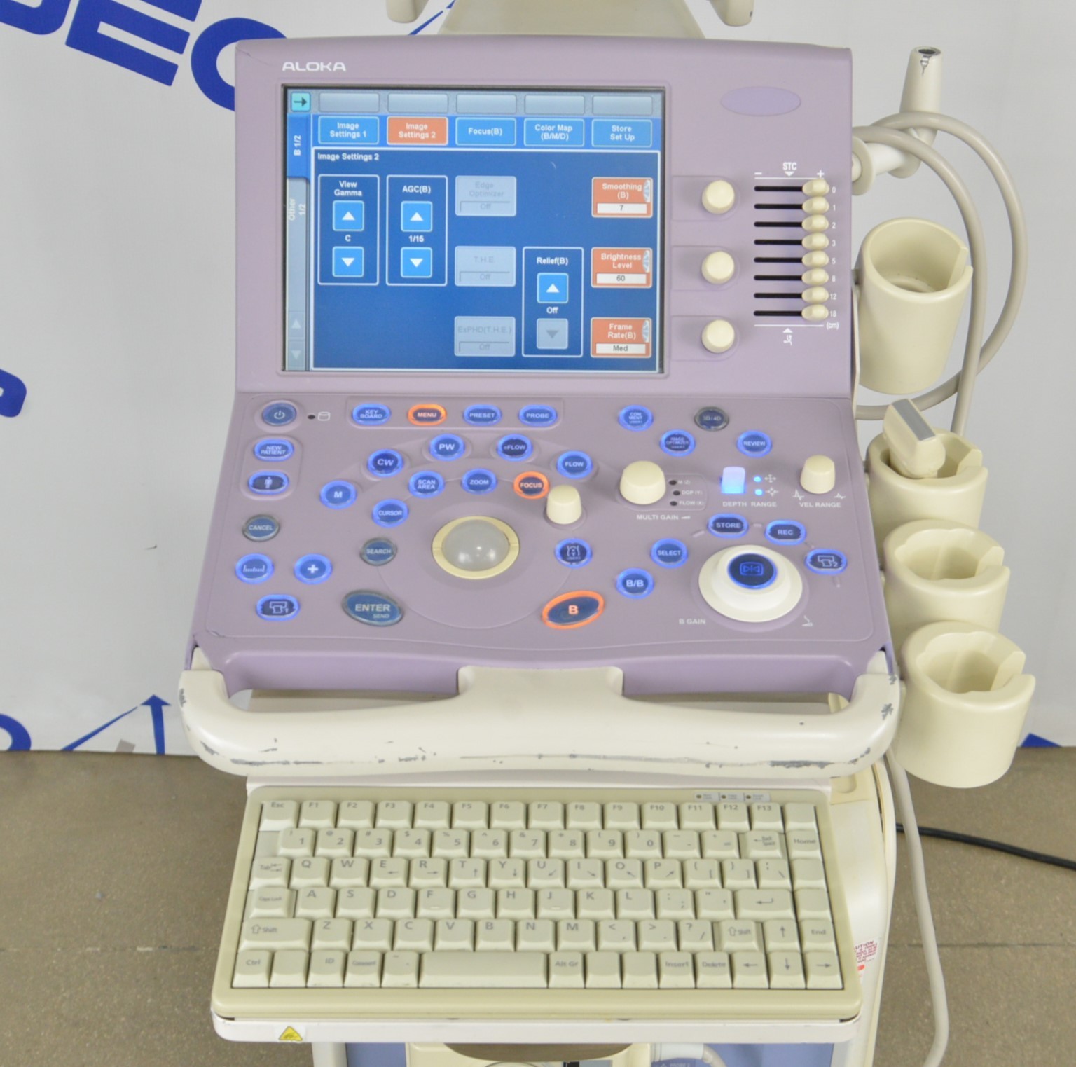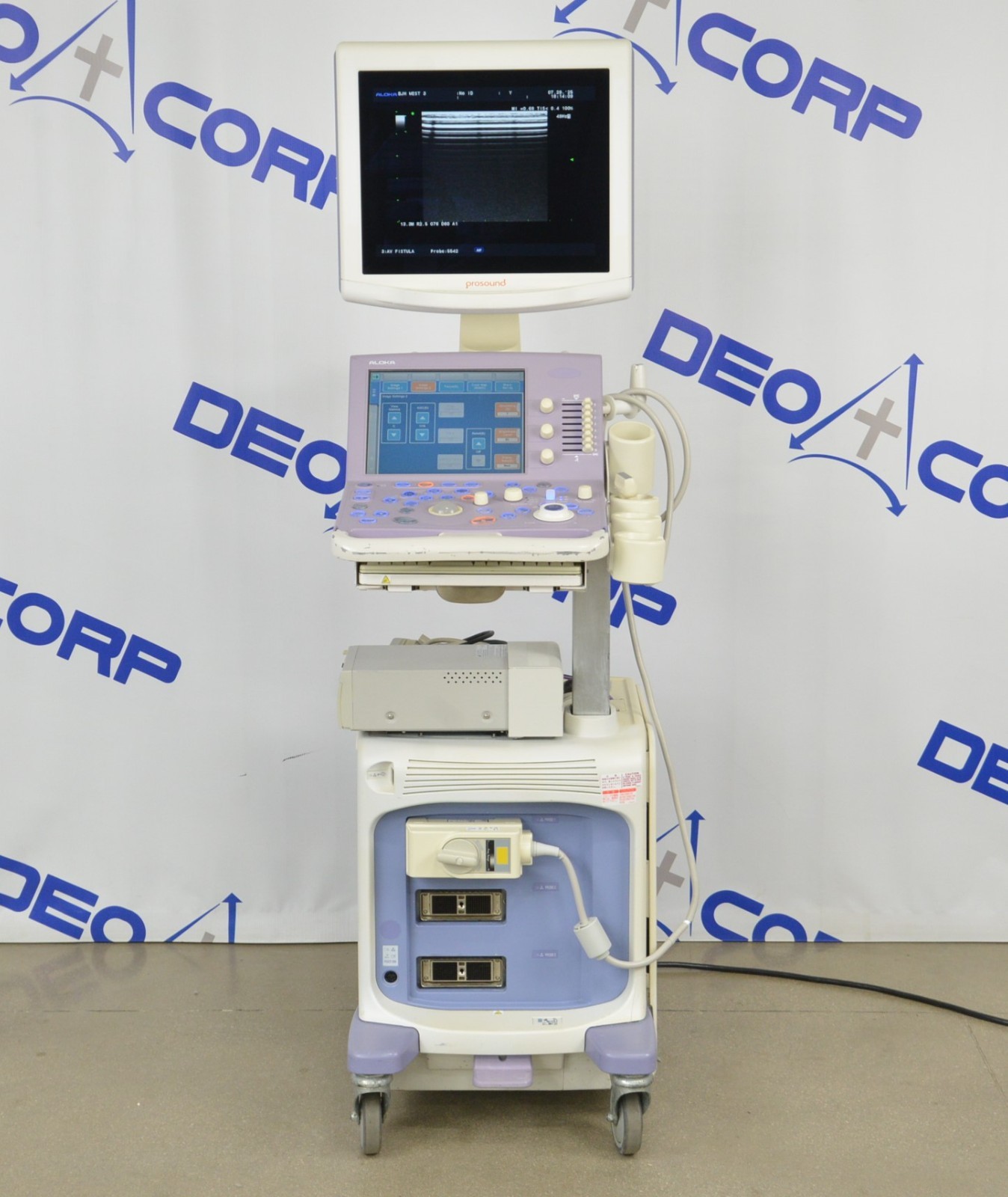 This Aloka Prosound Alpha 6 Imaging System W/ Aloka UST-5542 Handpiece is in good working condition. The unit powers on properly and responds to selections. The display screen produces a clear image. The connections are clean and in good condition. There are scuff marks, cracks, and discoloration from previous use (see photos). The left side panel is missing. The handpiece appears to have dropout and the cable jacket is torn; however, nothing is exposed. This unit comes with a 30 day money back guarantee. Includes everything in the pictures and nothing else.