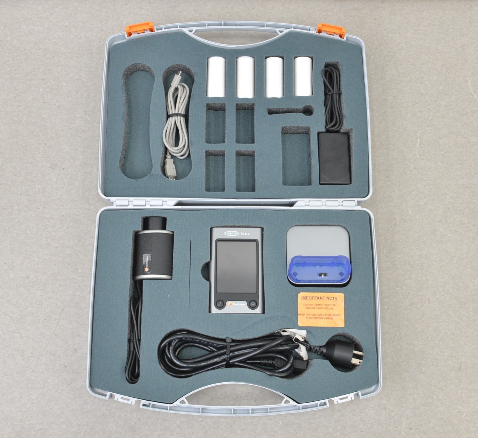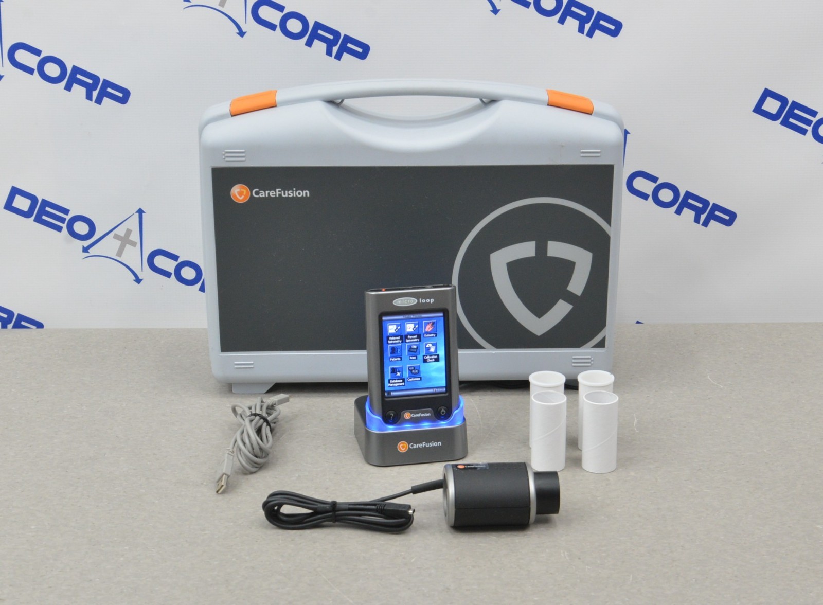 This CareFusion Micro Loop Portable Spirometer 2010 is in excellent working condition. The unit powers on properly. The display screen produces a clear image and responds properly to all selections. The connection points are clean and in excellent condition. There are some scuff marks on the case (see photos). This unit comes with a 30 day satisfaction guarantee. Includes everything in the pictures and nothing else.