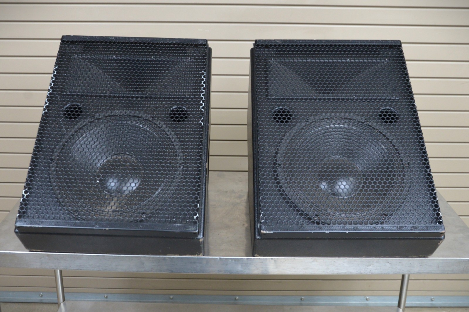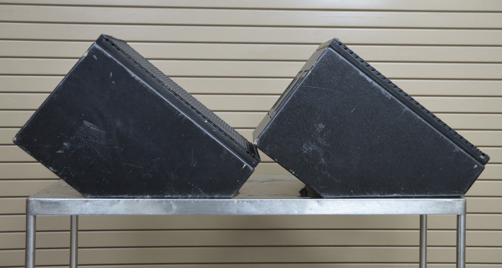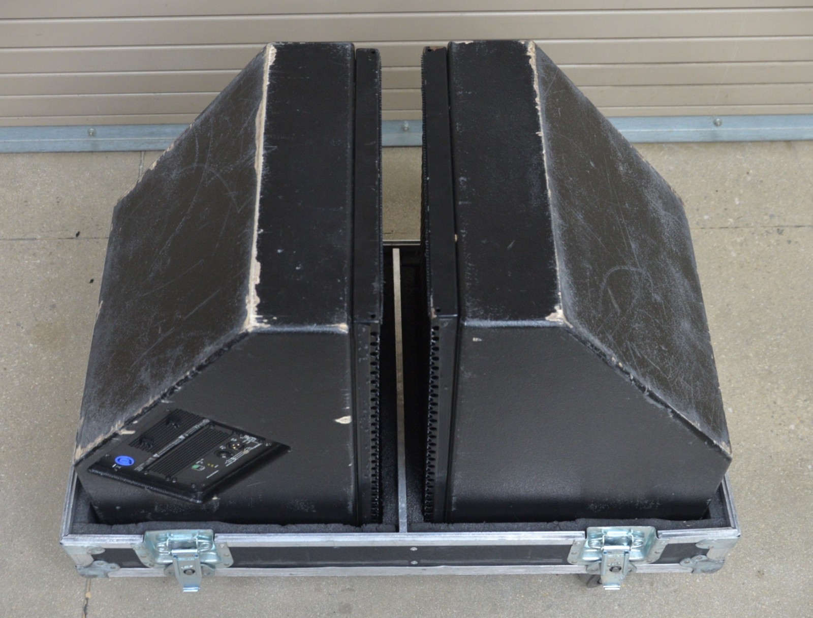 This Case Of 2 Meyer Sound UM-100P Wide Coverage Active Stage Monitor is in good working condition. This system powers on properly. This system produces a loud, high quality, high power output, flat amplitude and phase responses, offering full-range bandwidth and impressive impulse response. This system in an active speaker type with a built in two-channel amplifier. This system uses a PowerCon three-pole AC power cable (power cable is not included) 100-240V 50-60hz. There is damage to the case and scuff marks from previous use (see photos). This unit comes with a 30 day satisfaction guarantee. Includes everything displayed in the photos and nothing else.