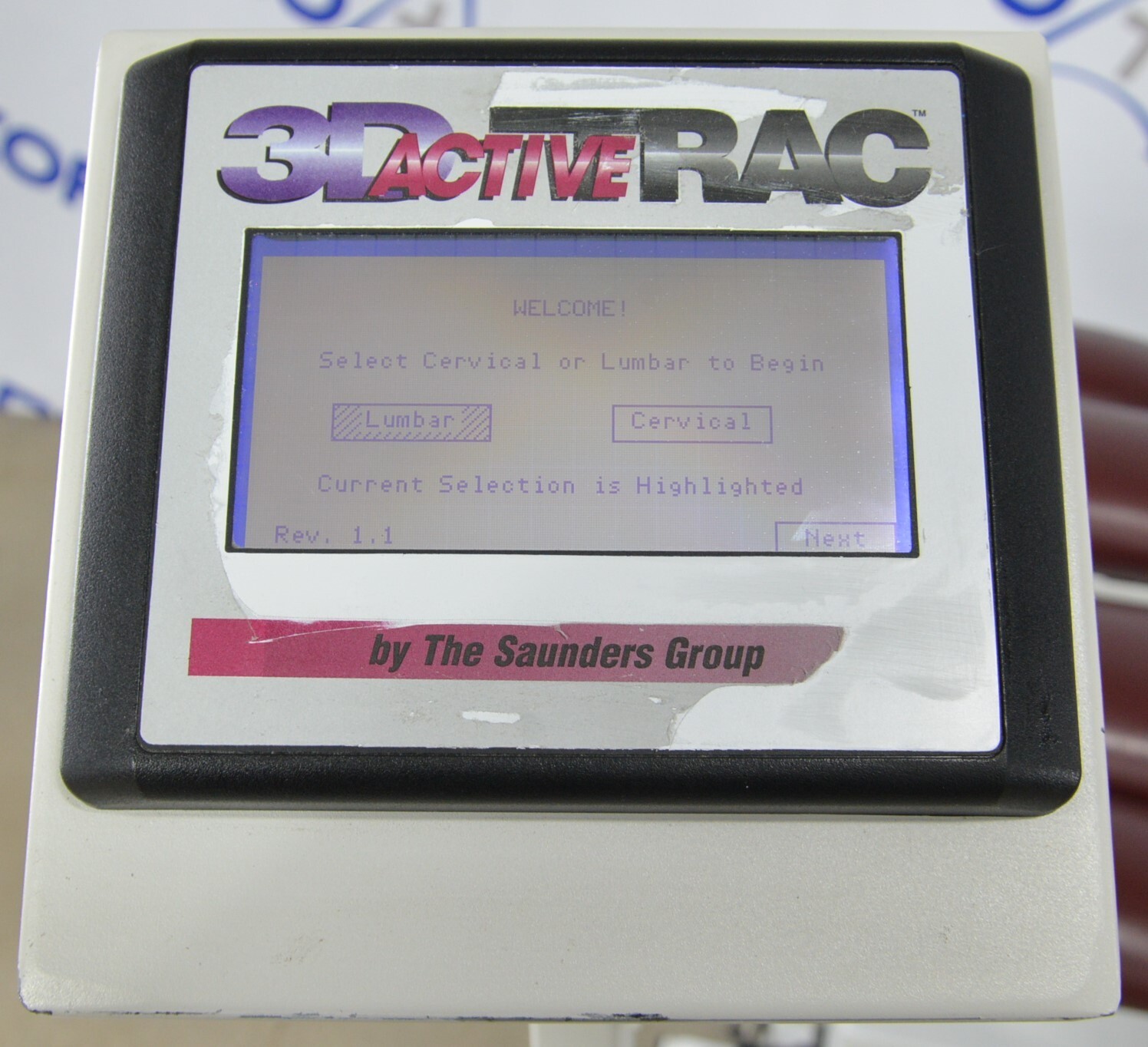 This Chattanooga 3D-Active Trac 73000A Chiropractic Traction Exam Table is in fair cosmetic condition. The unit powers on and moves up and down properly. All manual adjustments function properly. The screen displays a clear image. The control box will continually default back to the home screen after making a selection. The bracket for the rear left wheel is broken off and the rear right wheel is missing, for these reasons its being sold for parts. Does not include hand remote. There are some scuff marks from previous use (see photos). Includes everything in the pictures and nothing else.