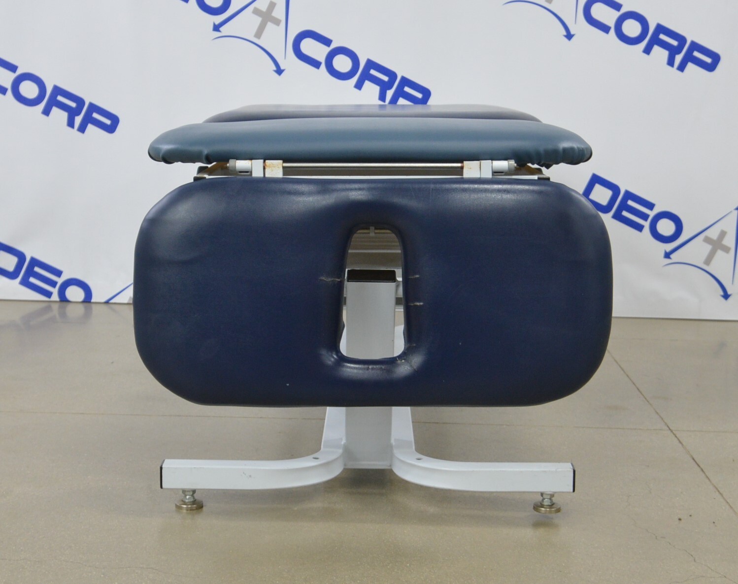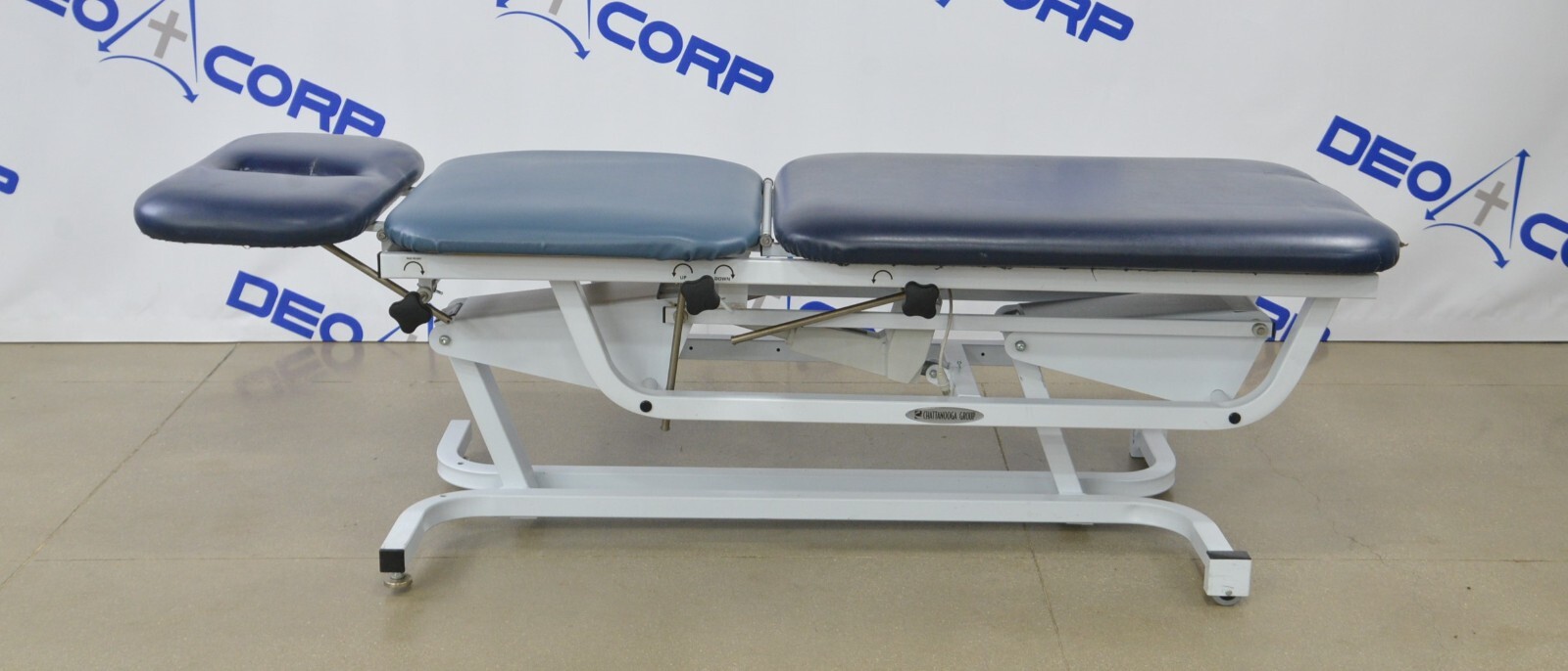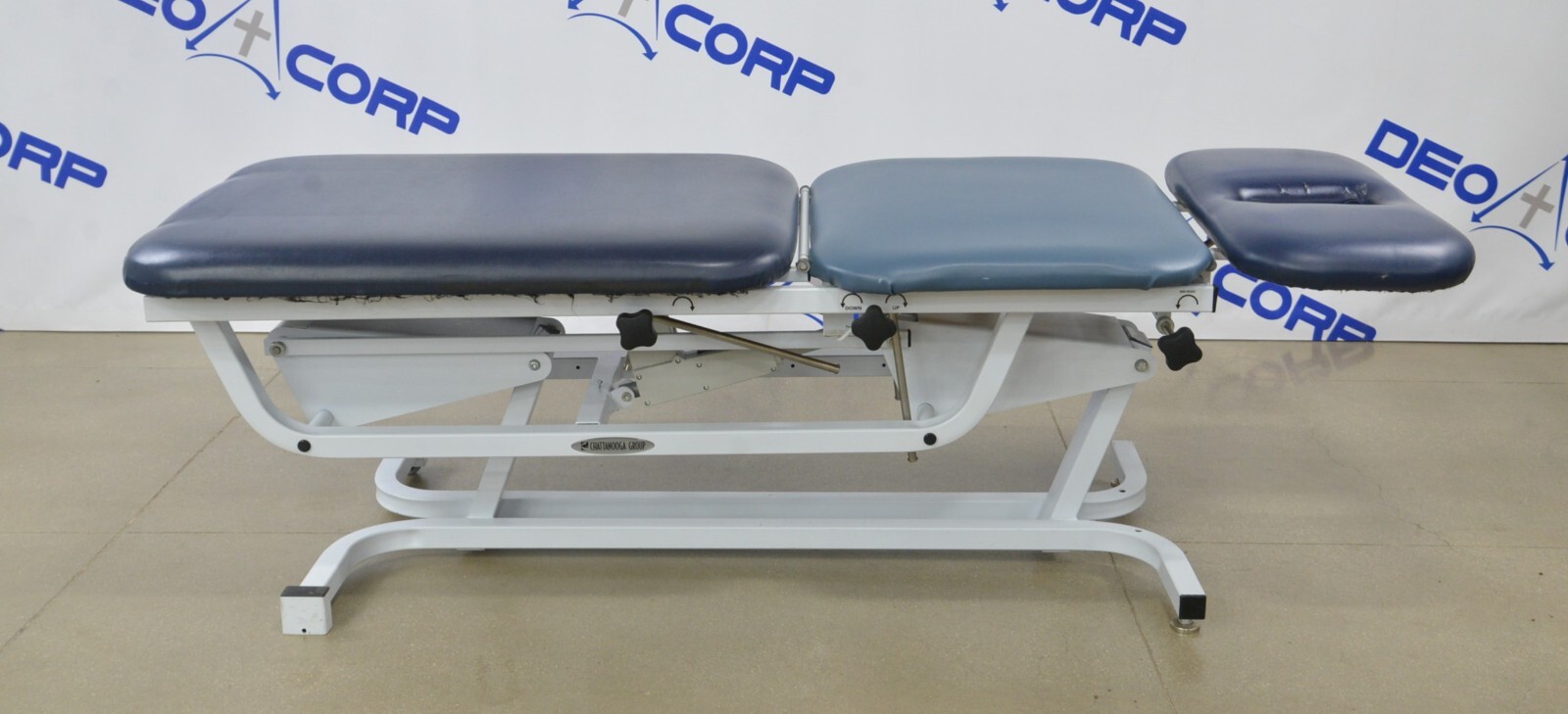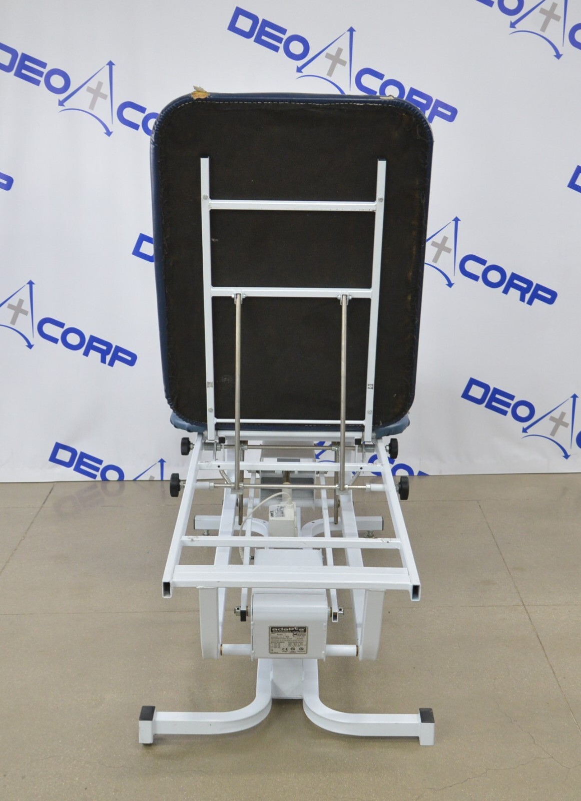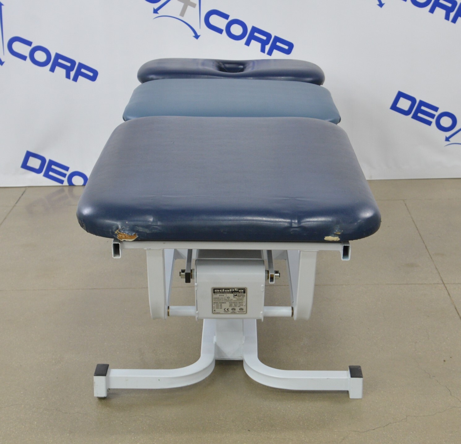 This Chattanooga Adapta ADP-300 Treatment Table is in fair cosmetic condition. The manual adjustments work properly. Some parts of the upholstery have been repaired. The unit’s actuator and power supply are no longer working causing the table not power on and rise/lower, for this reason, its being sold for parts. One of the wheels are missing. There are some scuff marks, tears and indents in the upholstery from previous use (see photos). Includes everything in the pictures and nothing else.