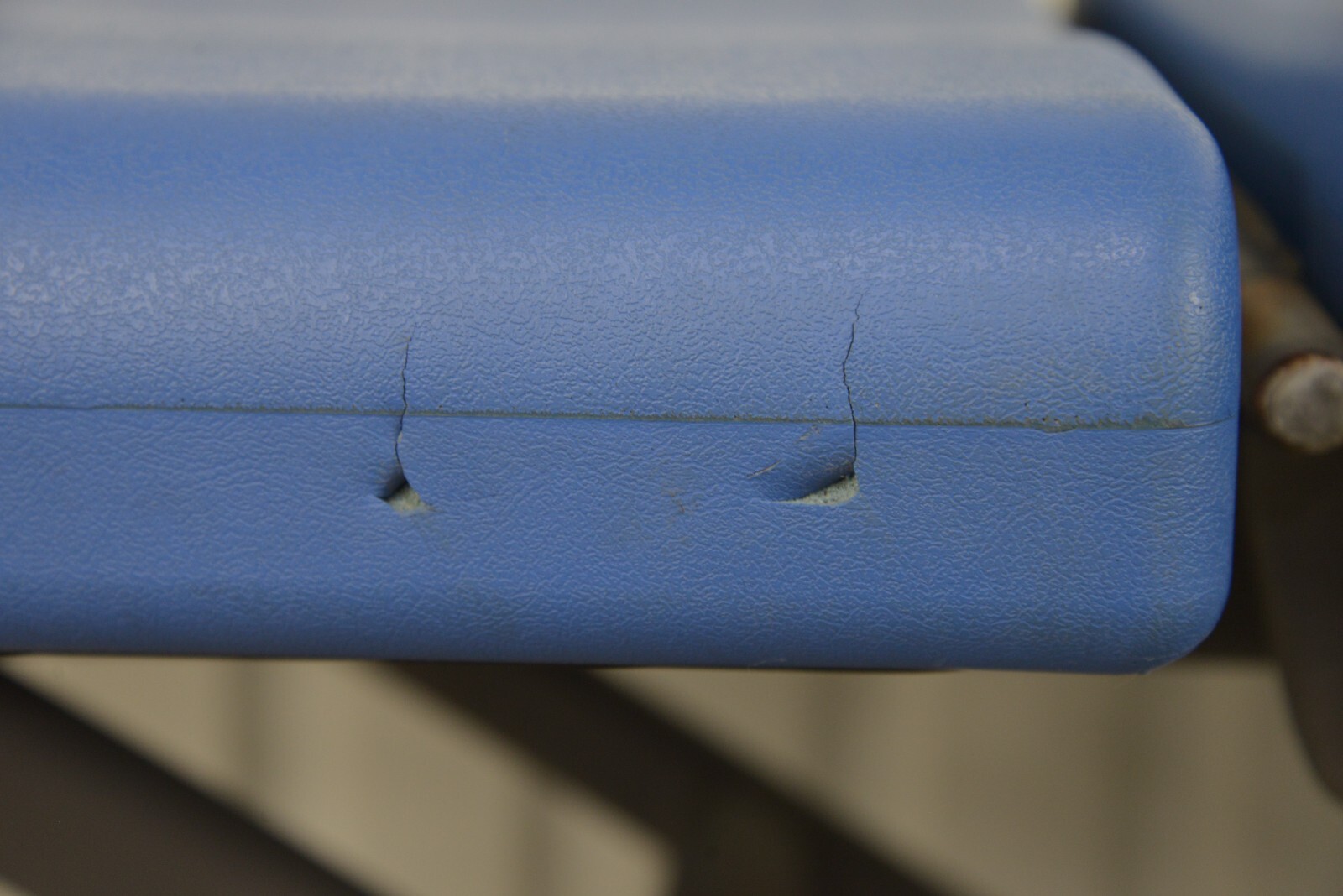 This Chattanooga Adapta Summit 7 3321 Physical Therapy Table is in good working condition. The table raises and lowers smoothly. Each section adjusts properly. This table is missing the foot pedals on the back and some of the covers to the foot pedals. The overall cosmetic condition is good with the exception of small punctures in the upholstery and some discoloration from previous use (see photos). This unit comes with a 30 day money back guarantee. Includes everything in the pictures and nothing else.