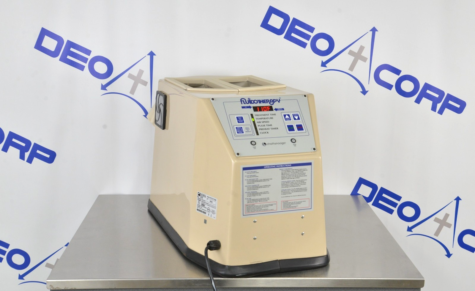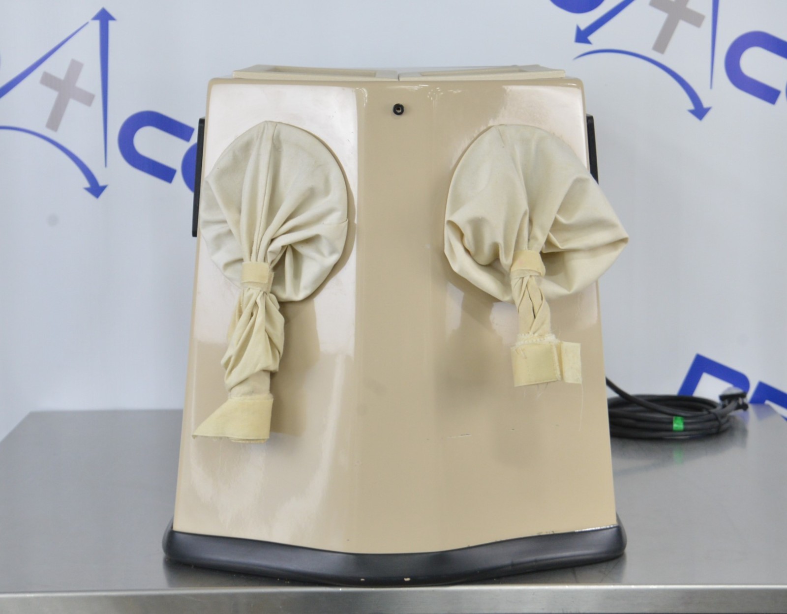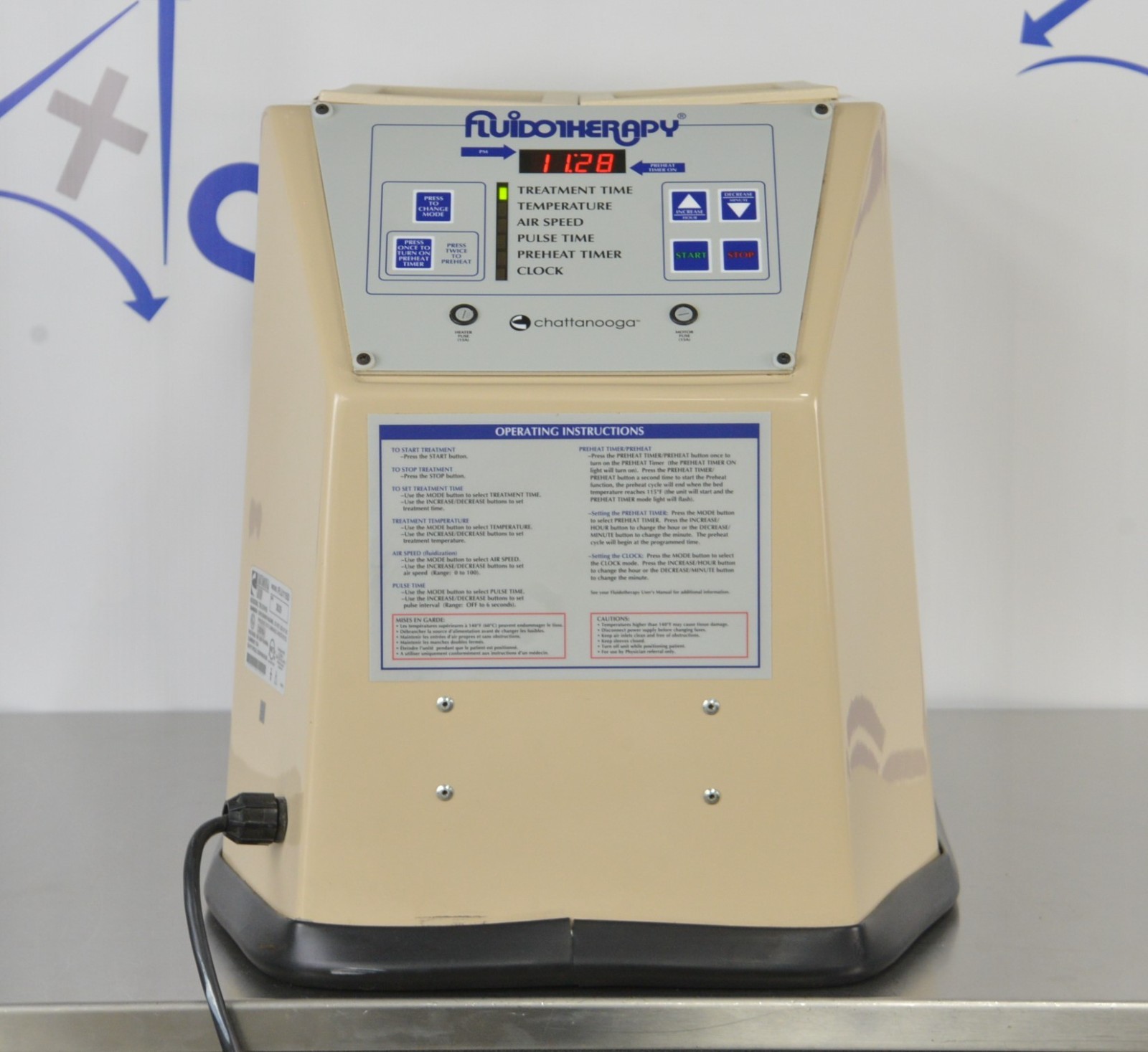 This Chattanooga FLU115D Fluidotherapy Double Extremity Dry Heat Therapy Unit is in great working condition. This unit powers on and heats up properly. All buttons respond properly to selection. There are some scuff marks from previous use (see photos). There is a small crack in the plastic frame on top and the Velcro on the back needs to be resewn. This unit does not have the base. This unit comes with a 30 day money back guarantee. Includes everything in the pictures and nothing else.