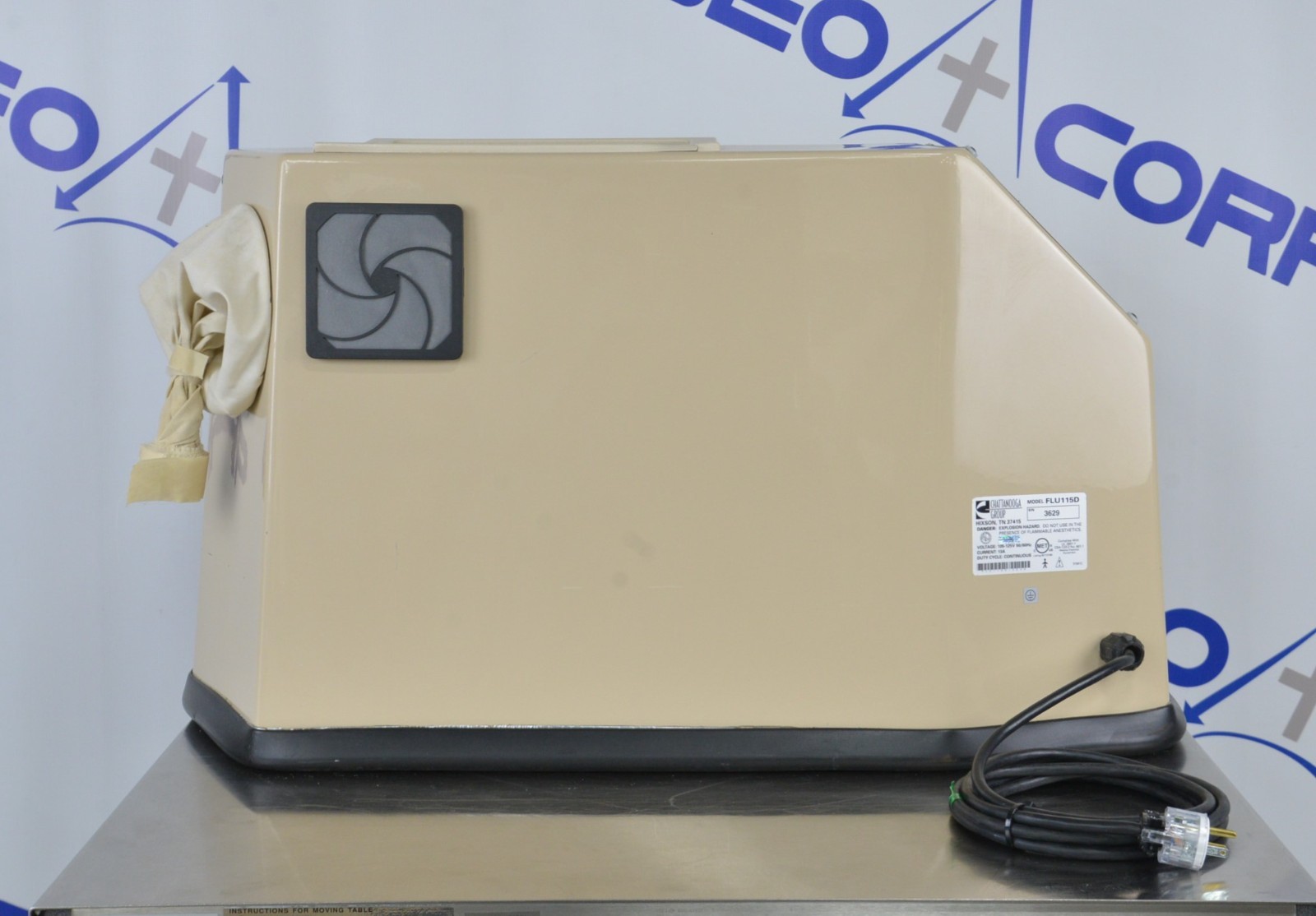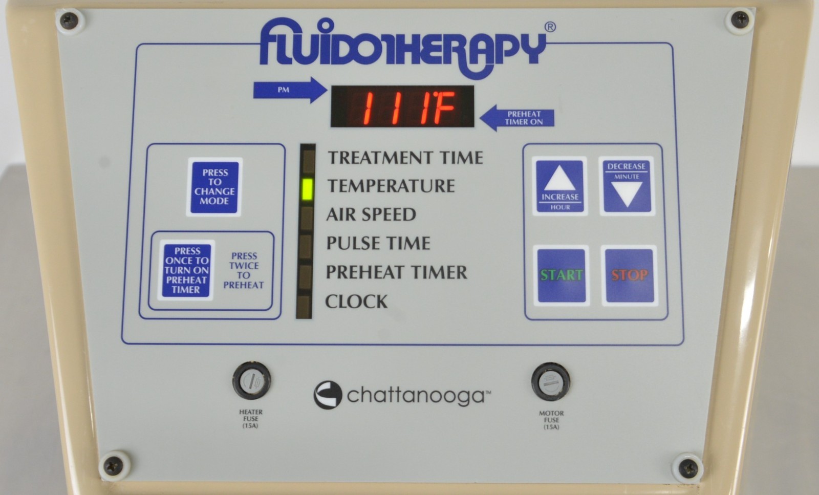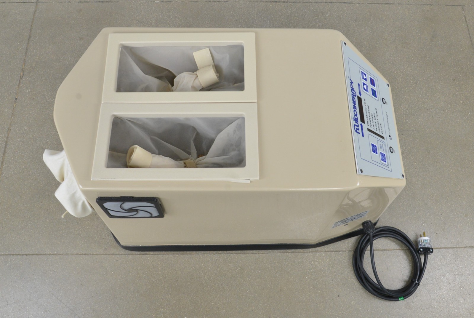 This Chattanooga FLU115D Fluidotherapy Double Extremity Dry Heat Therapy Unit is in great working condition. This unit powers on and heats up properly. All buttons respond properly to selection. There are some scuff marks from previous use (see photos). There is a small crack in the plastic frame on top and the Velcro on the back needs to be resewn. This unit does not have the base. This unit comes with a 30 day money back guarantee. Includes everything in the pictures and nothing else.
