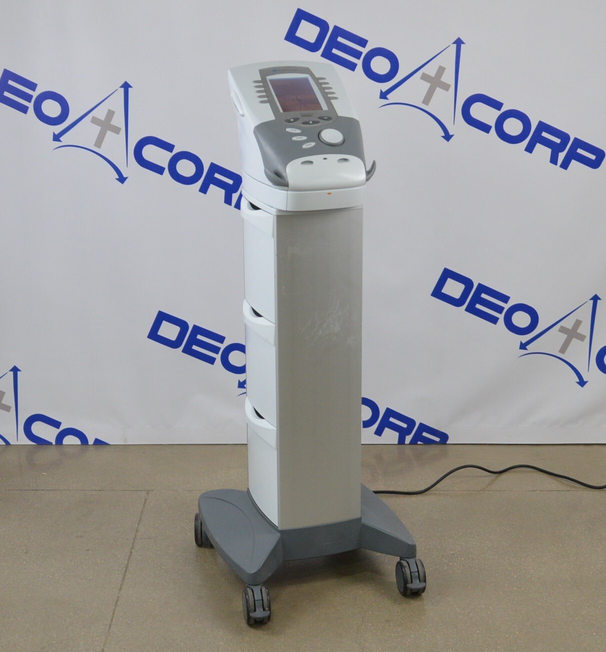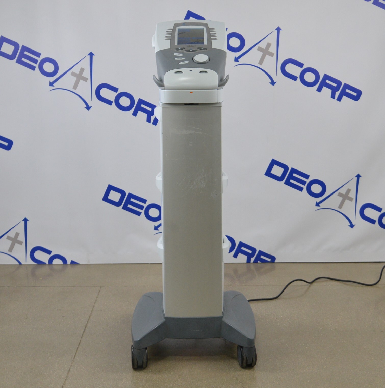 This Chattanooga Intelect Legend XT 2763 Unit 4-Channel W/ Module 2781 & Rolling Cart is in good working condition. The unit powers on and the buttons respond to selections. The screen produces a clear image. All connection points are in good condition. There is a drawer missing on one side of the cart and another drawer is cracked. There are some scuff marks from previous use (see photos). This unit comes with a 30 day satisfaction guarantee. Includes everything in the pictures and nothing else.