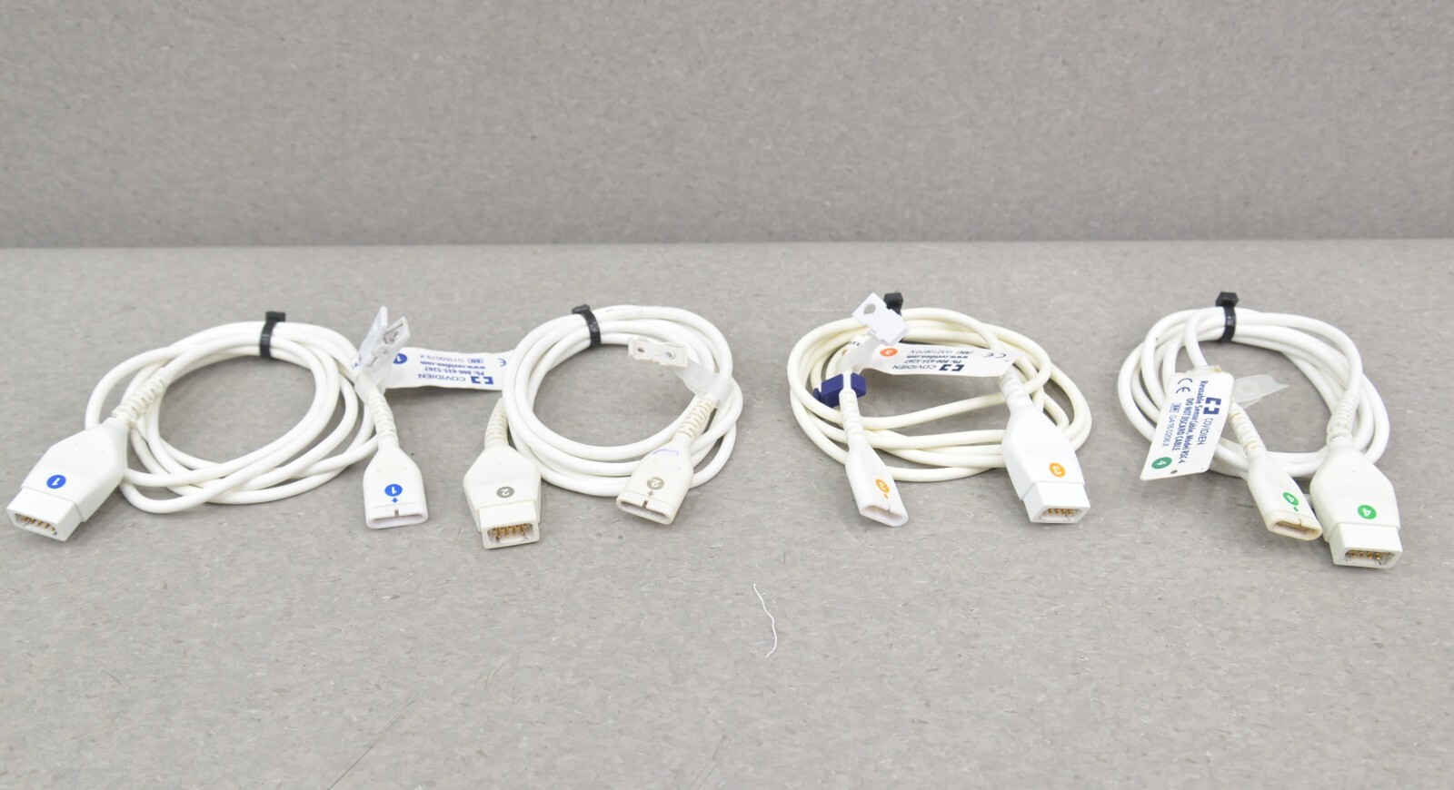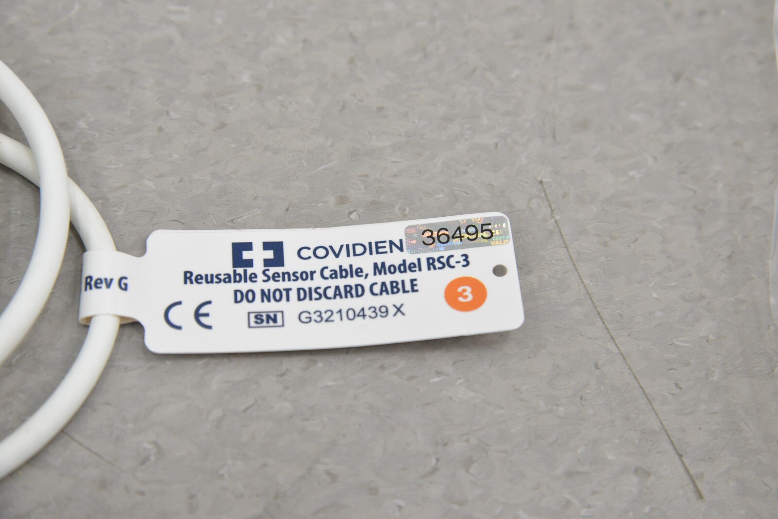 The COVIDIEN Reusable Sensor Cable is in good condition. The RSC-3 model has two cables that have a DOM 2017 & 2020, but the rest are DOM 2021. There is some minor discoloration and some of the cable jackets have minor tears (see photos). Each cable is sold separately and comes with a 30 day satisfaction guarantee.
