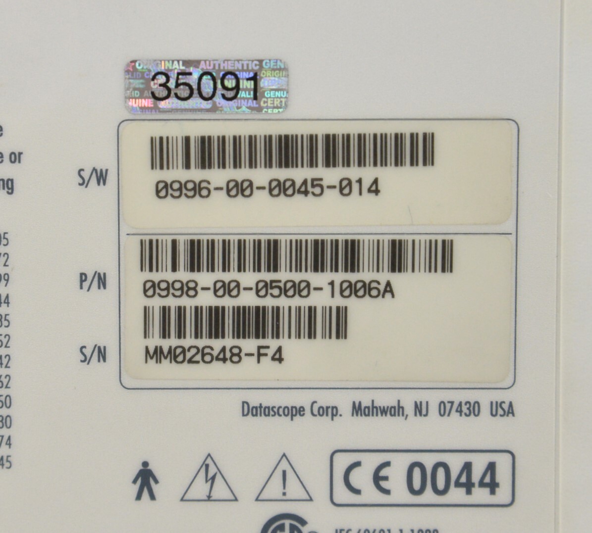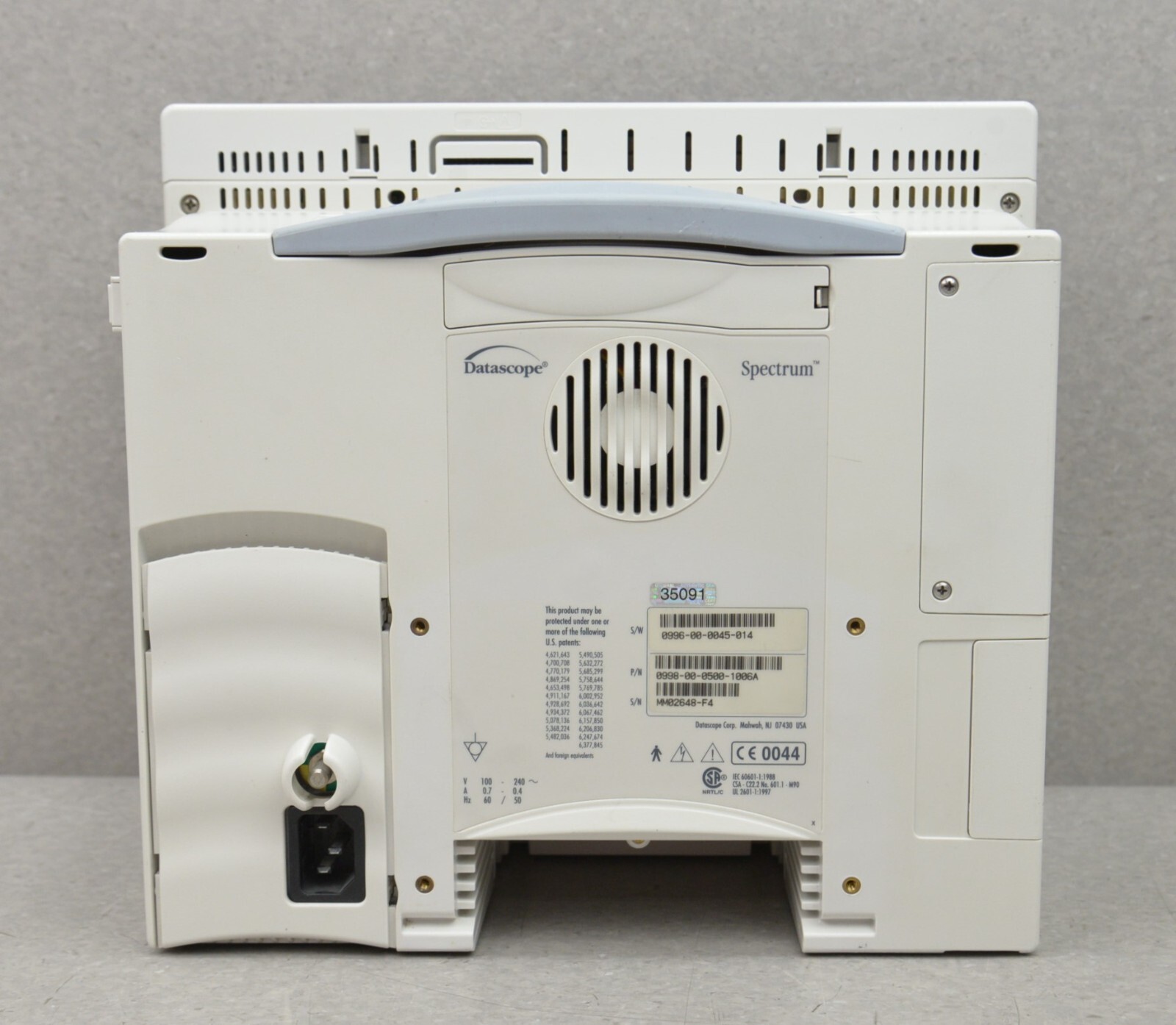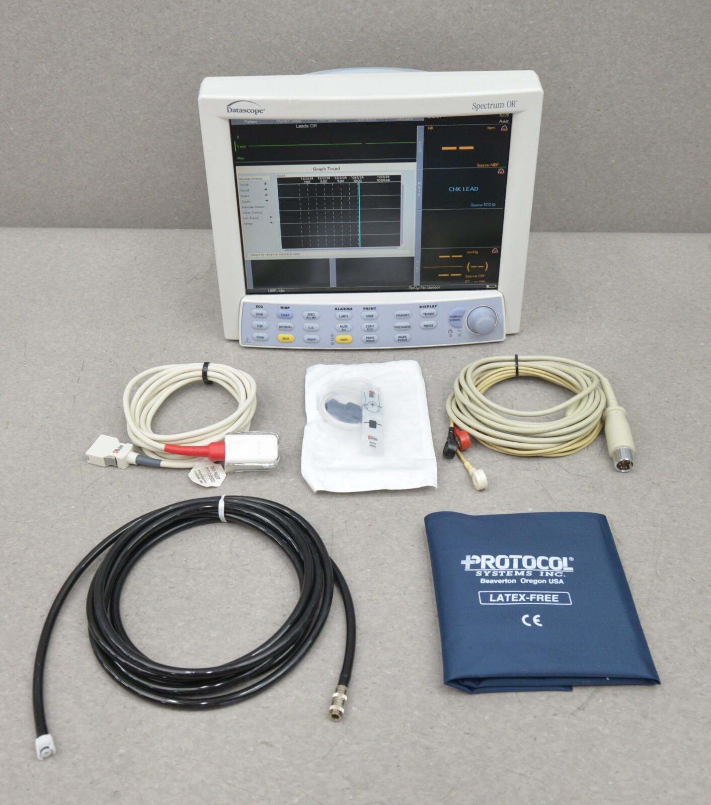 This Datascope Spectrum OR 0998-00-0500-1006A W/ Masimo, NiBP, Temp & 3-Lead is in great working condition. The unit powers on properly. The display screen has a clear image and responds properly to selection. The connection points are clean and in good condition. The battery holds a charge. There are minor scuff marks from previous use (see photos). This unit comes with a 30 day satisfaction guarantee. Includes everything in the pictures and nothing else.