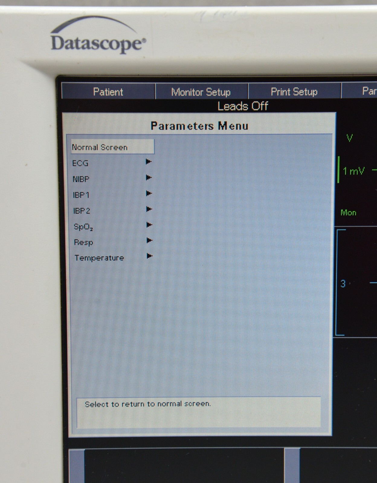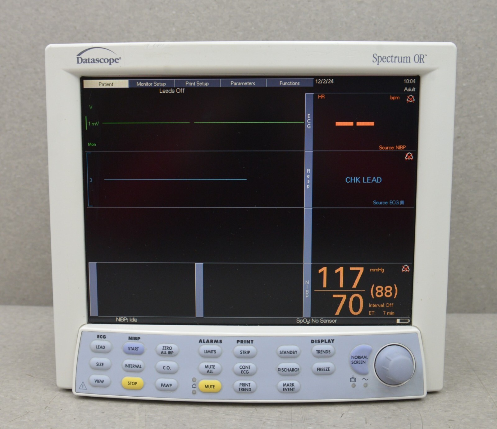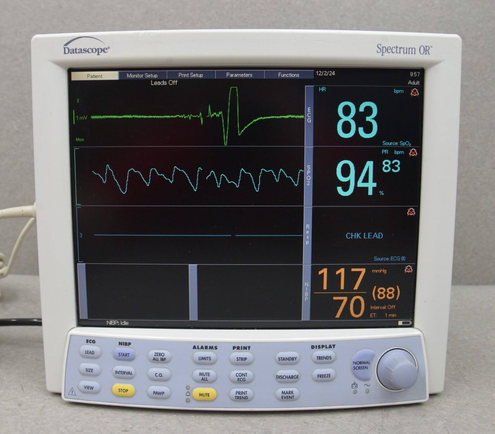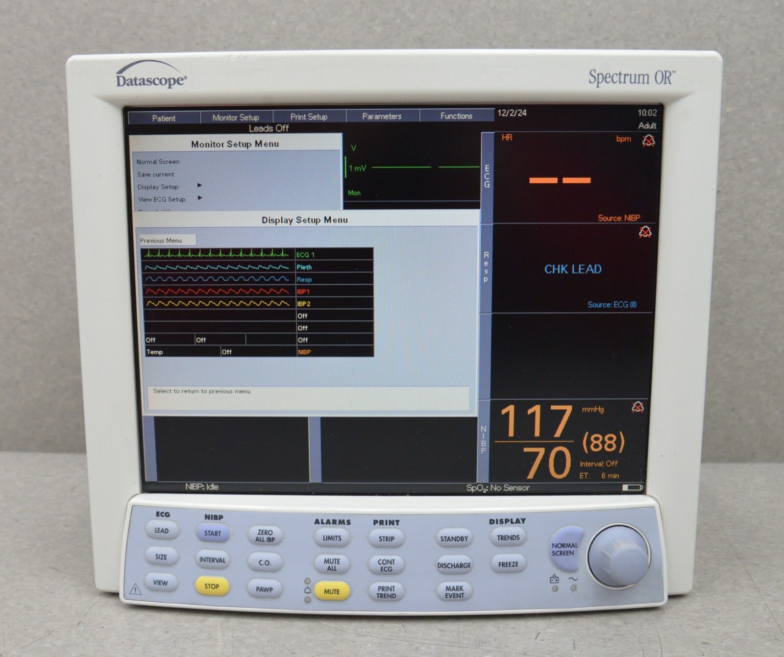 This Datascope Spectrum OR 0998-00-0500-1006A W/ Masimo, NiBP, Temp & 3-Lead is in great working condition. The unit powers on properly. The display screen has a clear image and responds properly to selection. The connection points are clean and in good condition. The battery holds a charge. There are minor scuff marks from previous use (see photos). This unit comes with a 30 day satisfaction guarantee. Includes everything in the pictures and nothing else.