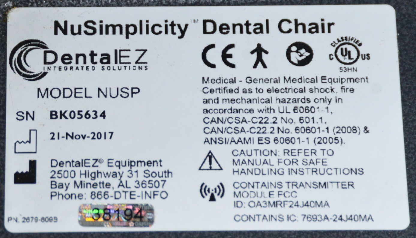 DentalEZ NUSP NuSimplicity Dental Chair W/ Radius Delivery Unit & Mount Light