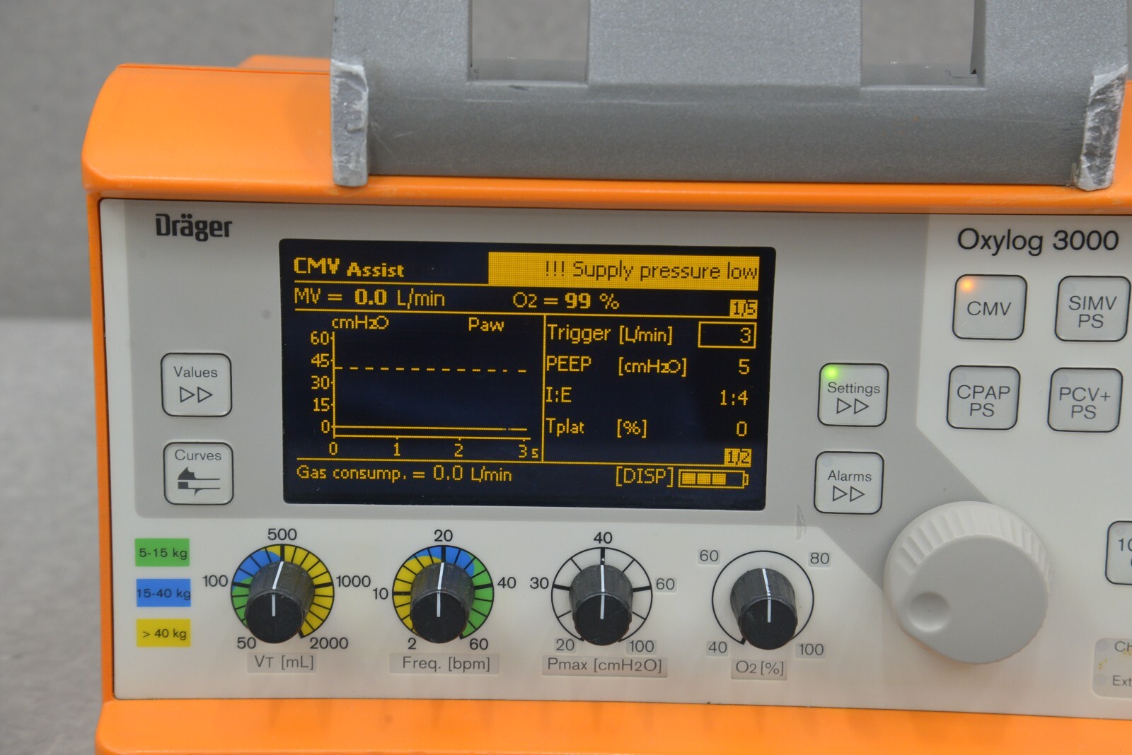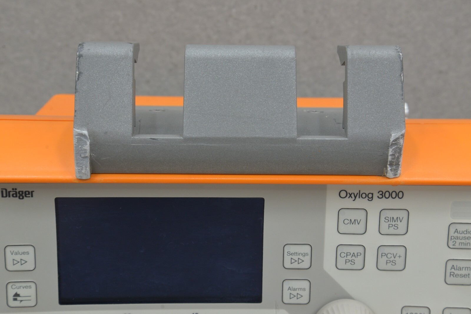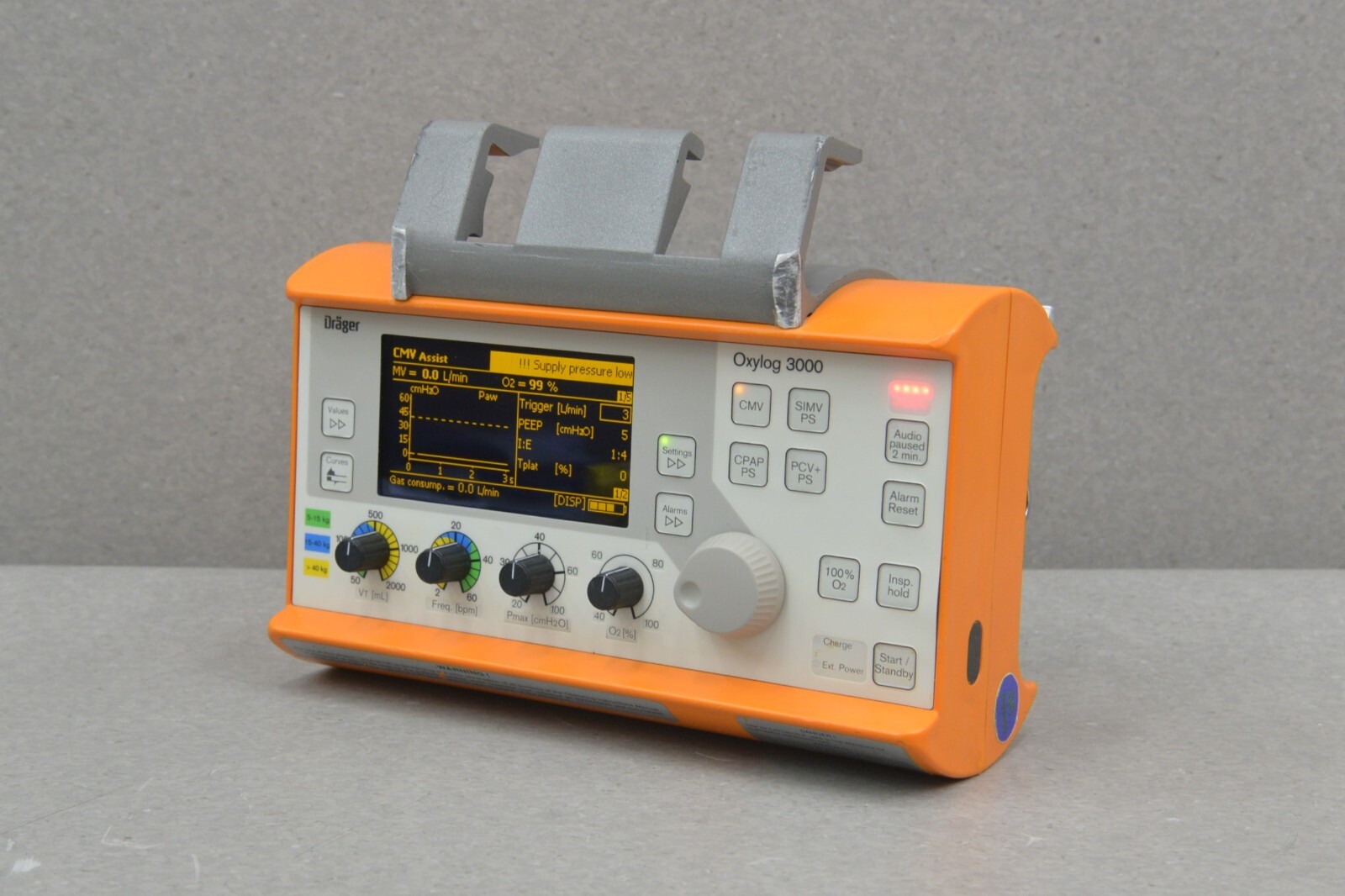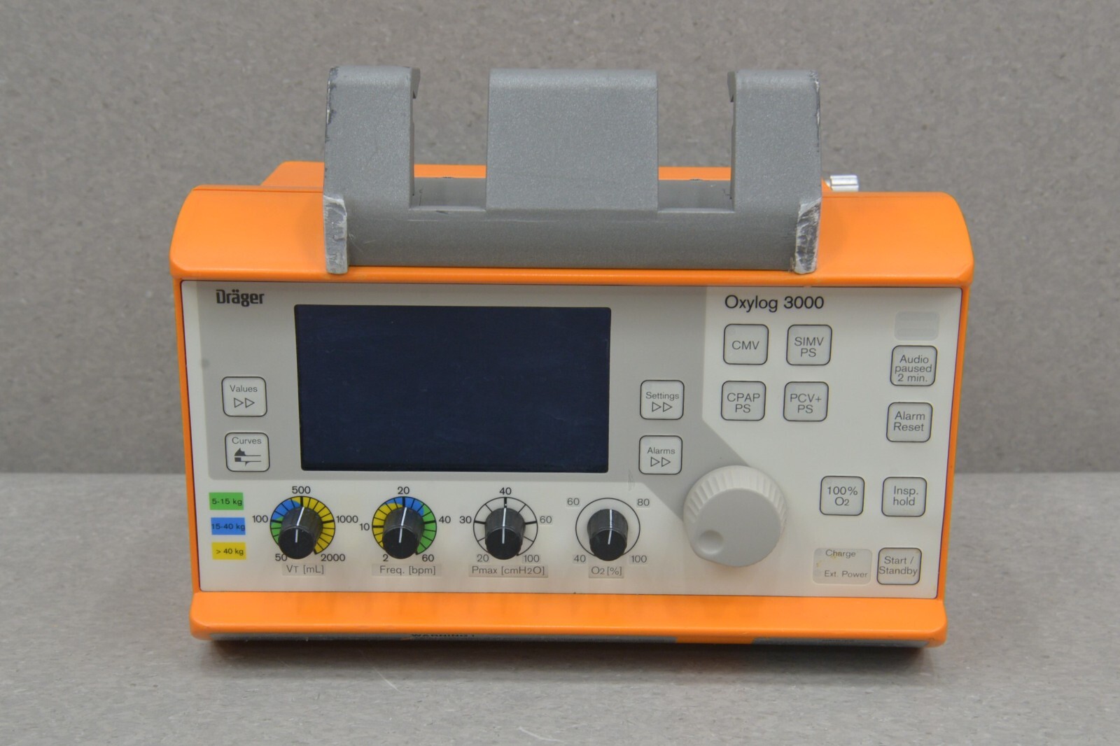 This Drager Oxylog 3000 Emergency Transport 2M86965-03 is in good working condition. The unit powers on properly. The buttons and knobs respond appropriately to selections. All connection points are clean and in good condition. This unit uses a Rechargeable Smart Battery Pack Li-Ion Battery which is brand new and included. There is no power supply included. There are minor scuffs and scratches common with previous use and the handle is broken off (see photos). The working hours are 675. This system comes with a 30 day money back guarantee. Includes everything in the pictures and nothing else.