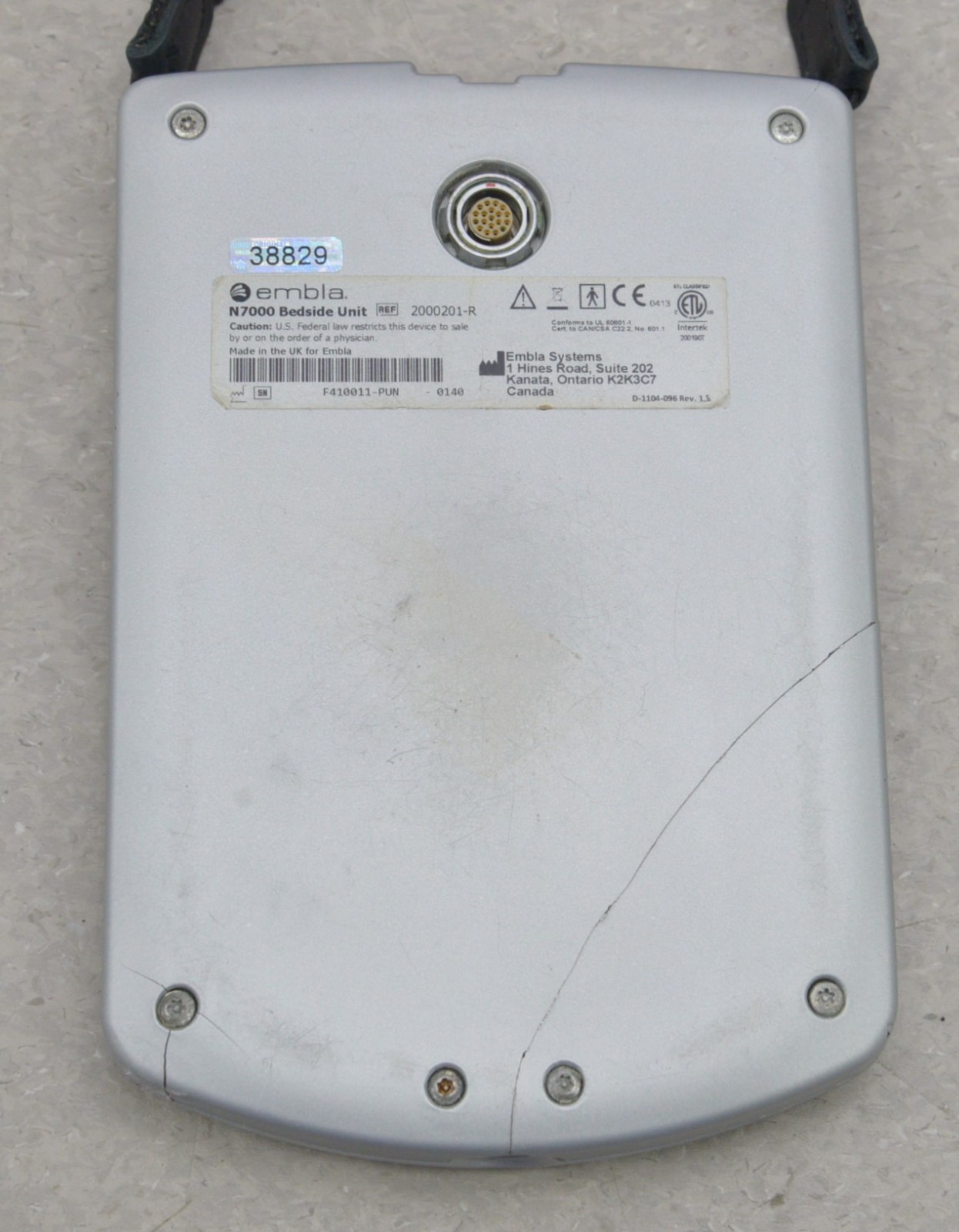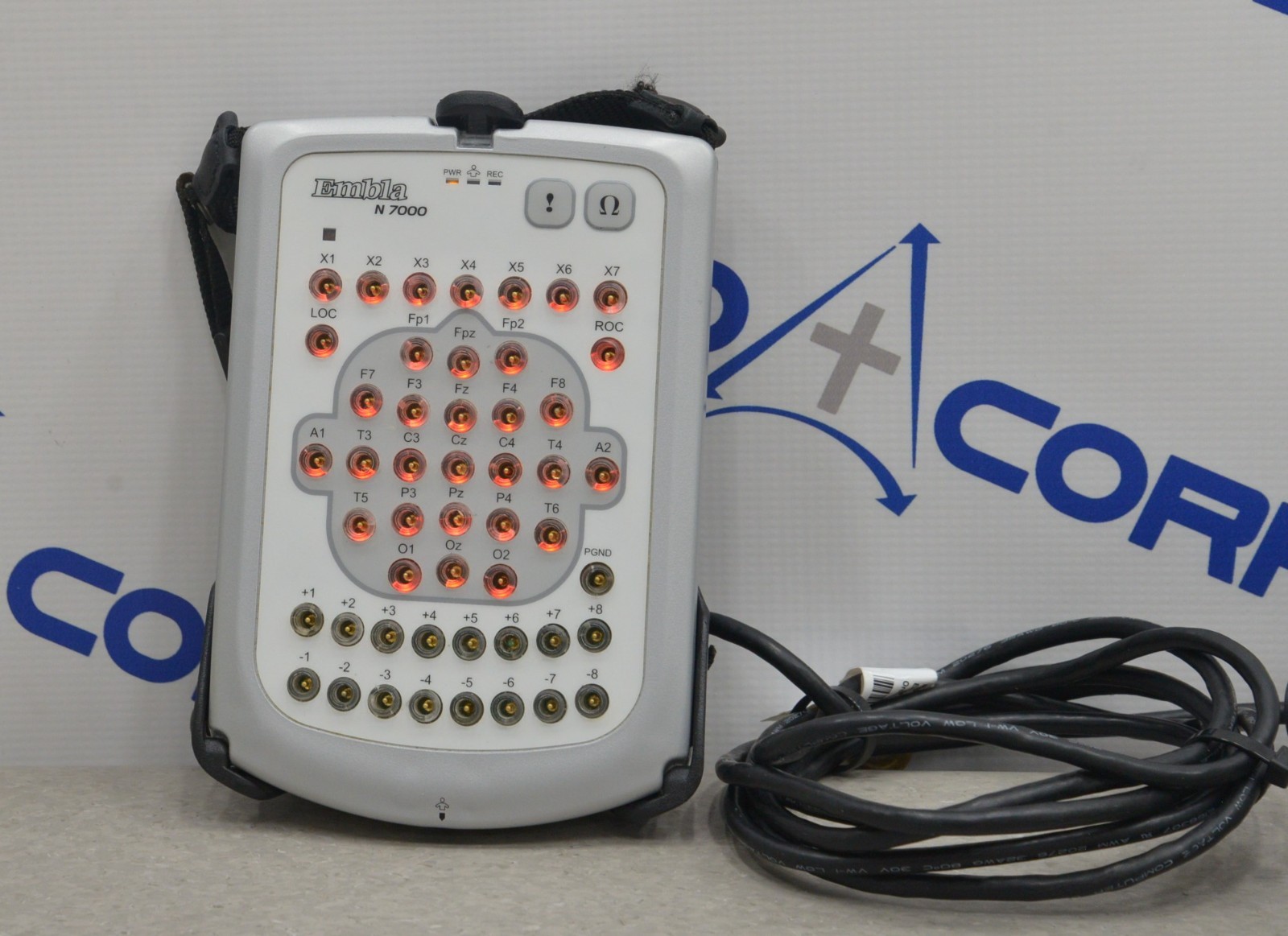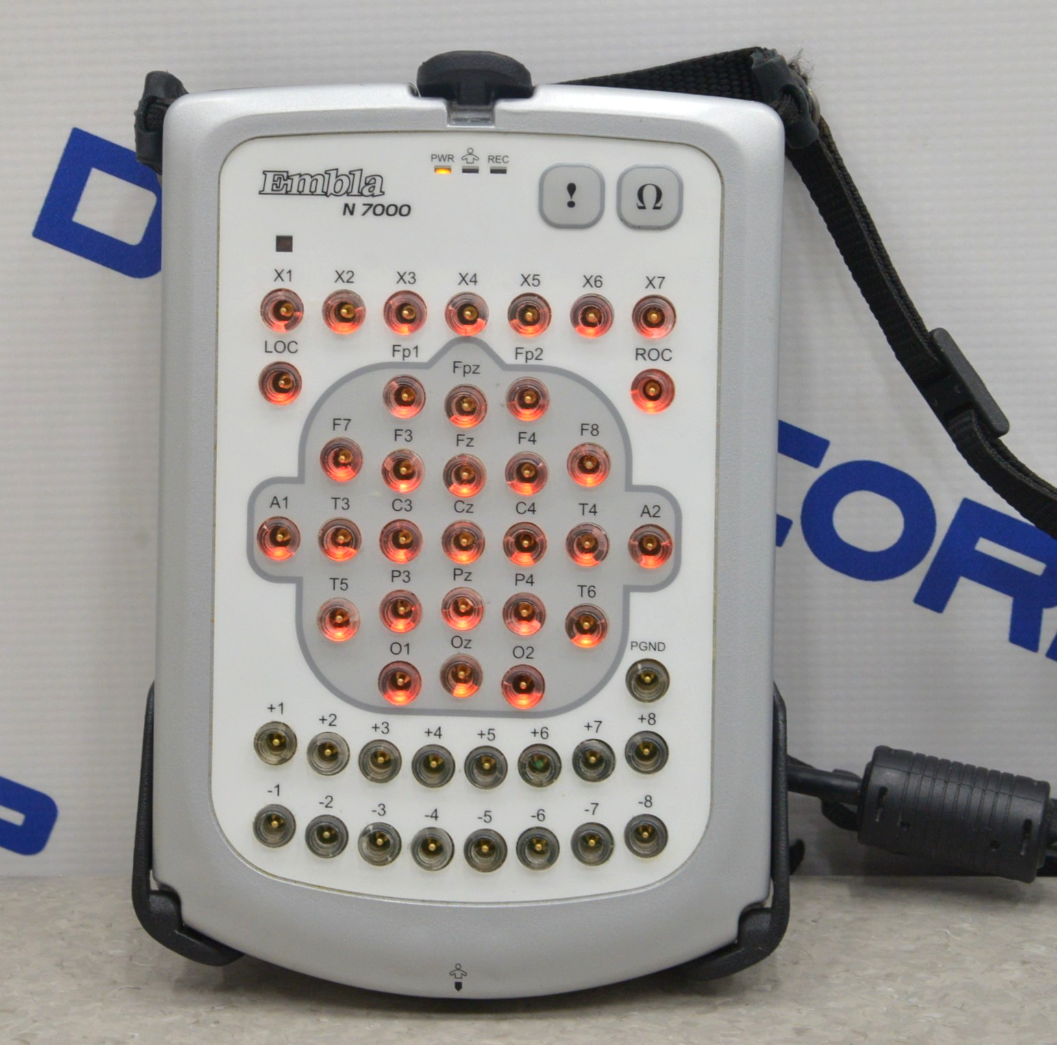 This Embla N7000 PSG System Bedside Unit is in good working condition. The connection points are clean and in good condition. This unit is being powered by a separate unit that is not included. There are some scuff marks, discoloration, and cracks on the back from previous use (see photos). This unit comes with a 30 day satisfaction guarantee. Includes everything in the pictures and nothing else.