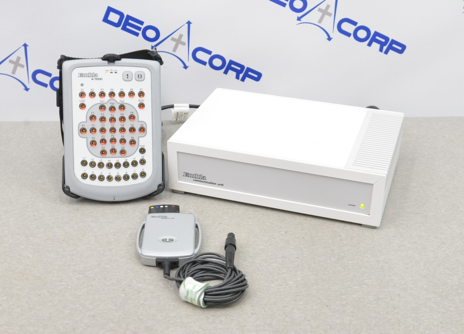 This Embla N7000 PSG System W/ Communication & Patient Unit powers on and came from a working environment. The connection points are clean and in good condition. There are some scuff marks from previous use (see photos). This unit comes with a 30 day satisfaction guarantee. Includes everything in the pictures and nothing else.