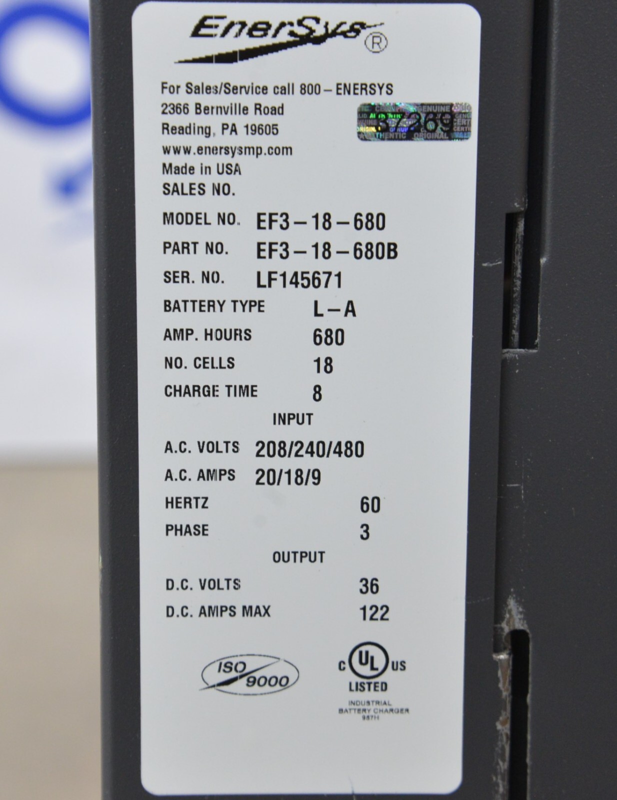EnerSys EF3-18-680 EnForcer Ferro Charger 208/240/480 Volts 20/18/9 Amps 3 PH