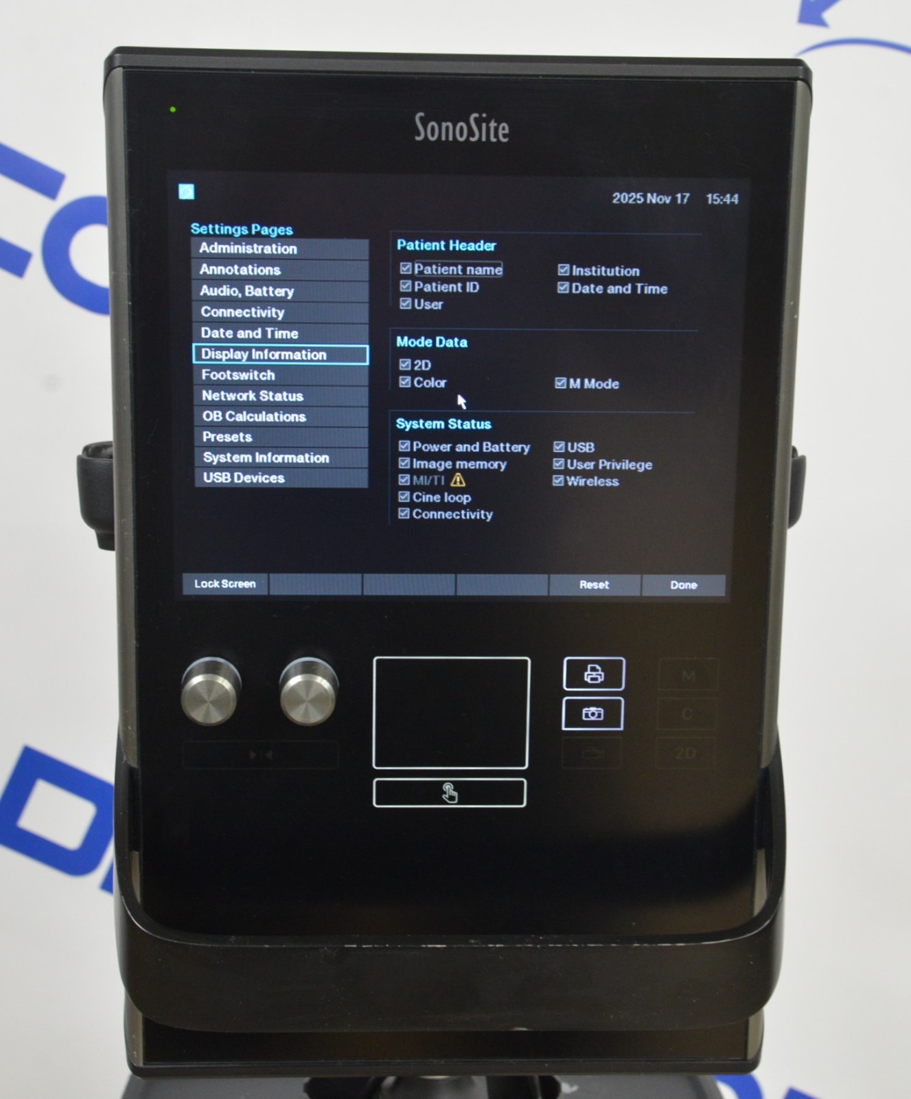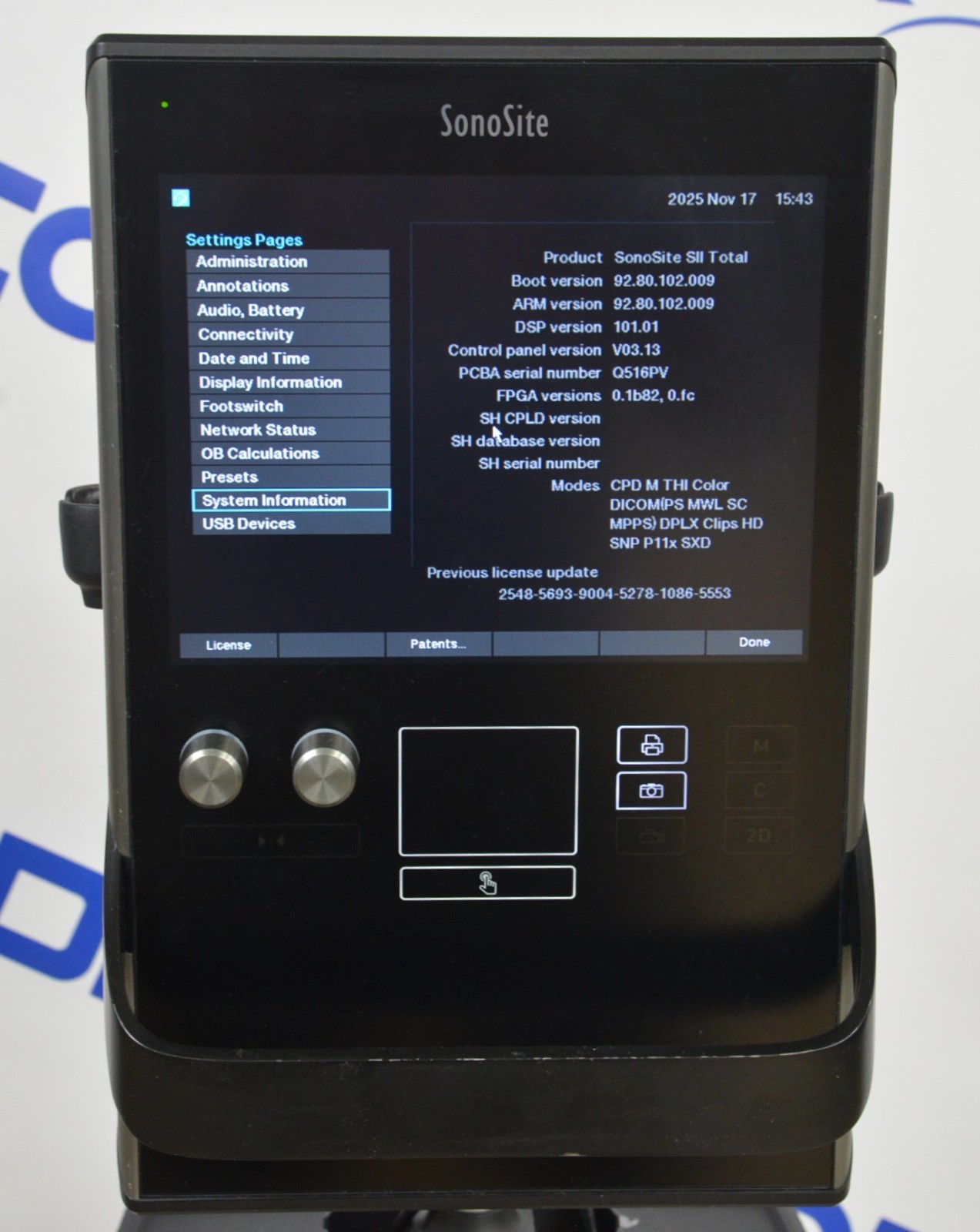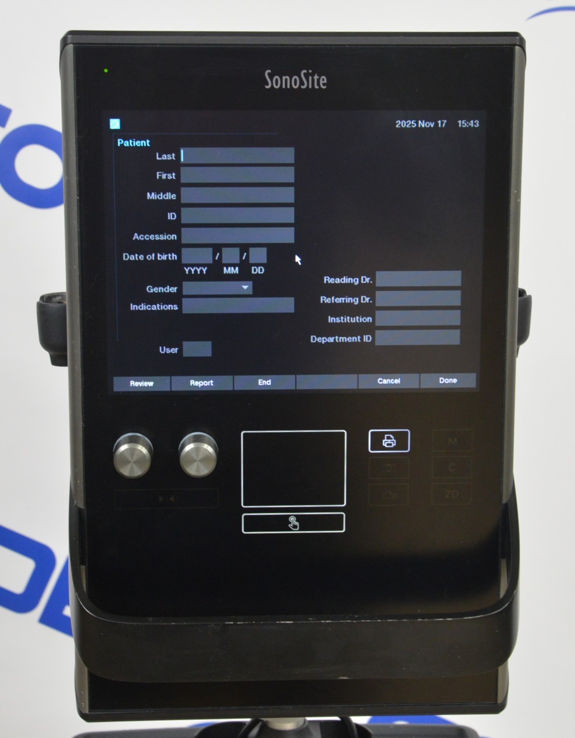 This Fujifilm Sonosite SII P20883-14 is in good cosmetic condition. The unit powers on; however, the motherboard is damaged and when a handpiece is connected the system crashes throwing up a hardware assert error, for these reasons it is being sold for parts. The connections are clean and in good condition. The screen produces a clear image. There are some minor scratches and chipped paint from previous use (see photos). Includes everything in the pictures and nothing else.