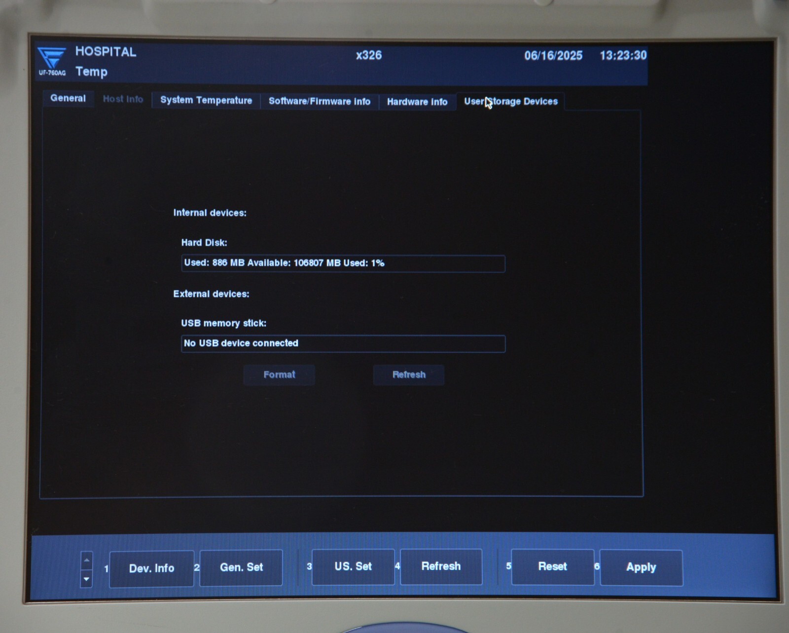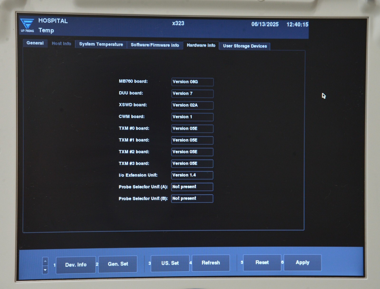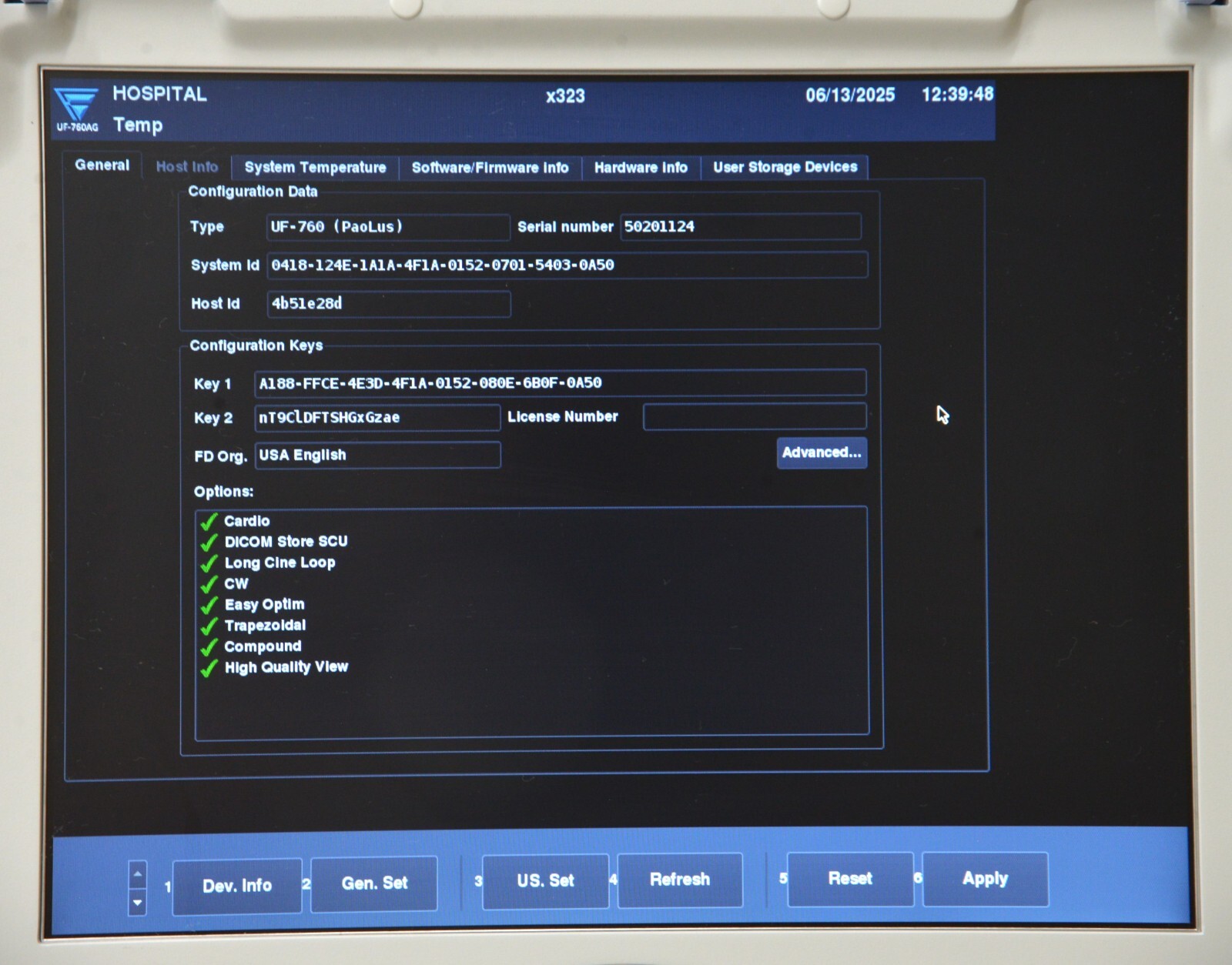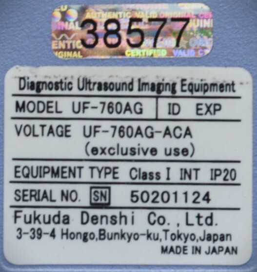 This Fukuda Denshi PaoLus UF-760AG Portable Color System With Cart is in great working condition. The unit powers on properly. The display screen produces a clear image and responds properly to selection. The battery holds a charge. There are some minor scuff marks from previous use (see photos). This unit comes with a 30 day satisfaction guarantee. Includes everything in the pictures and nothing else.