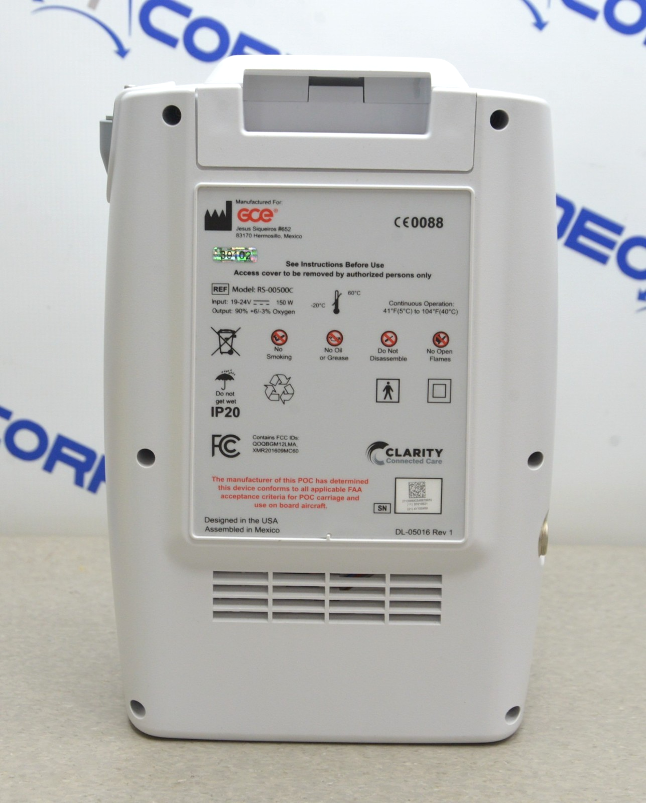 This GCE Zen-O RS-00500 Portable Air Concentrator With Charger And Accessories is in good cosmetic condition. The unit powers on and the display screen responds to selections, however, the unit is showing 09 service error and the plus button is malfunctioning, for that reason it will be sold for parts. The connections are clean and in good condition. The air flow is consistent. There are some minor scuff marks and discoloration from previous use (see photos). Includes everything in the pictures and nothing else.