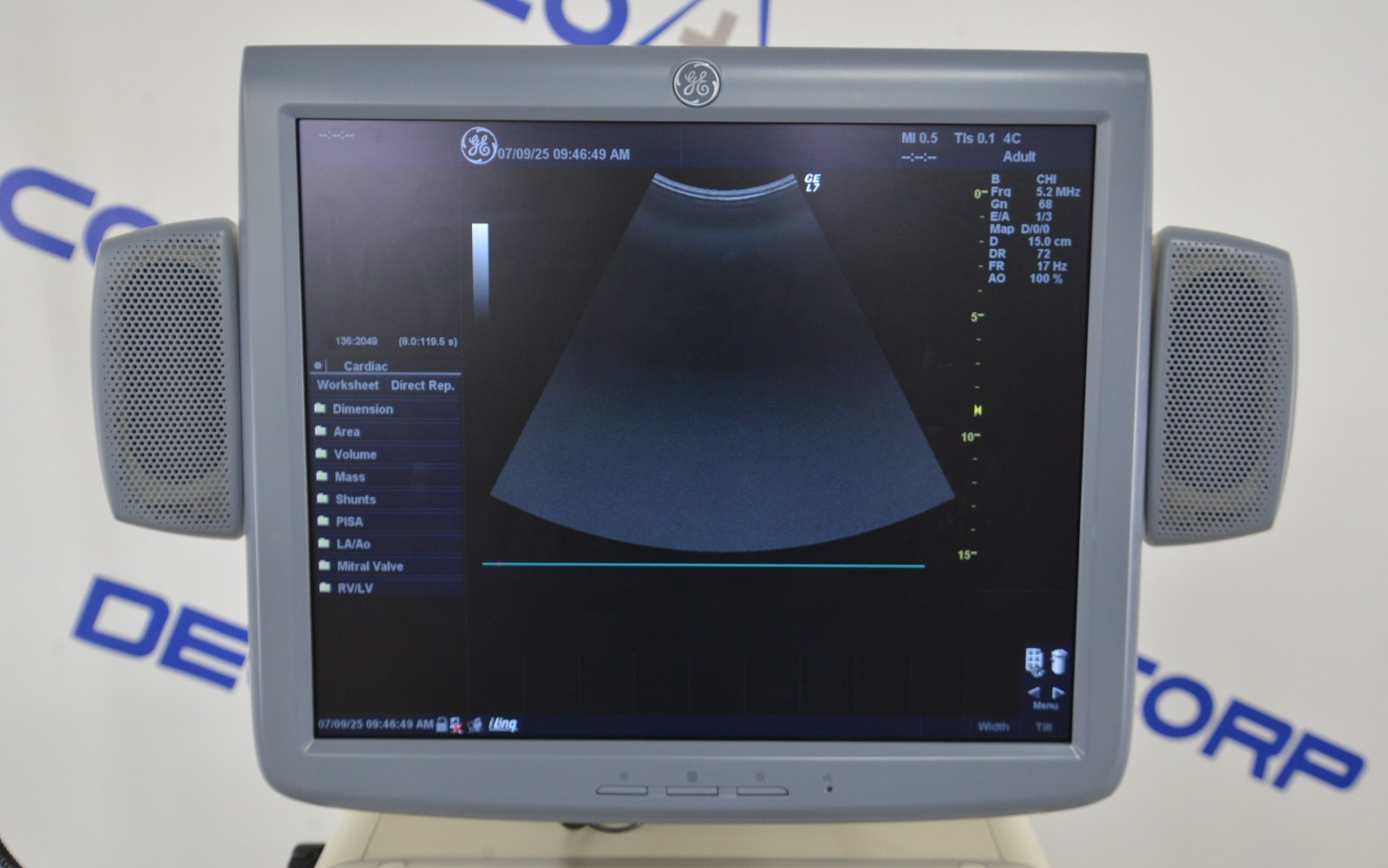 This GE Logiq 7 Imaging System 5309923 W/ GE 9L & 4C Handpieces is in great working condition. The unit powers on properly. The display screen produces a clear image and the buttons respond to selections. The connection points are clean and in good condition. The 9L handpiece appears to have dropout. There are some scuff marks from previous use (see photos). This unit comes with a 30 day satisfaction guarantee. Includes everything in the pictures and nothing else.