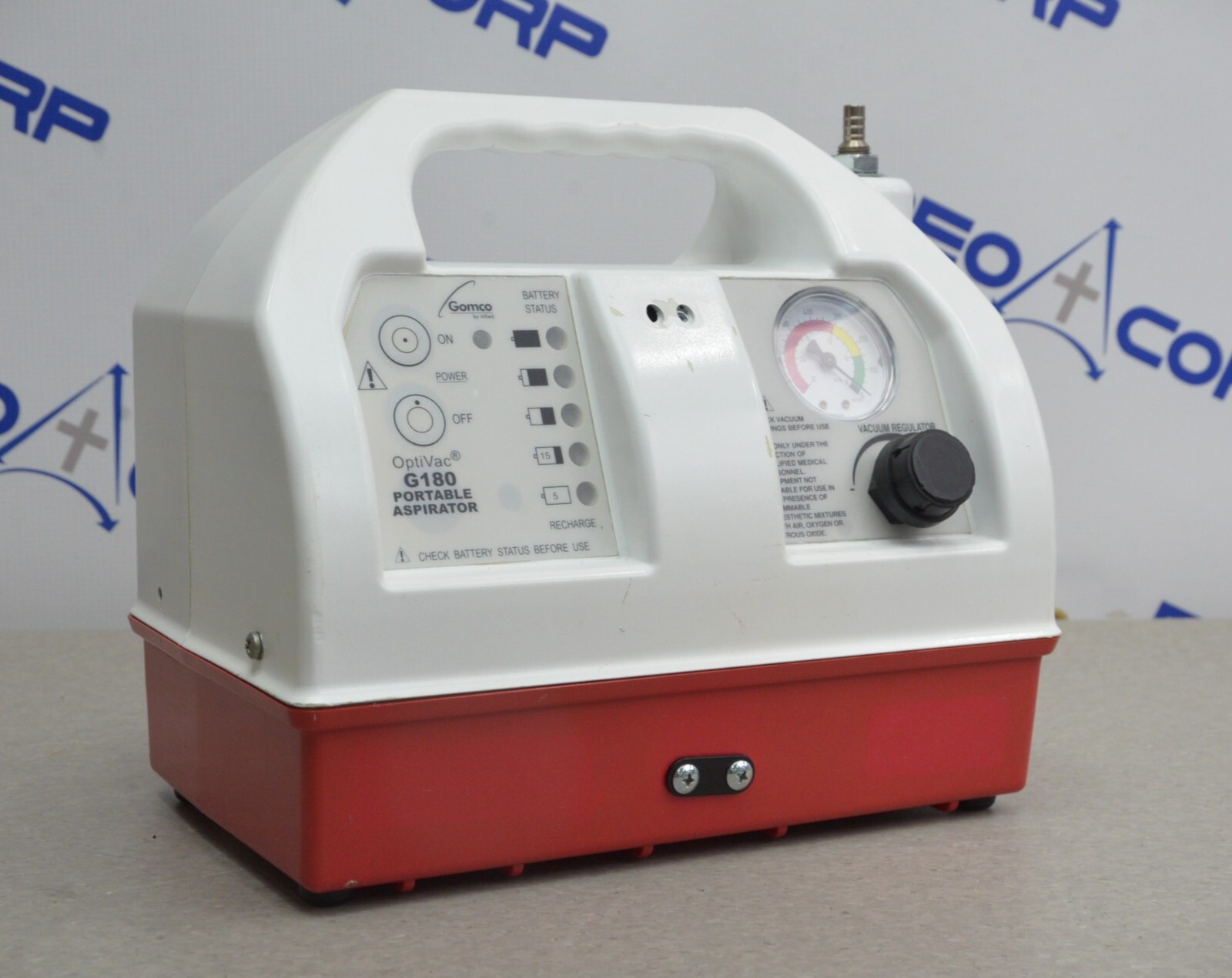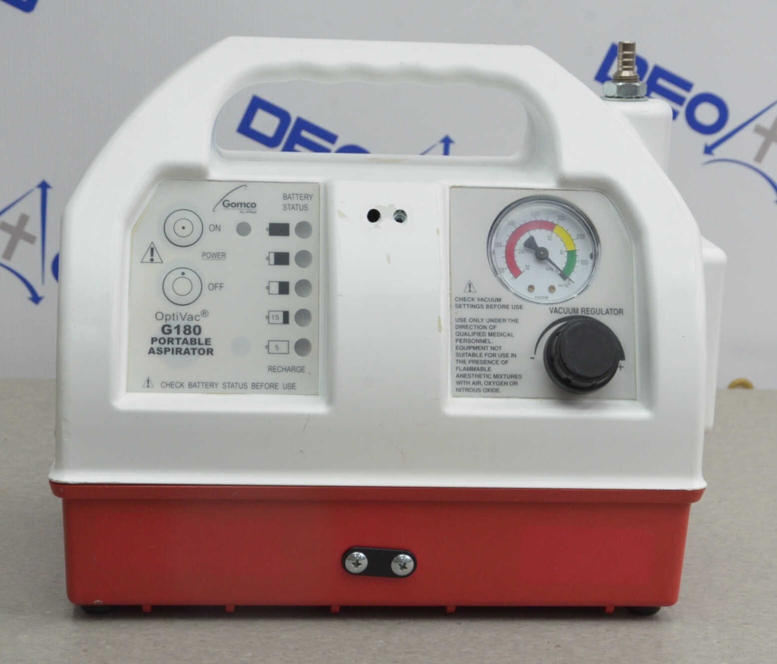 This Gomco Allied Healthcare OptiVac G180 Portable Aspirator is in good cosmetic conditionThis unit dose not power on, for that reason it is being sold for parts. The connection point is clean and in good condition. There are a few minor scuff marks from previous use (see photos). Includes everything displayed in the photos and nothing else.