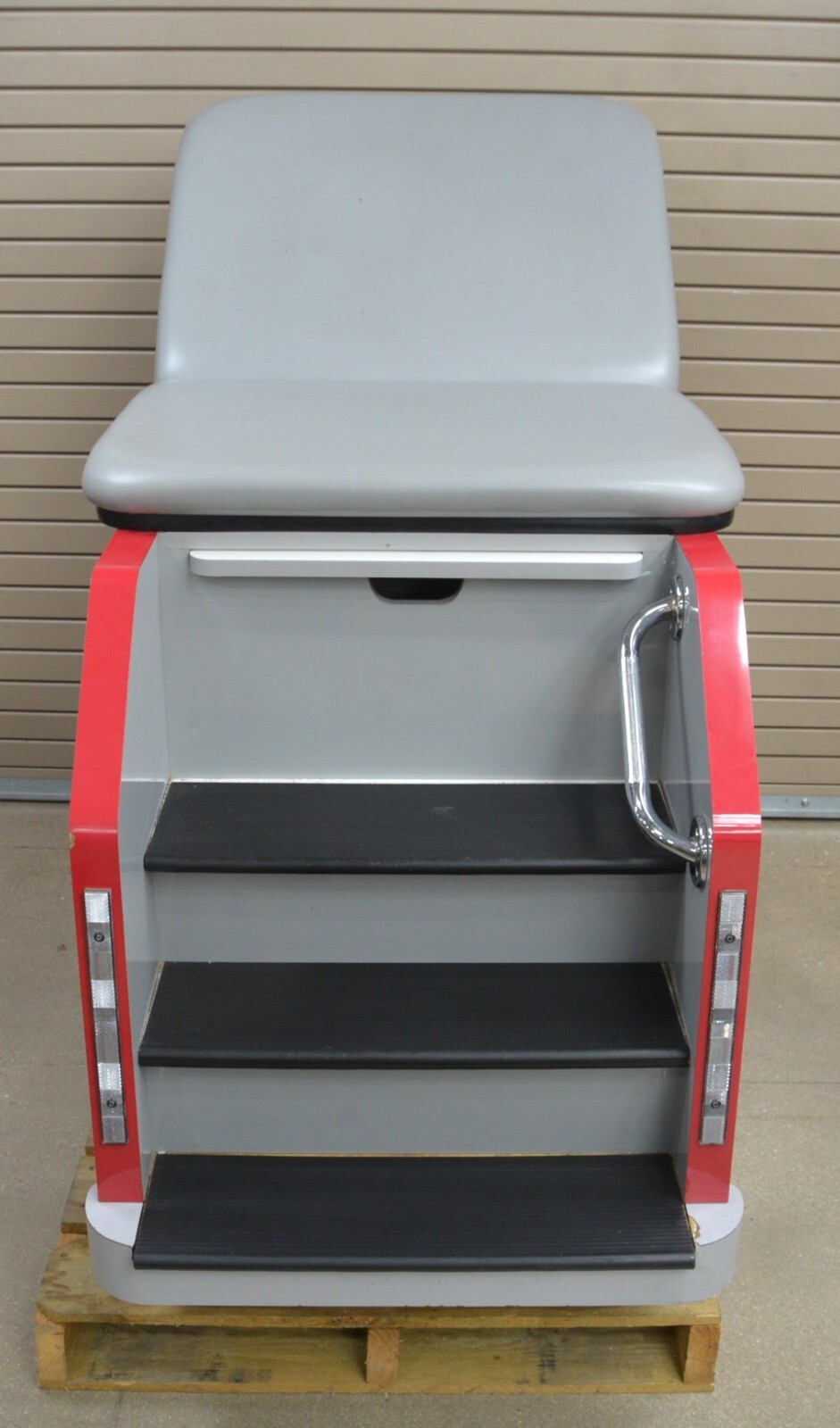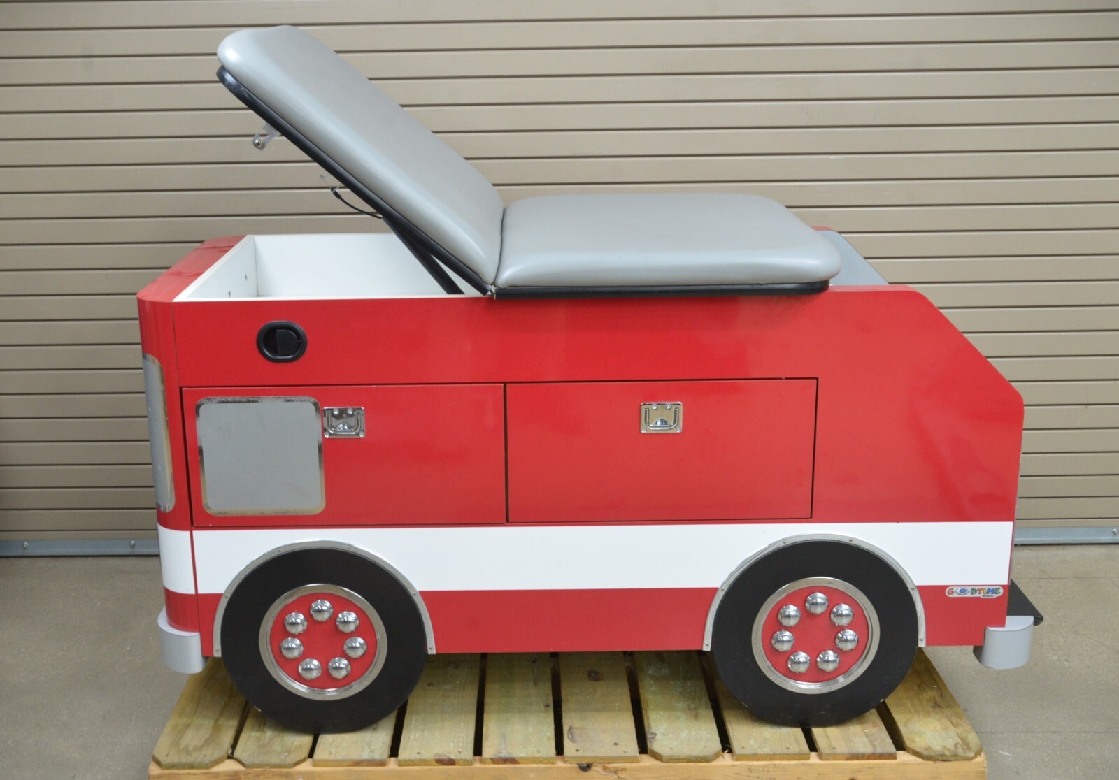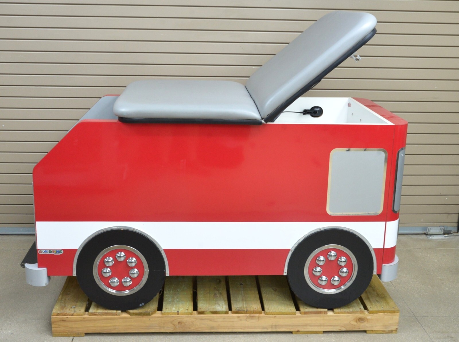 This Good Time Medical Fire Engine Pediatric Exam Table is in good condition. The manual adjustments move properly and the drawers open and close smoothly. There are some minor scuffs and chipped paint from previous use (see photos). This unit comes with a 30 day satisfaction guarantee. Includes everything in the pictures and nothing else.