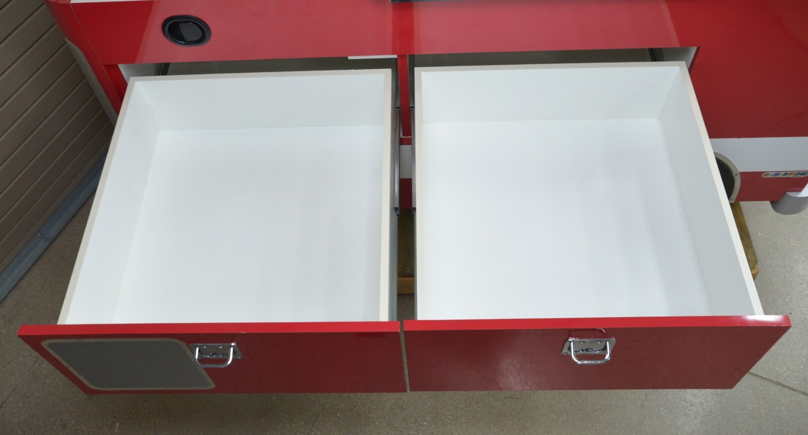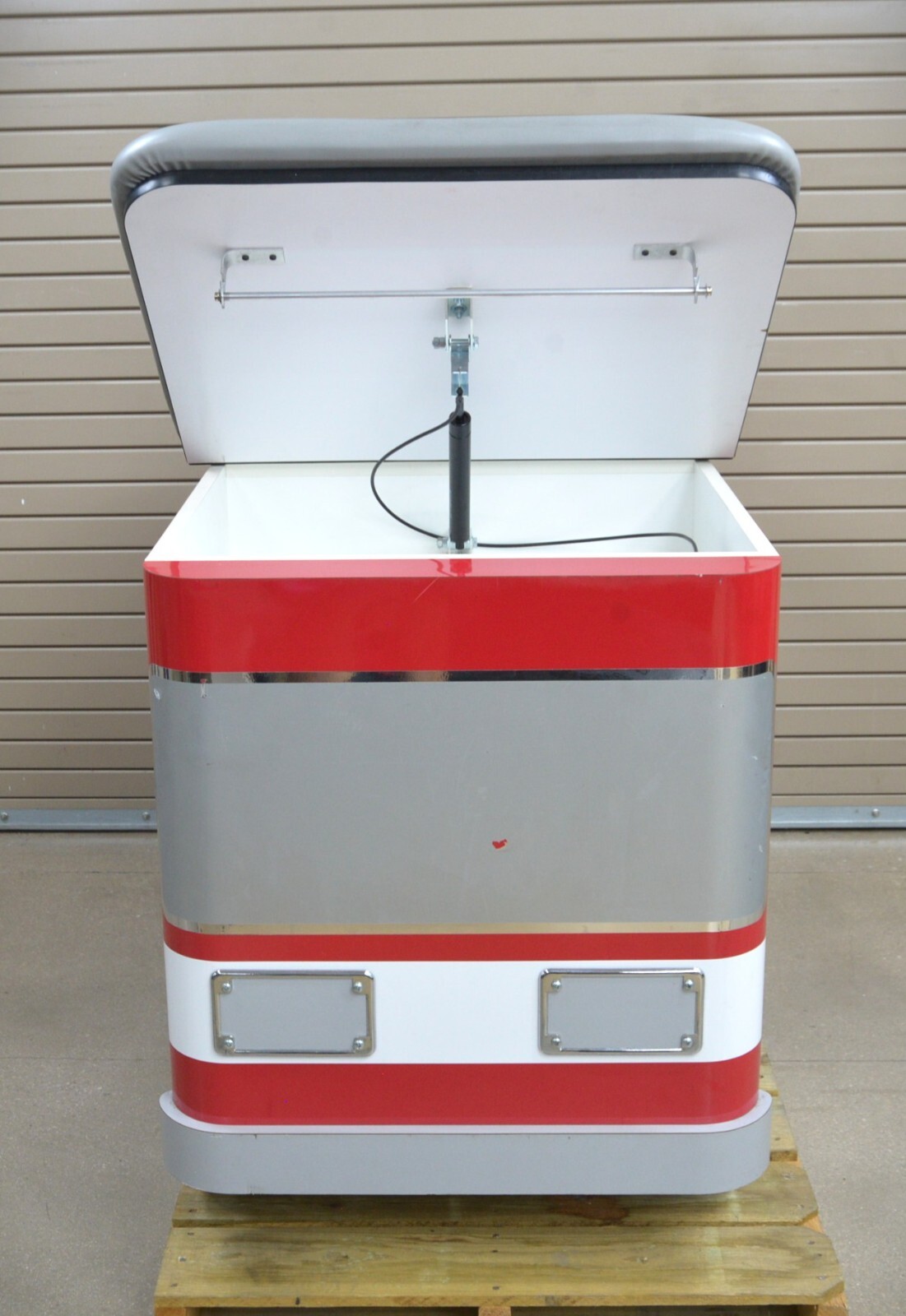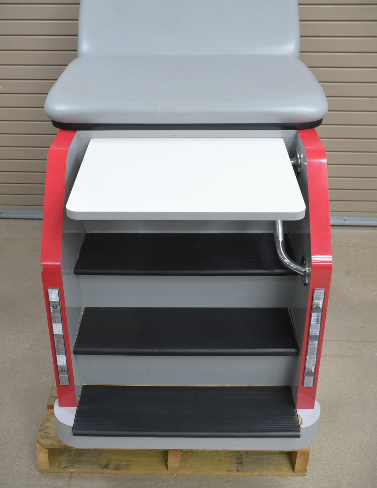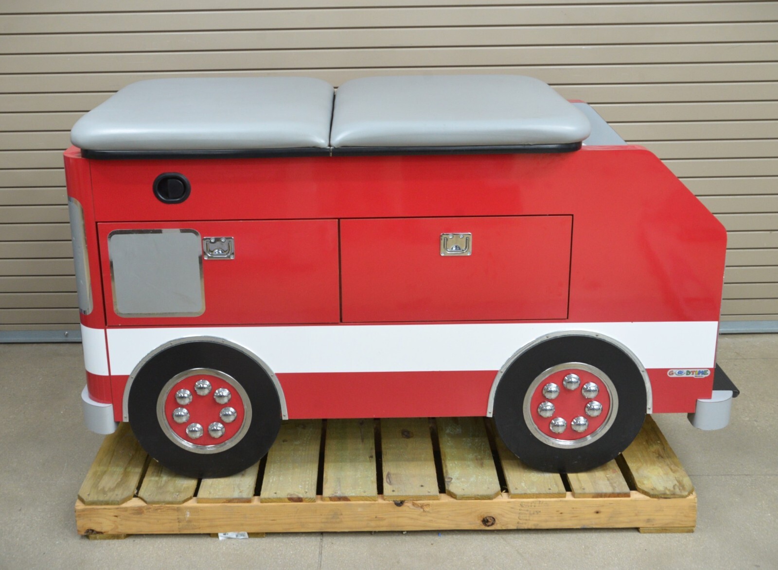 This Good Time Medical Fire Engine Pediatric Exam Table is in good condition. The manual adjustments move properly and the drawers open and close smoothly. There are some minor scuffs and chipped paint from previous use (see photos). This unit comes with a 30 day satisfaction guarantee. Includes everything in the pictures and nothing else.