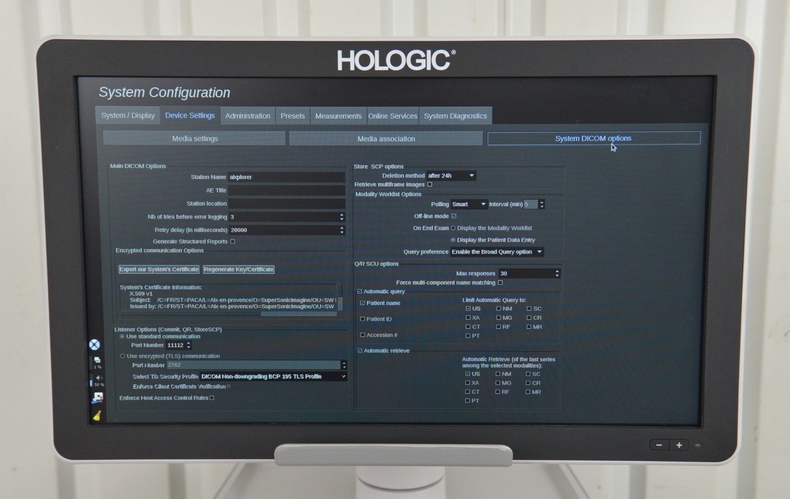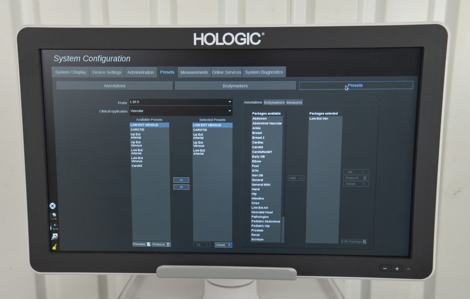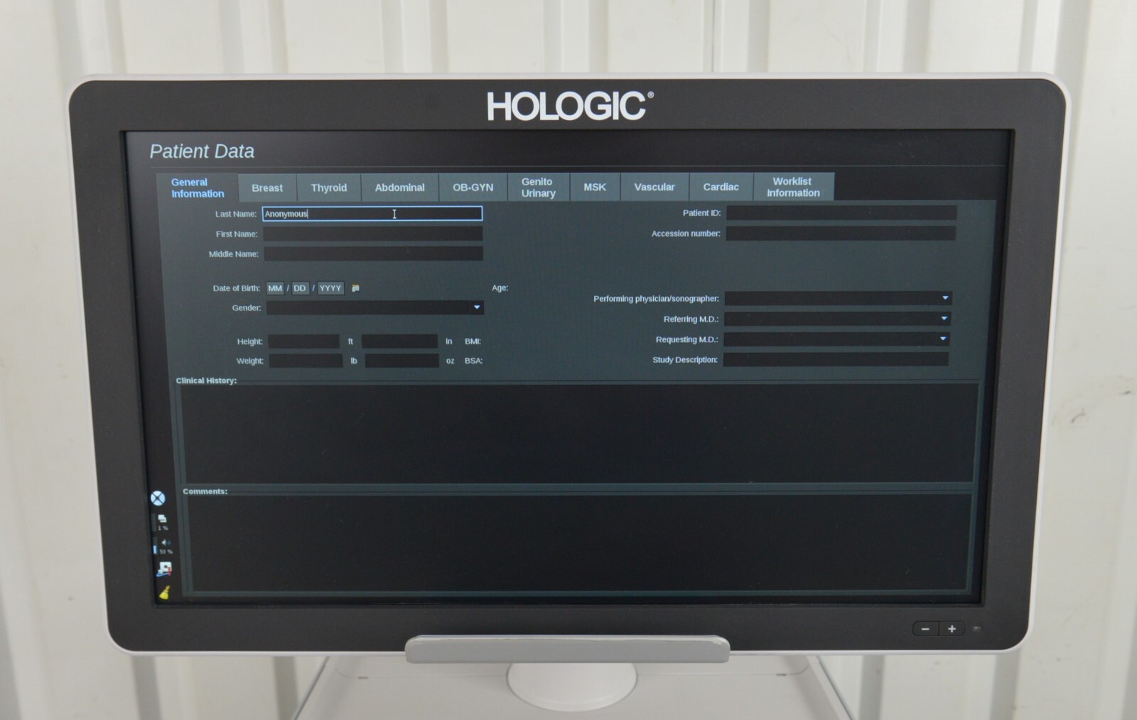 This Hologic SuperSonic Mach 20 Imaging System 2021 W/ SuperSonic L18-5 SSIP 95100 is in excellent working condition. This unit powers on properly. This unit appears to have little to no use. Both display screens produce a clear image and respond to selection. This unit has a real-time imaging mode that allows you to display