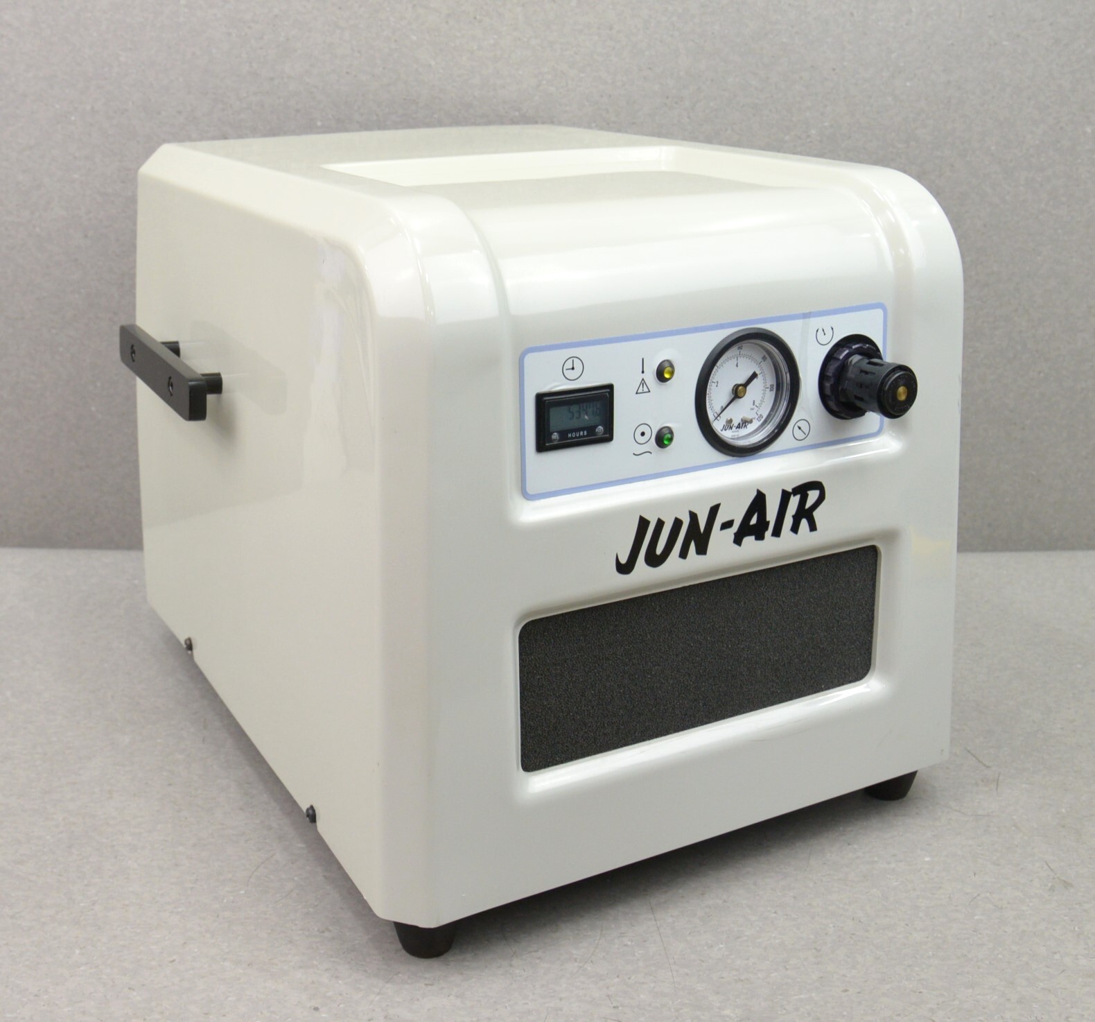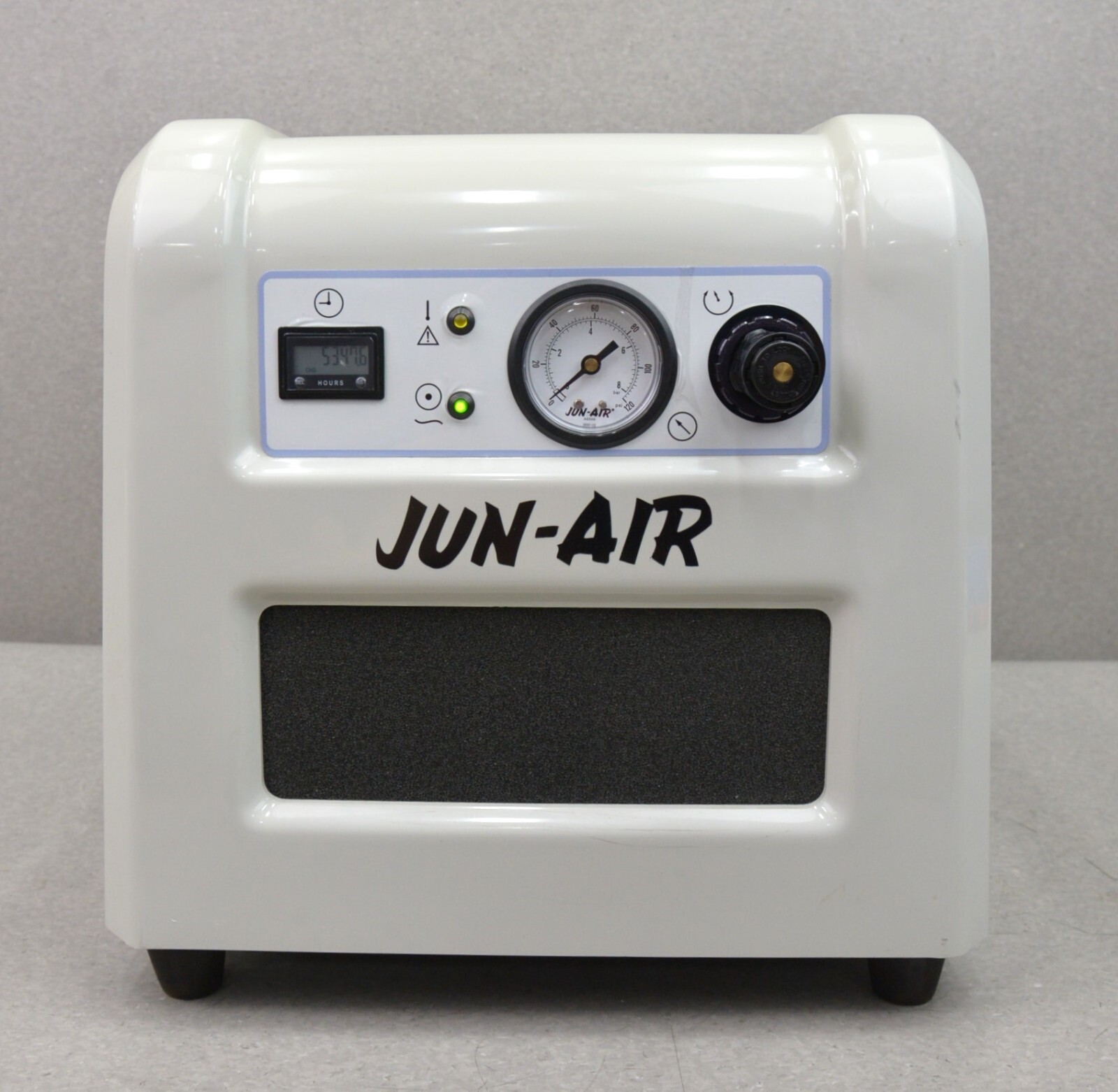 This JUN-AIR 87R-4P Medical Air Compressor Oil-Free 115V 4 Liter is in good cosmetic condition. The unit powers on but there is no compression so possibly a valve is stuck open. For this reason, this unit is being offered as-is for parts or repair only. There are minor scuff marks from previous use (see photos). Includes everything in the pictures and nothing else.