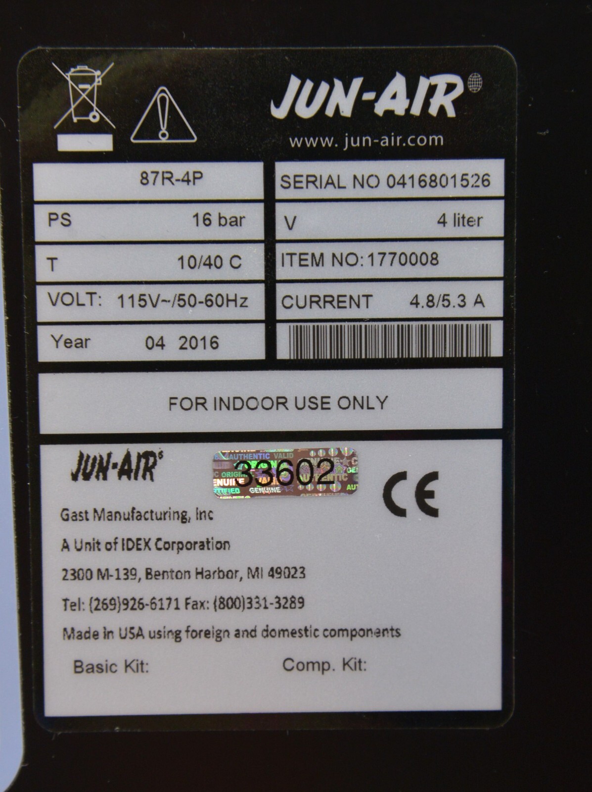 JUN-AIR 87R-4P Medical Air Compressor Oil-Free 115V 4 Liter
