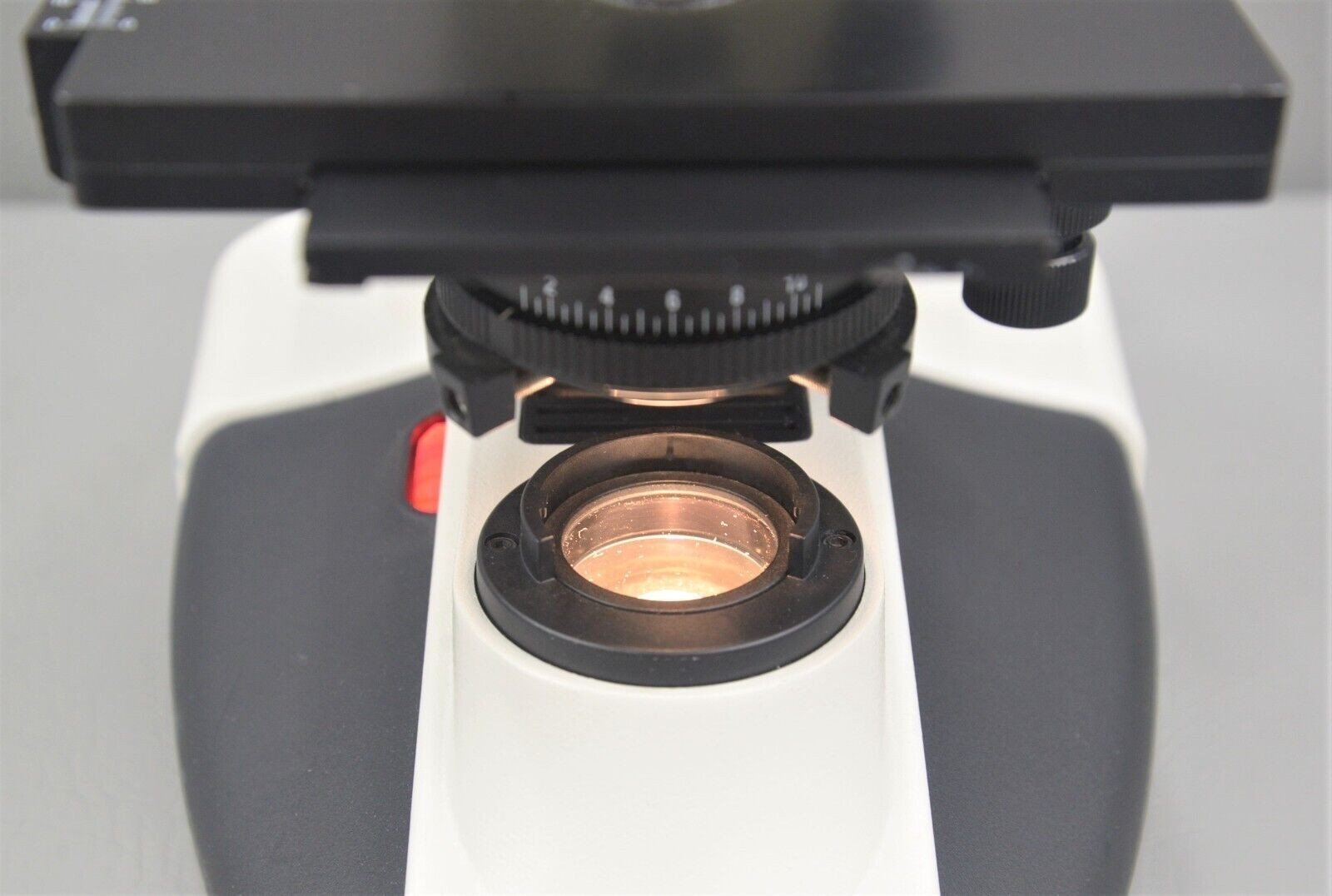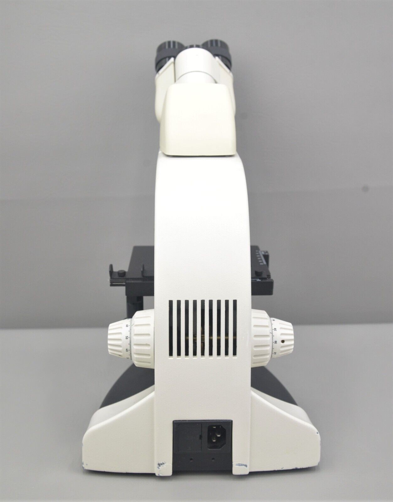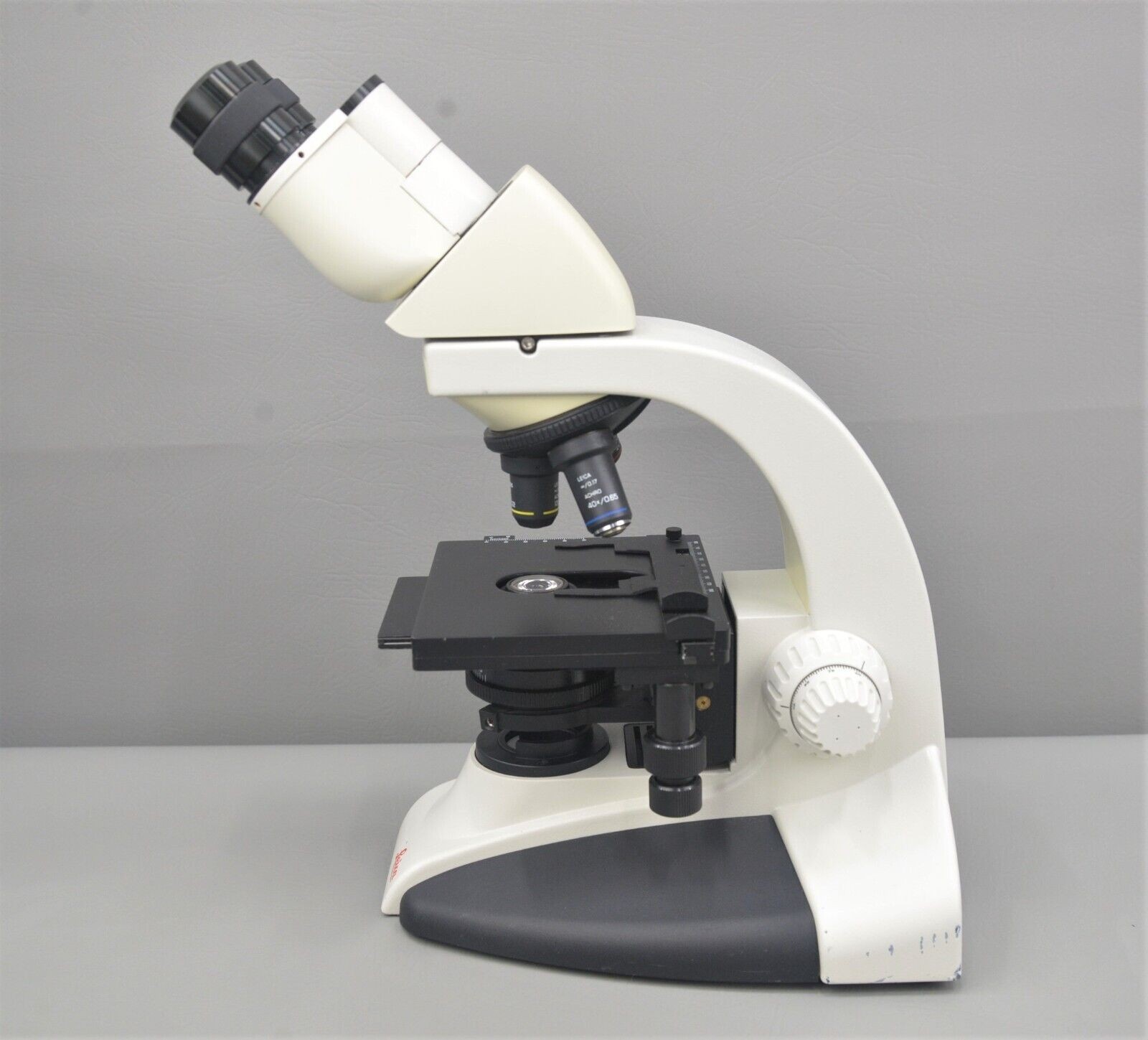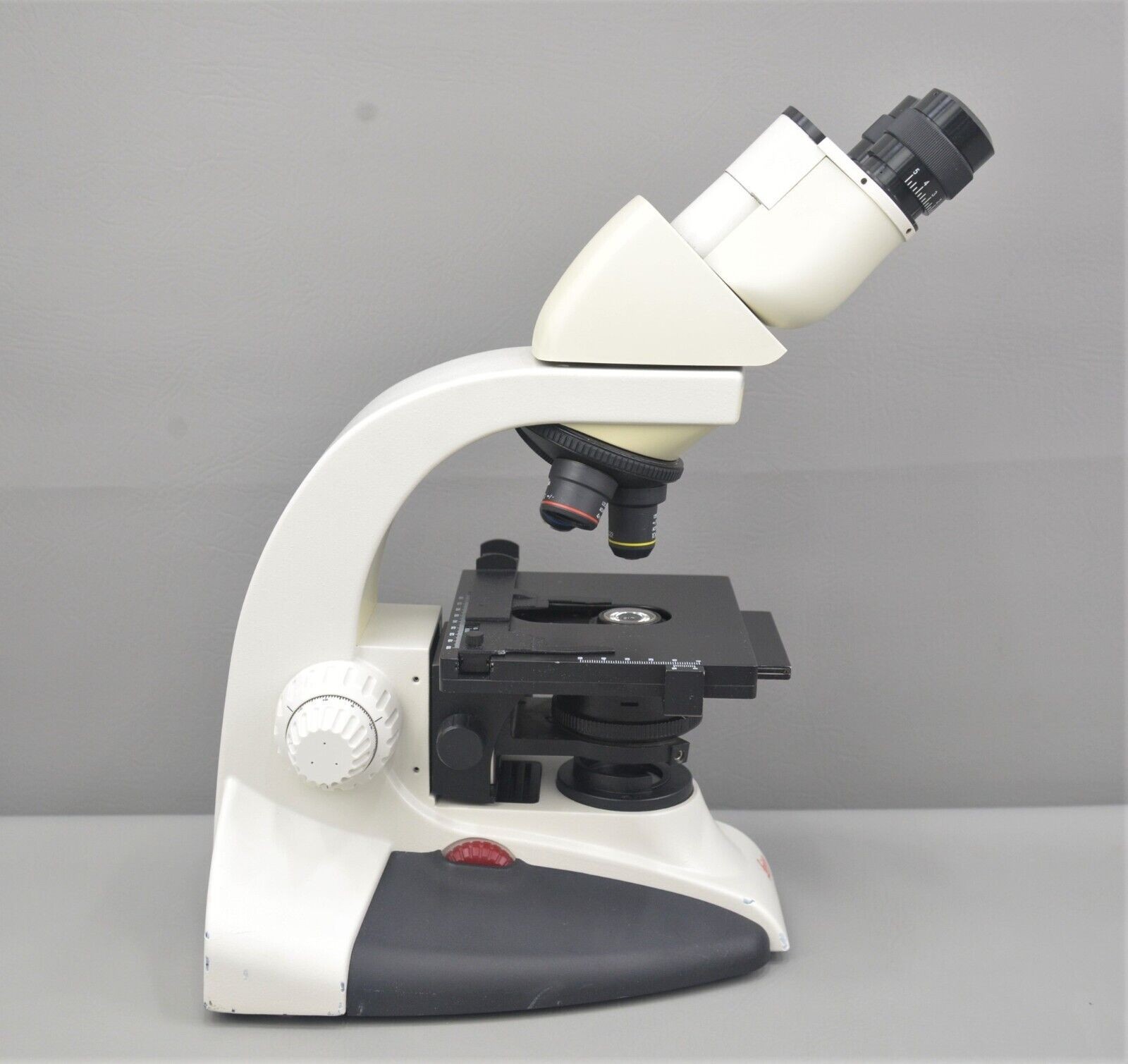 This Leica DME Upright Compound Binocular Microscope is in good working condition. The binocular viewing body, stand and manual adjustment knobs are in good working condition. The eyepieces are not included. The focusing column moves up and down smoothly. All glass and objectives are clean and in good condition. The overall cosmetic condition is good with the exception of few minor areas with chipped paint associated with previous use (see photos). Includes 4x, 10x, 40x objectives. This system comes with a 30 day satisfaction guarantee. Includes everything in the pictures and nothing else.