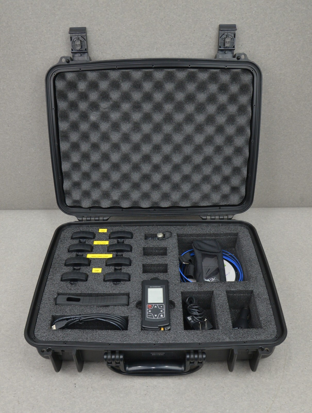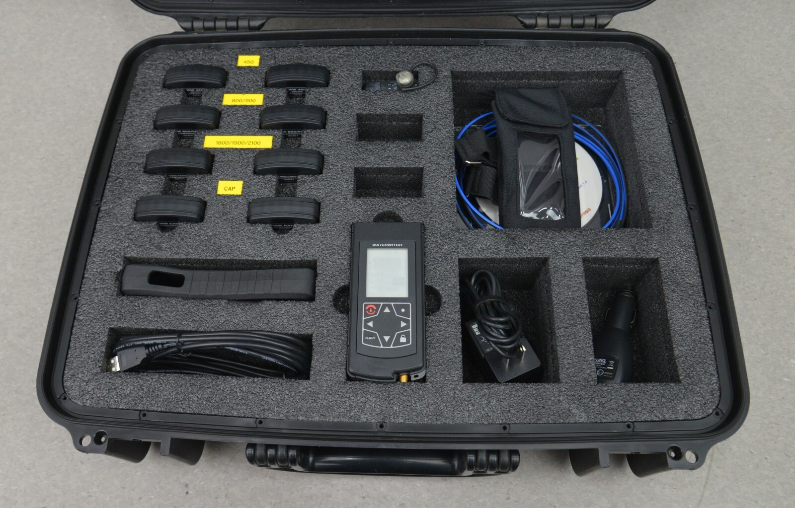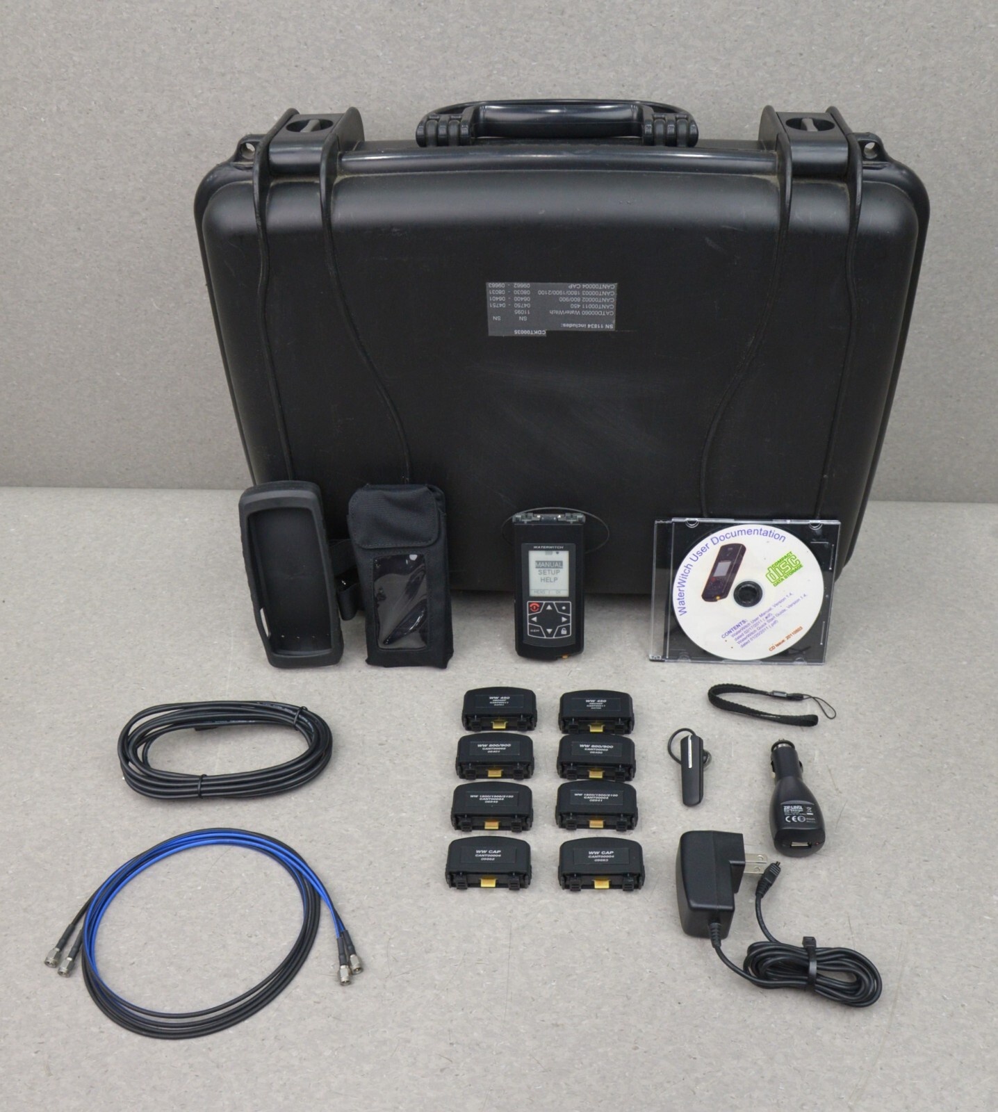 This Leidos WickedWeld WaterWitch CDKT00035 Handheld RF Transmission Receiver Kit is in excellent working condition. This unit powers on and appears to have little use. The display screen has a clear picture and buttons respond properly to selection. All connection points are clean and in good condition. There is minor scuff marks and some writing on the unit (see photo). The internal battery holds a charge. This unit comes with a 30 day satisfaction guarantee.  Includes everything in the pictures and nothing else.