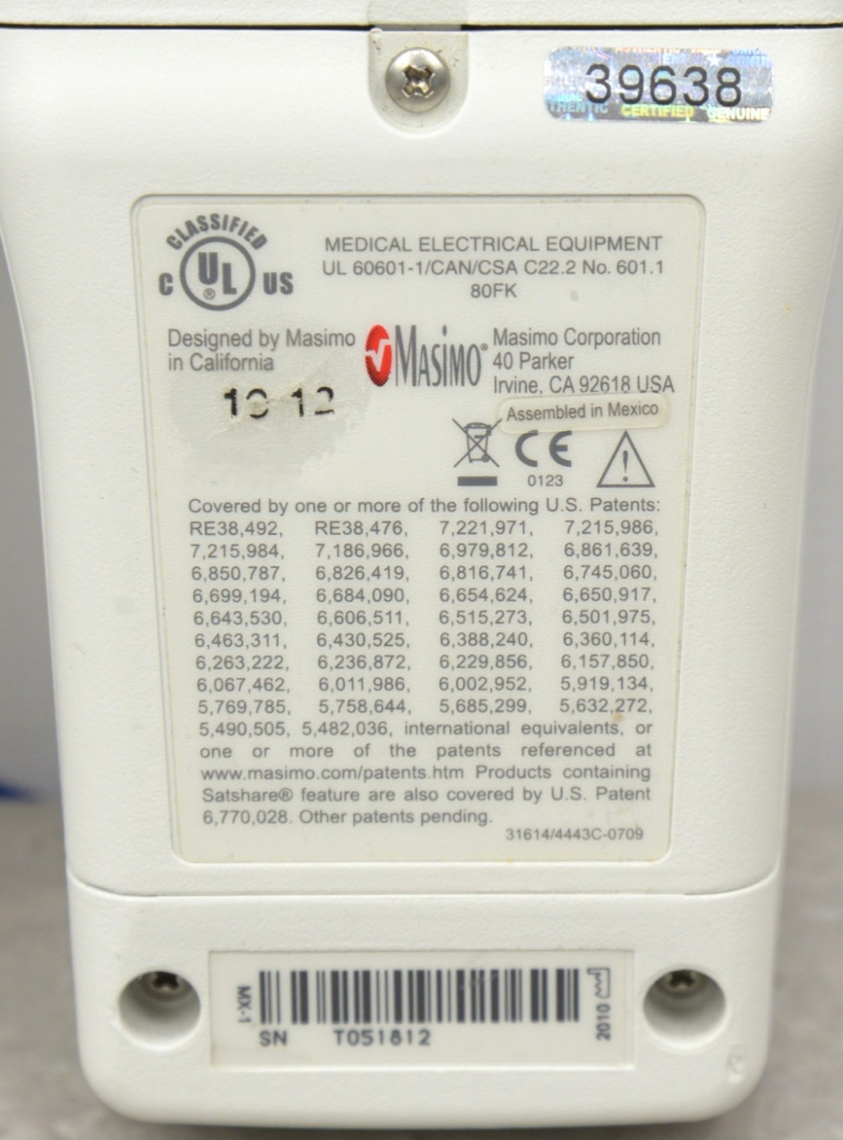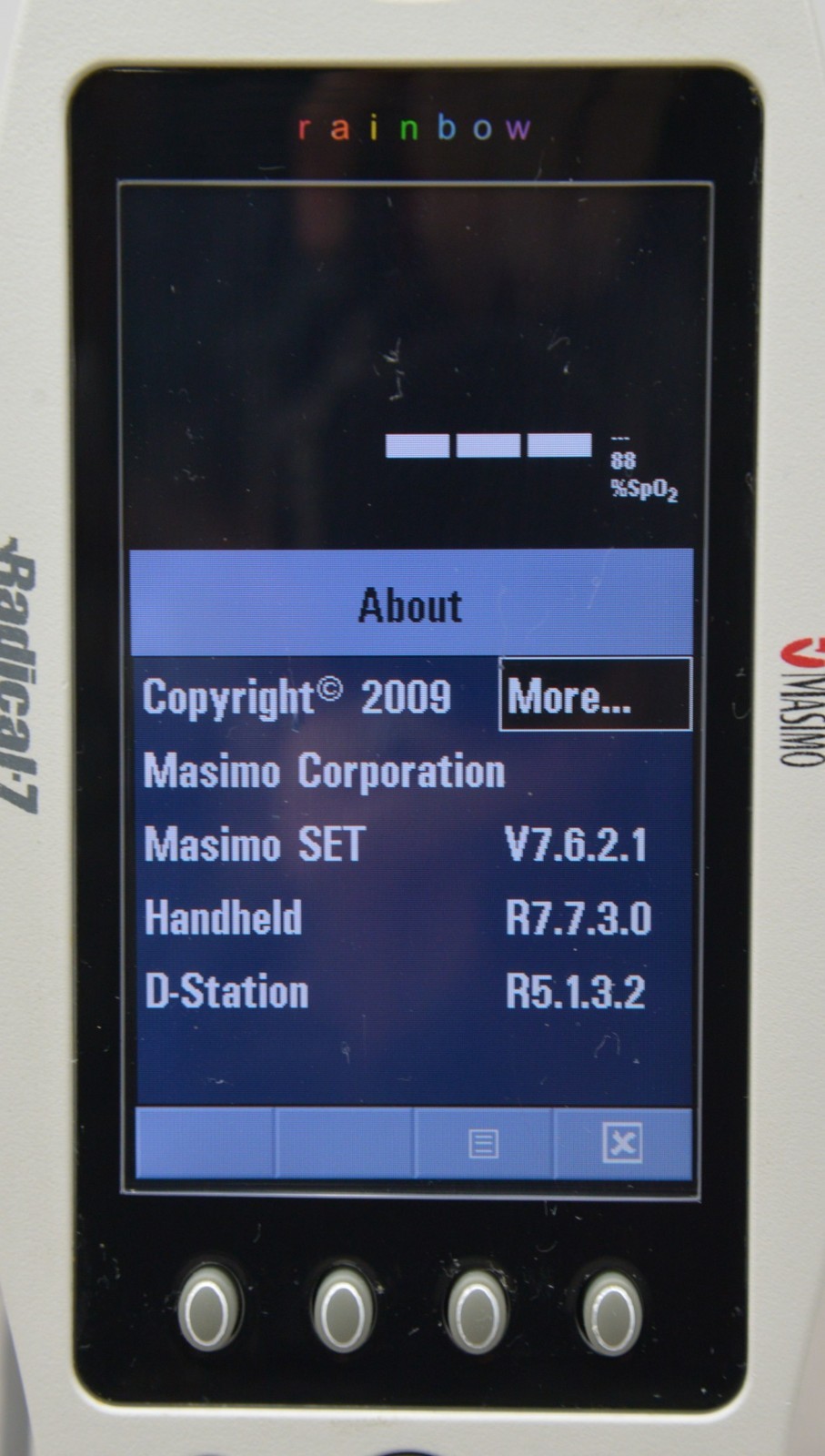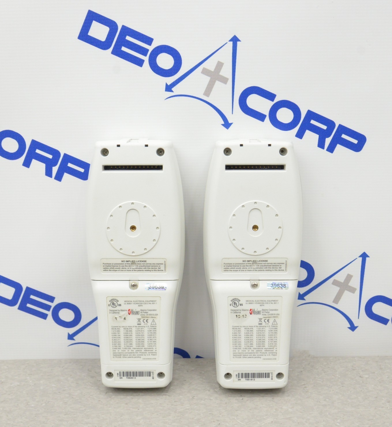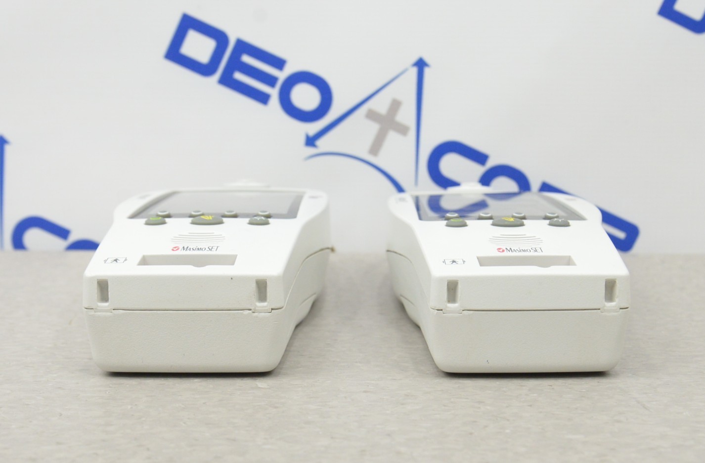 This Lot of 2 Masimo Radical-7 Rainbow Signal Extraction Pulse Oximeter is in good working condition. The units power on properly when connected to the dock, the dock is not included. The display screens produce a clear image and the buttons respond to selection. The is 2009. There are minor scuff marks and dust in-between the screen from previous use (see photos). Does not include battery. This unit comes with a 30 day satisfaction guarantee. Includes everything in the pictures and nothing else.