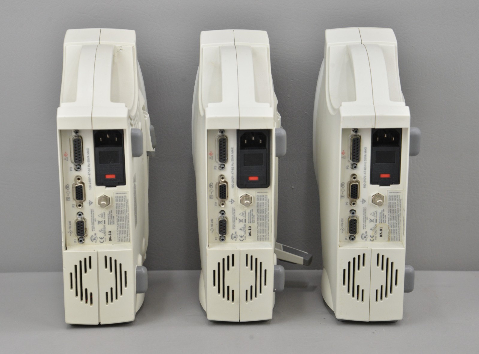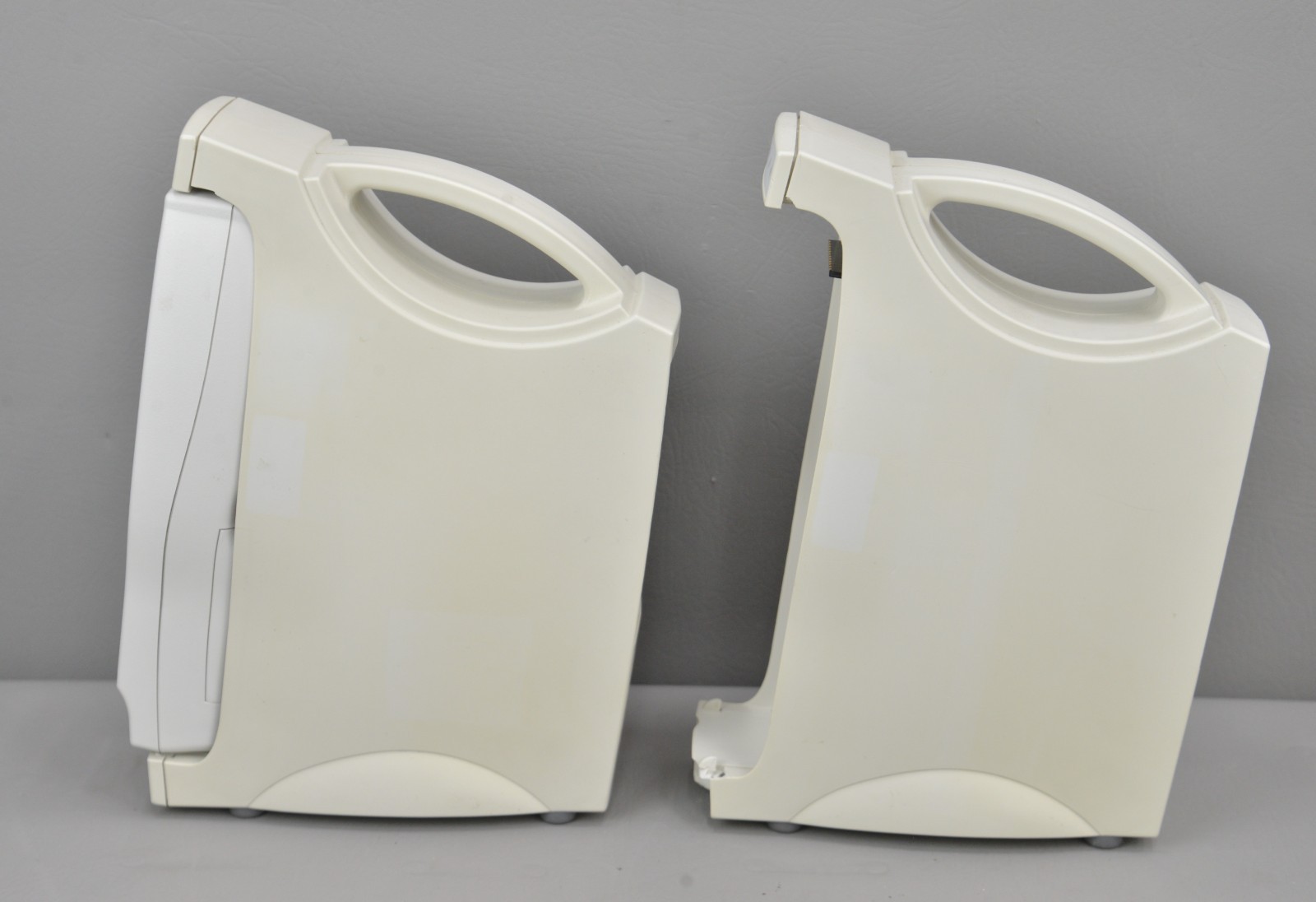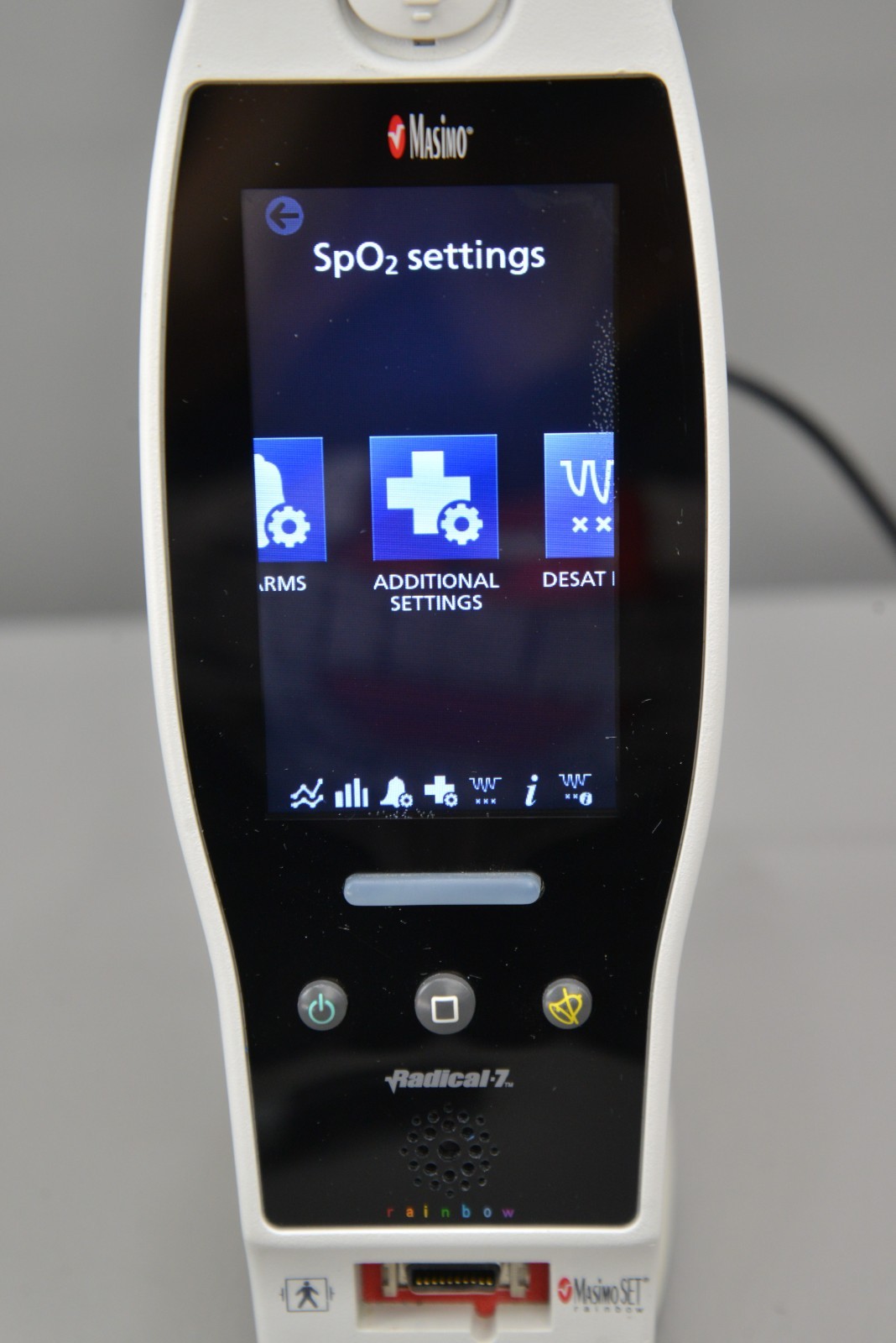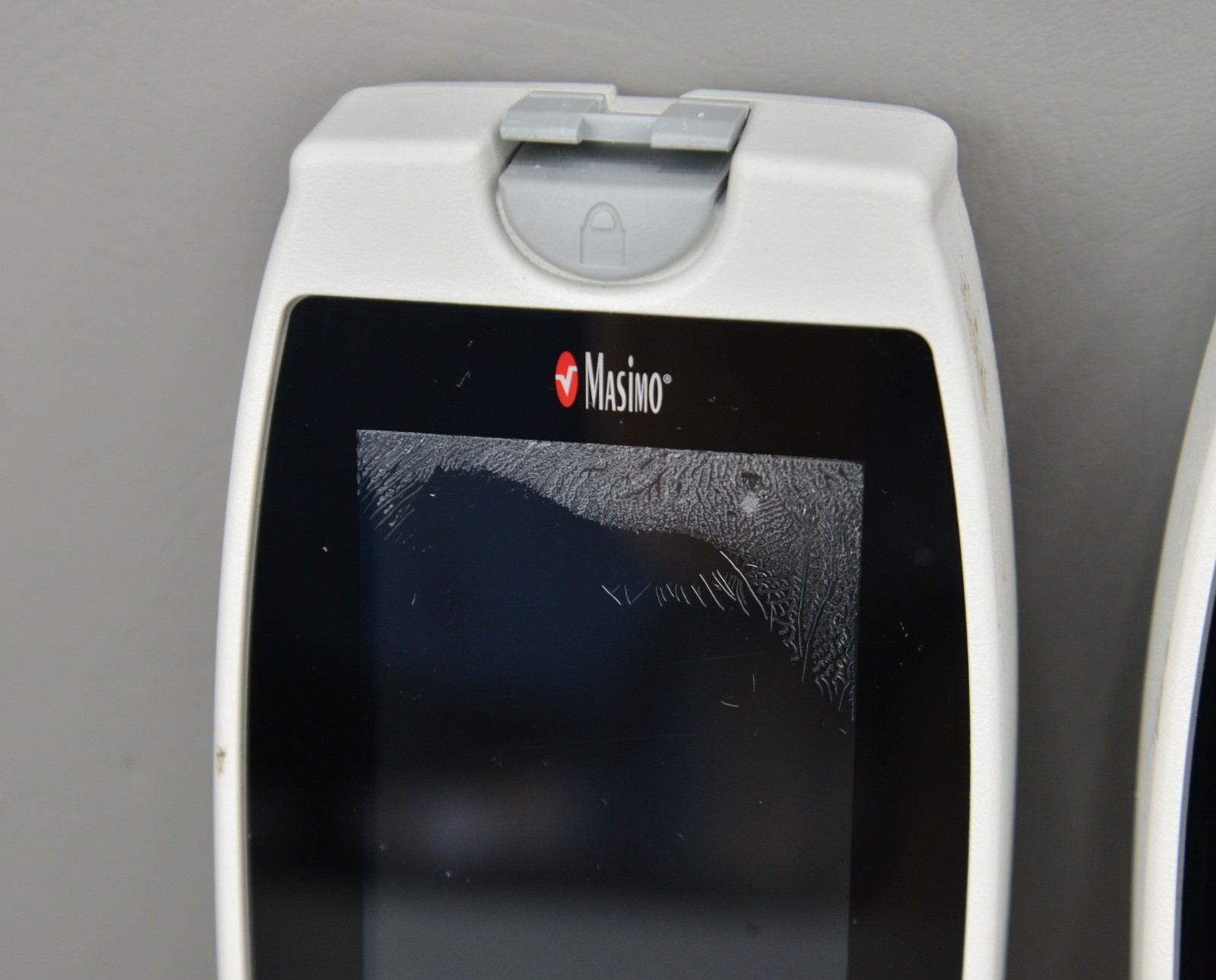 This Lot of 4 Masimo Set Radical 7 Rainbow Pulse CO-Oximeter w/ 5 RDS-1 Docking Station is in good cosmetic condition. They power on; however, the touch screens do not respond properly and once in the settings the screen freezes, for these reasons it is being sold for parts. There are cracks in different areas of these monitors and the bases (see photo). There is damage on the edges of the screens. They do not include the rechargeable batteries. Includes everything in the pictures and nothing else.