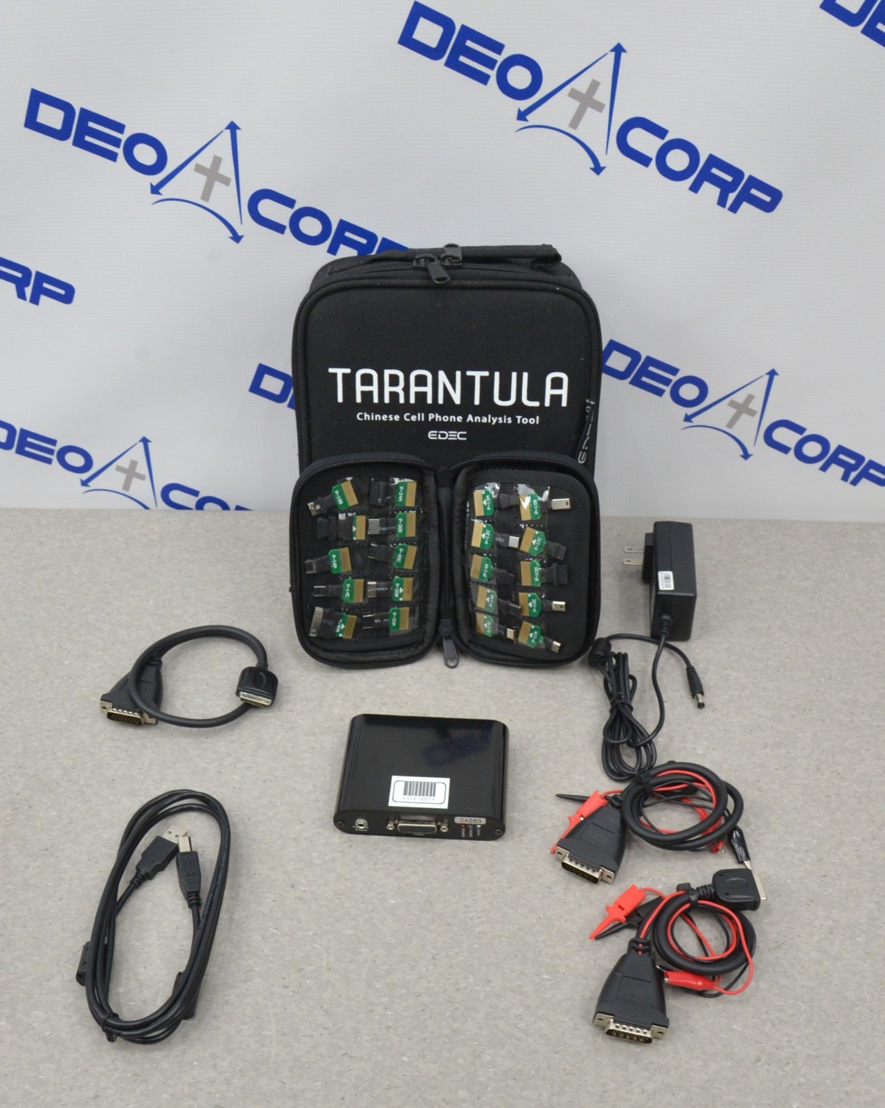 This EDEC Digital Forensics Tarantula Chinese Cell Phone Analysis Kit with Chipset Connectors is in great cosmetic condition. These units power on; however, they do not have software and for this reason they are being sold for parts. The Chipset connectors are in excellent condition. The connections are clean and in good condition. Includes everything displayed in the photos and nothing else.