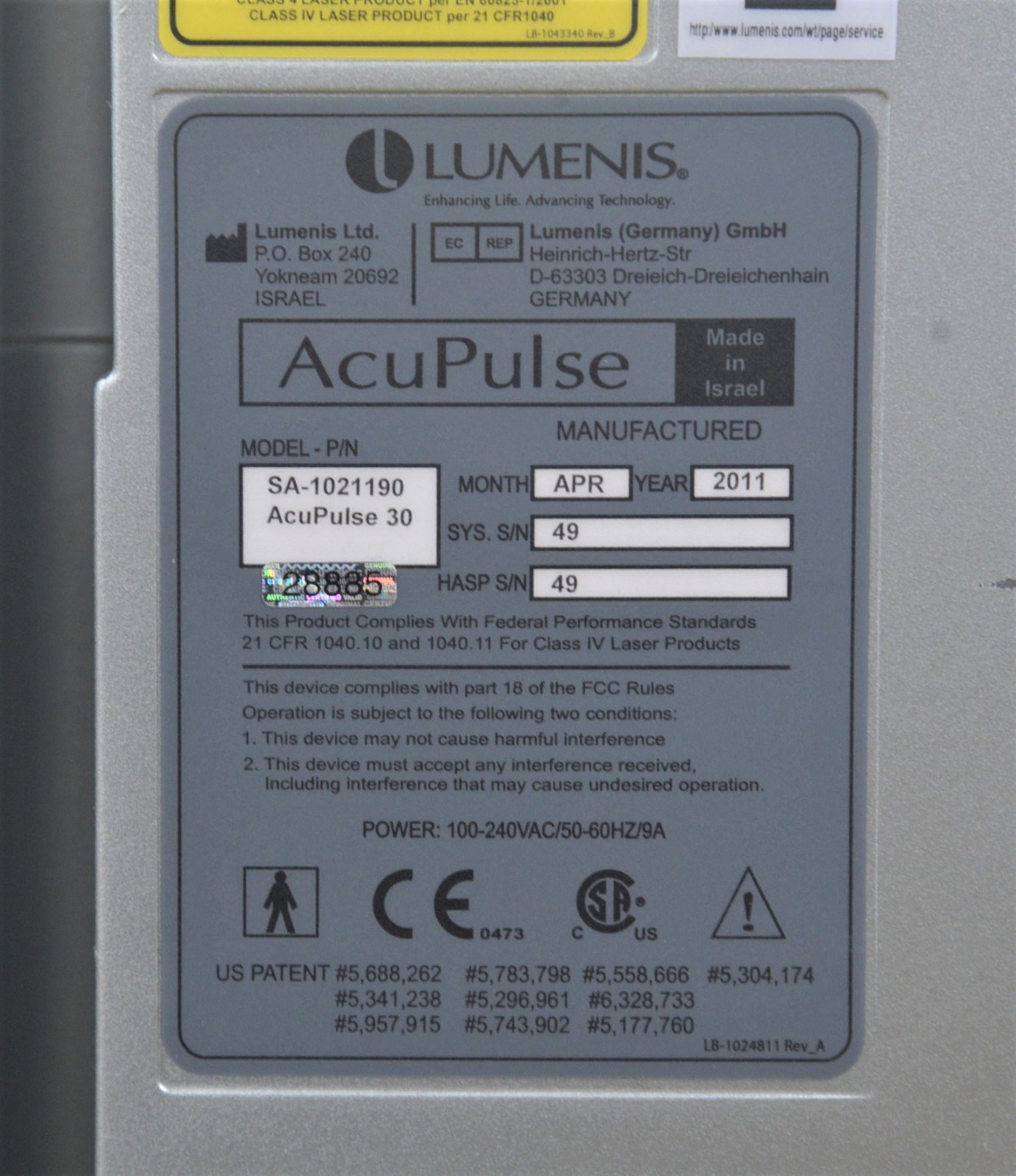 Lumenis AcuPulse 30 SurgiTouch Surgical System SA-1021190, 2011 Model