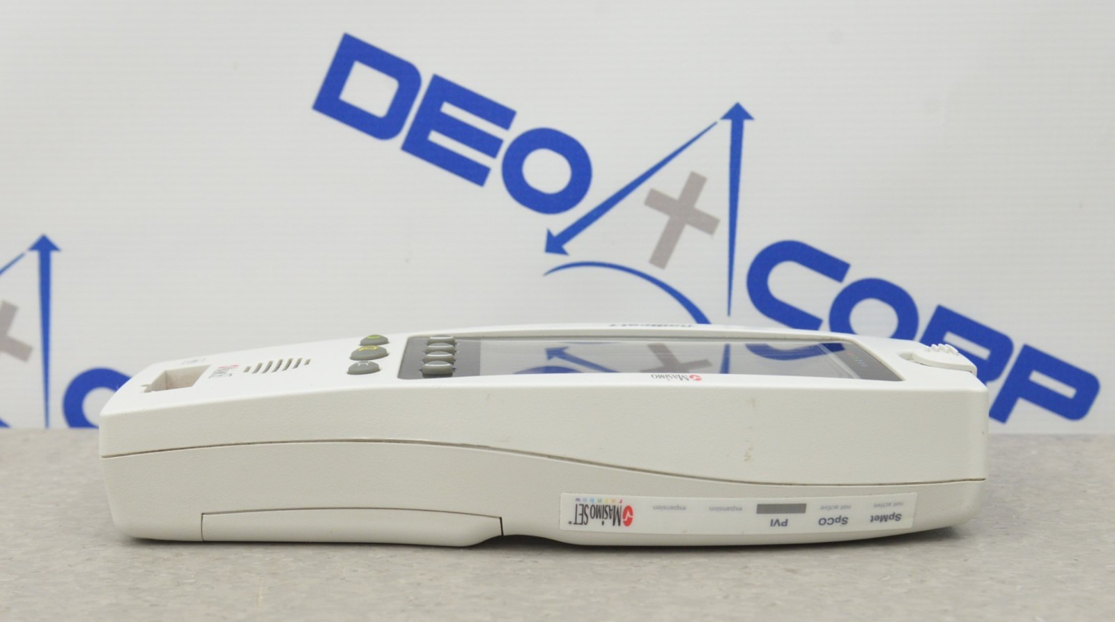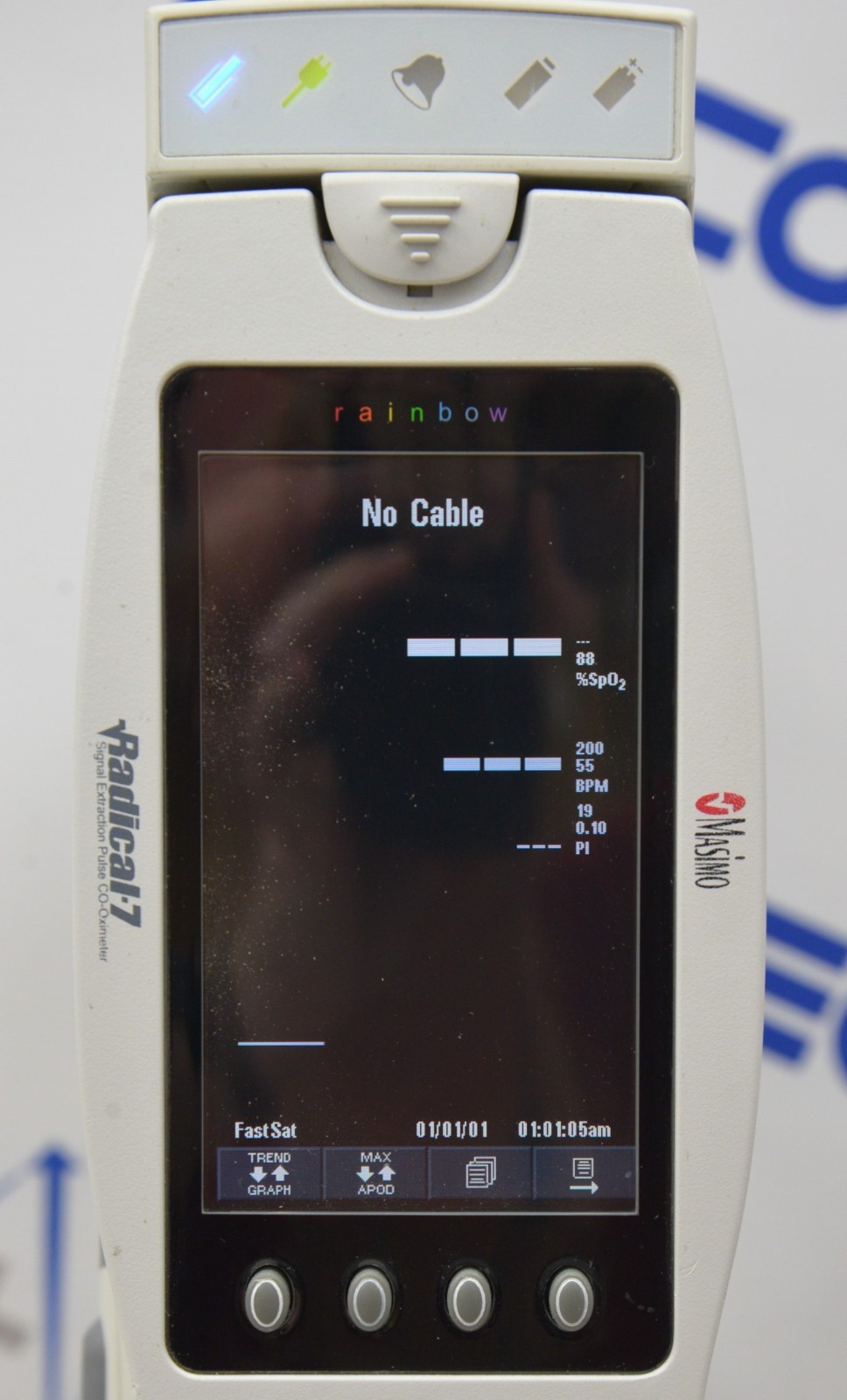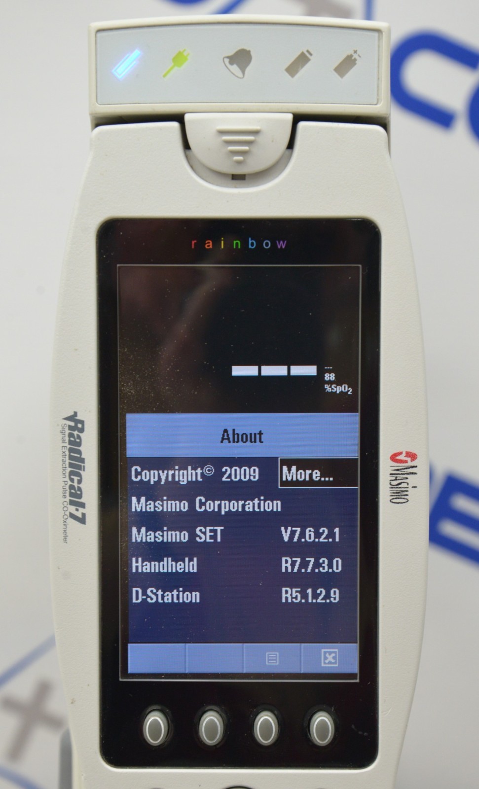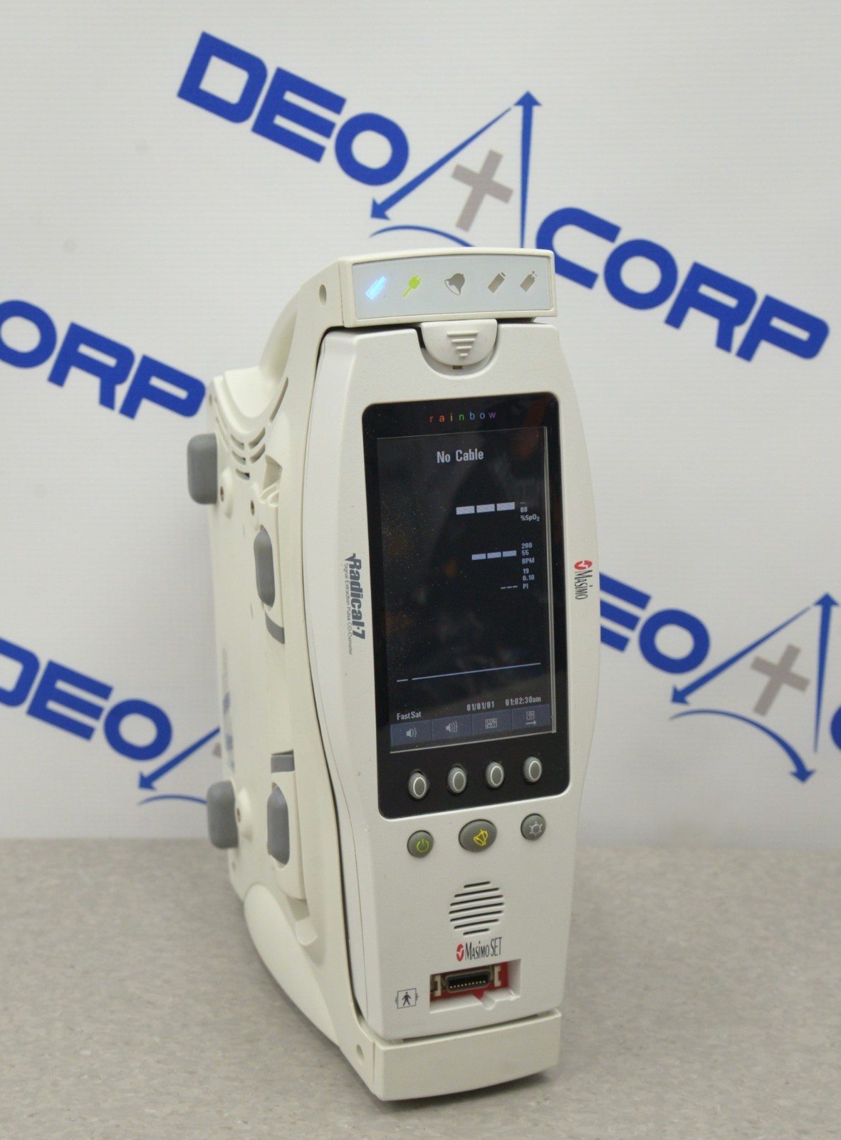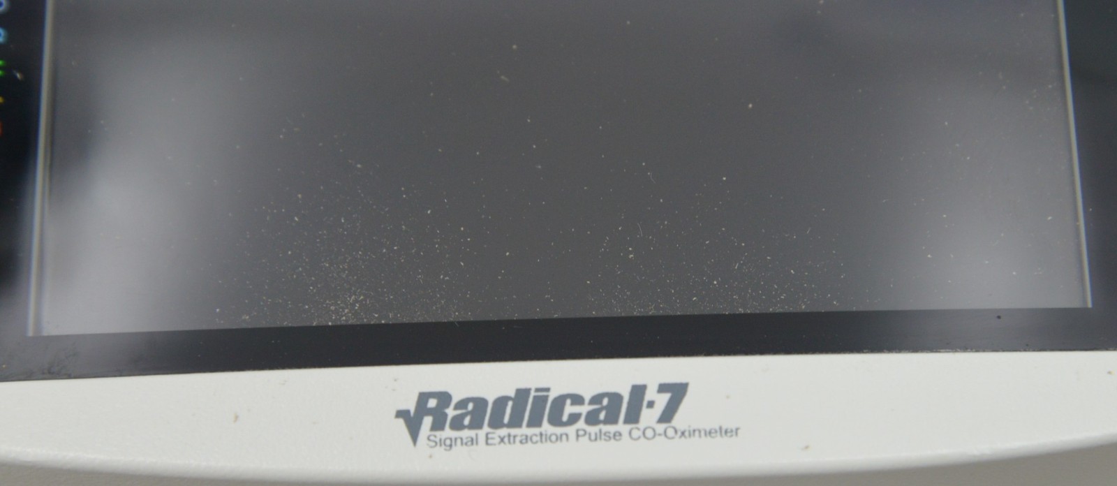This Masimo Radical-7 Rainbow Signal Extraction Pulse Oximeter W/ RDS-1 Docking Station is in good working condition. The unit powers on properly. The display screen produces a clear image and the buttons respond to selection. The DOM is 2011, and the software is 2009. There are minor scuff marks and dust in-between the screen from previous use (see photos). Does not include battery. This unit comes with a 30 day satisfaction guarantee. Includes everything in the pictures and nothing else.