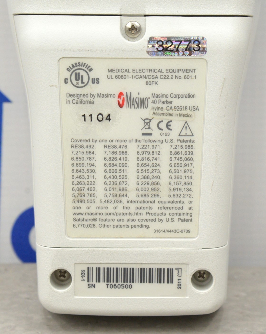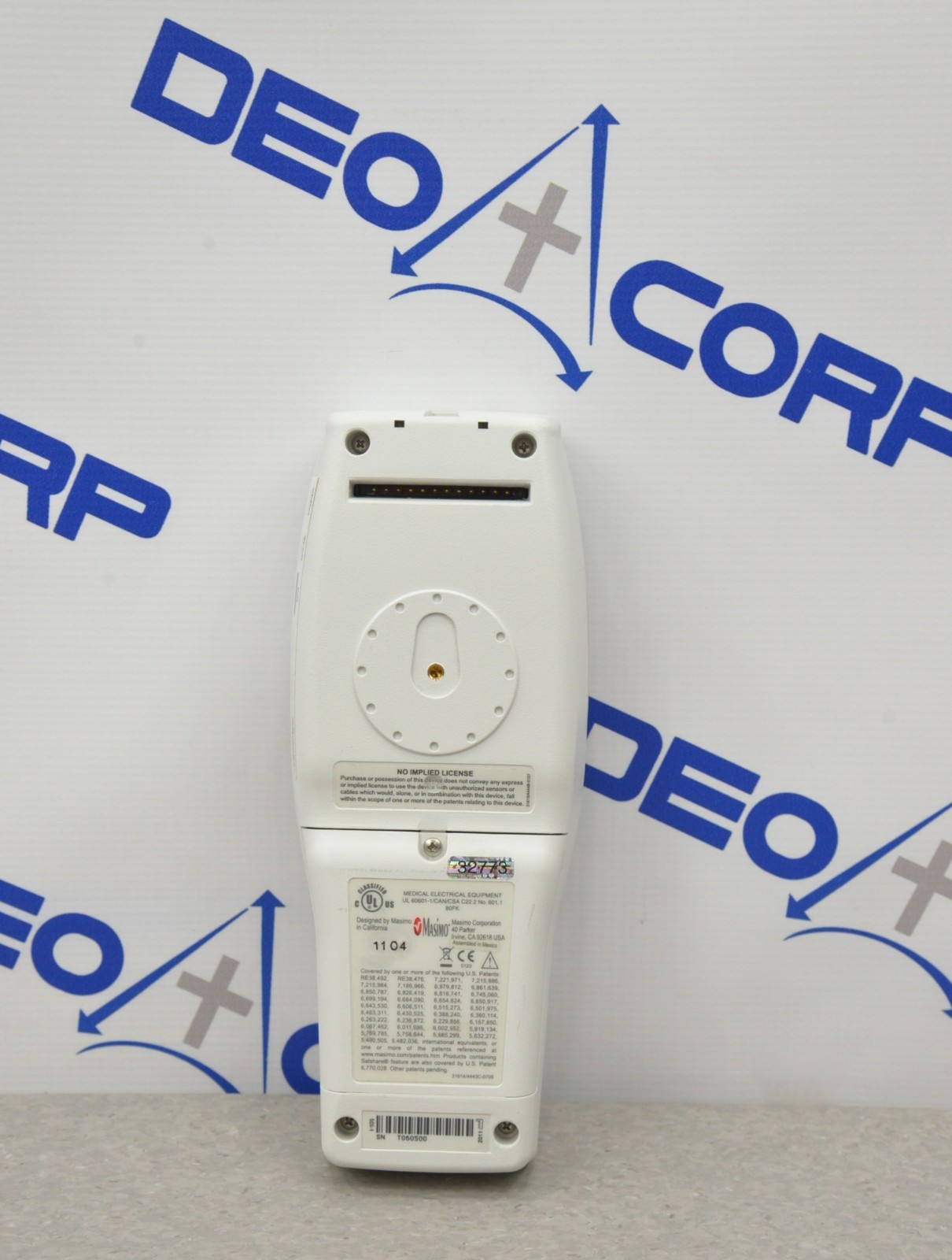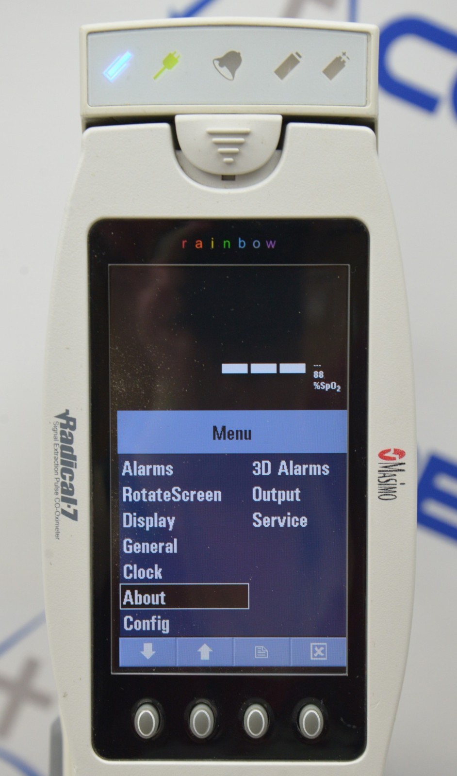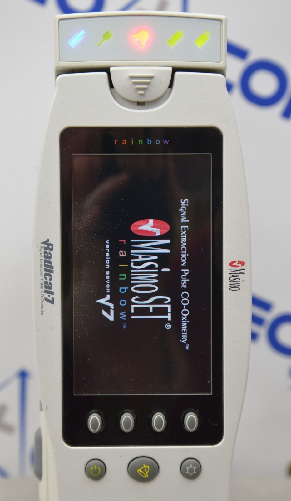 This Masimo Radical-7 Rainbow Signal Extraction Pulse Oximeter W/ RDS-1 Docking Station is in good working condition. The unit powers on properly. The display screen produces a clear image and the buttons respond to selection. The DOM is 2011, and the software is 2009. There are minor scuff marks and dust in-between the screen from previous use (see photos). Does not include battery. This unit comes with a 30 day satisfaction guarantee. Includes everything in the pictures and nothing else.