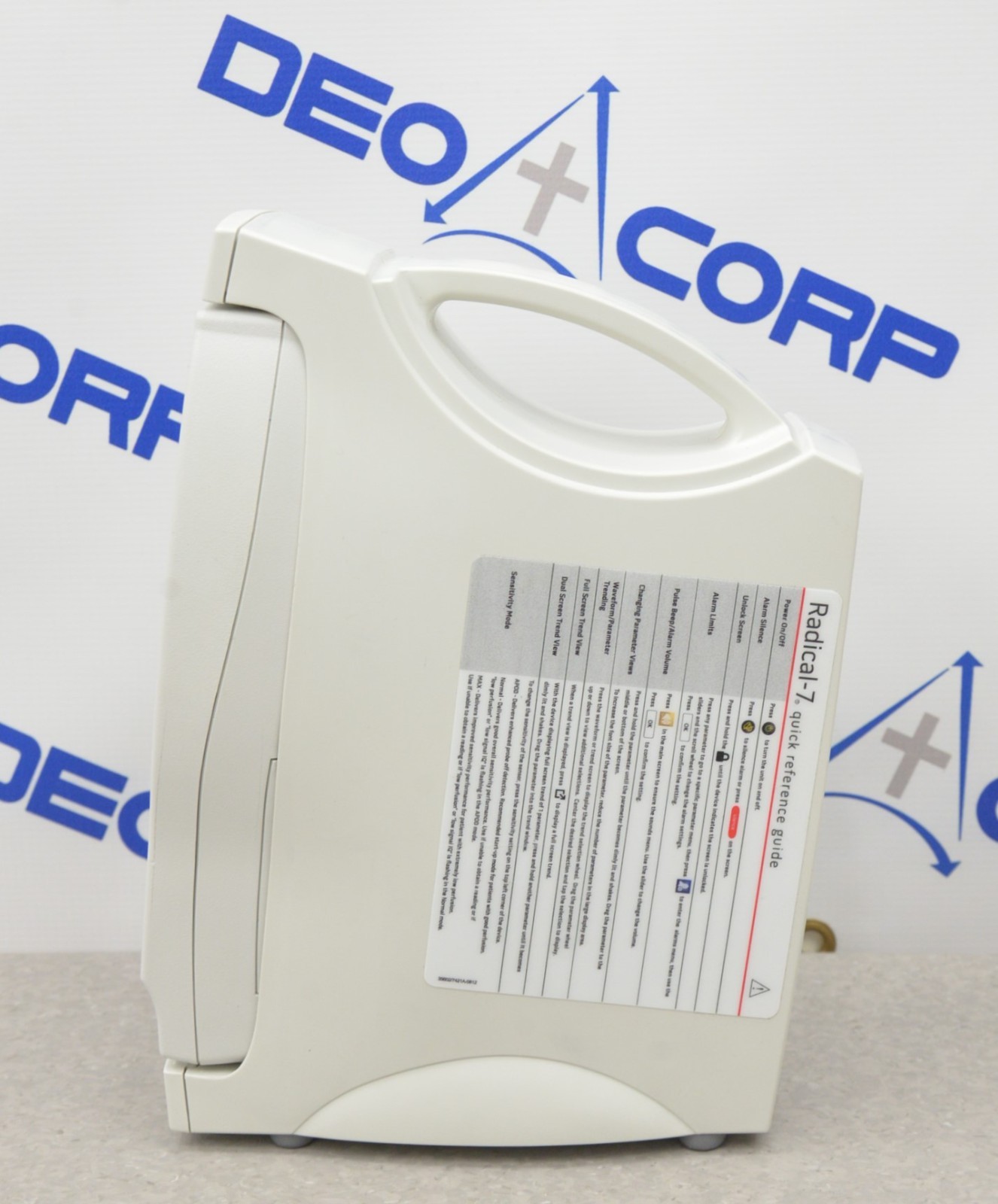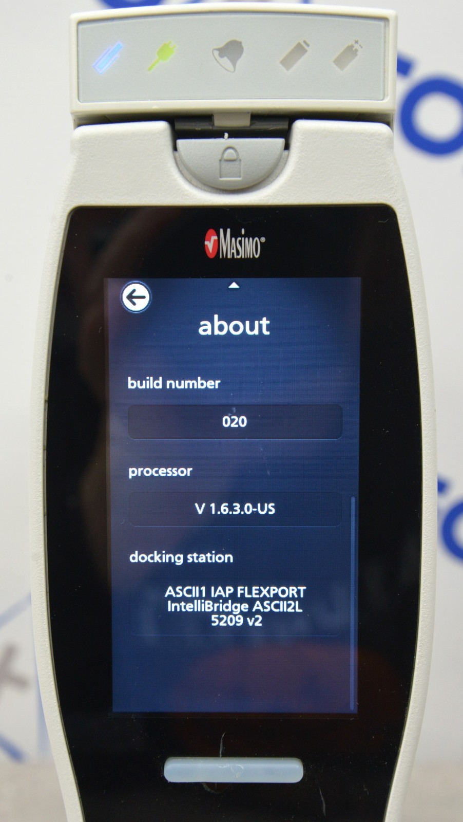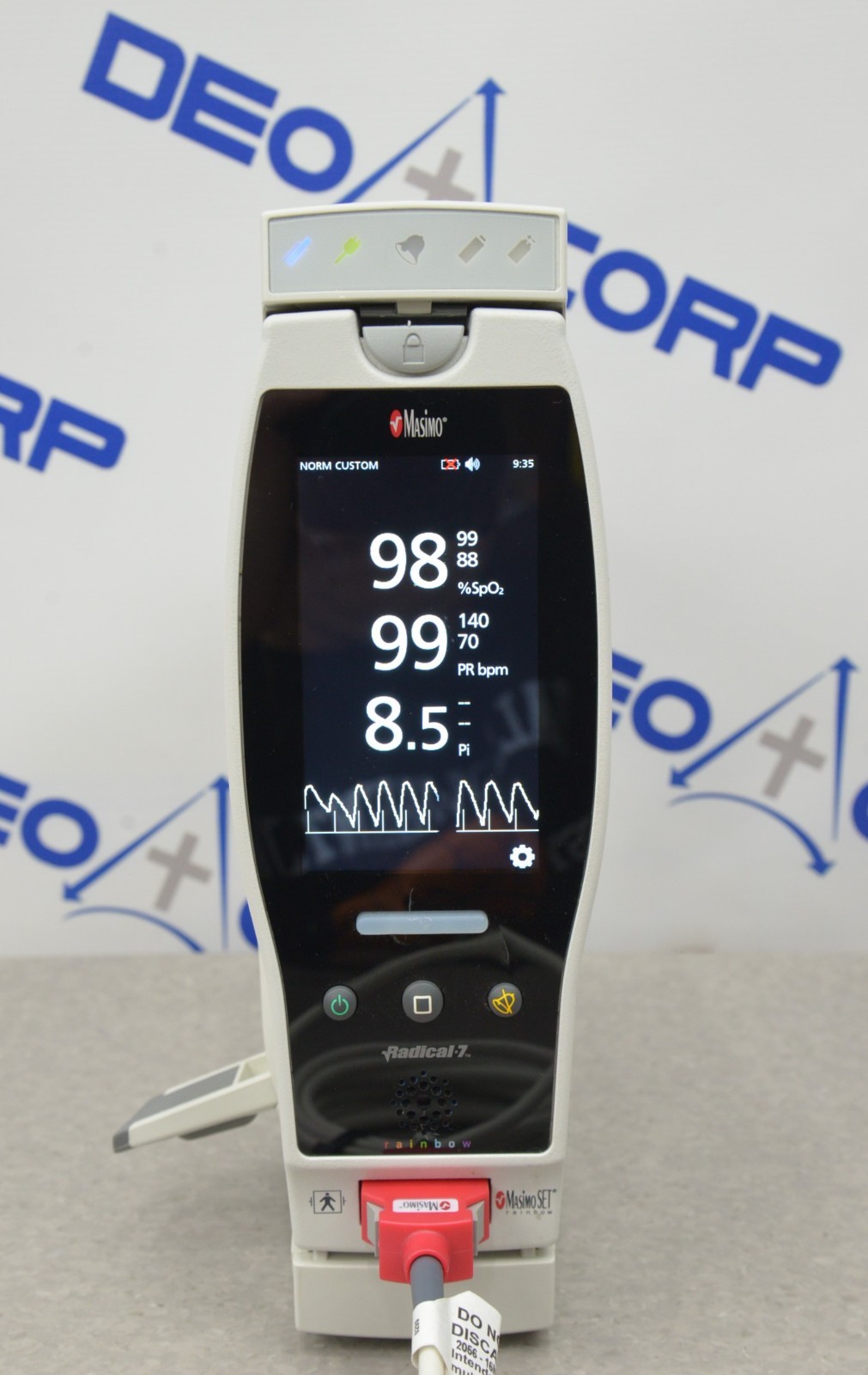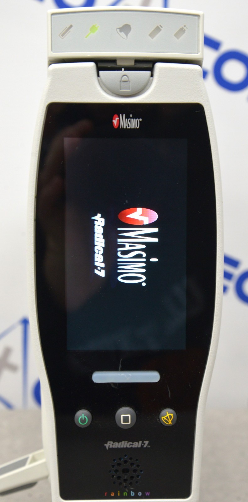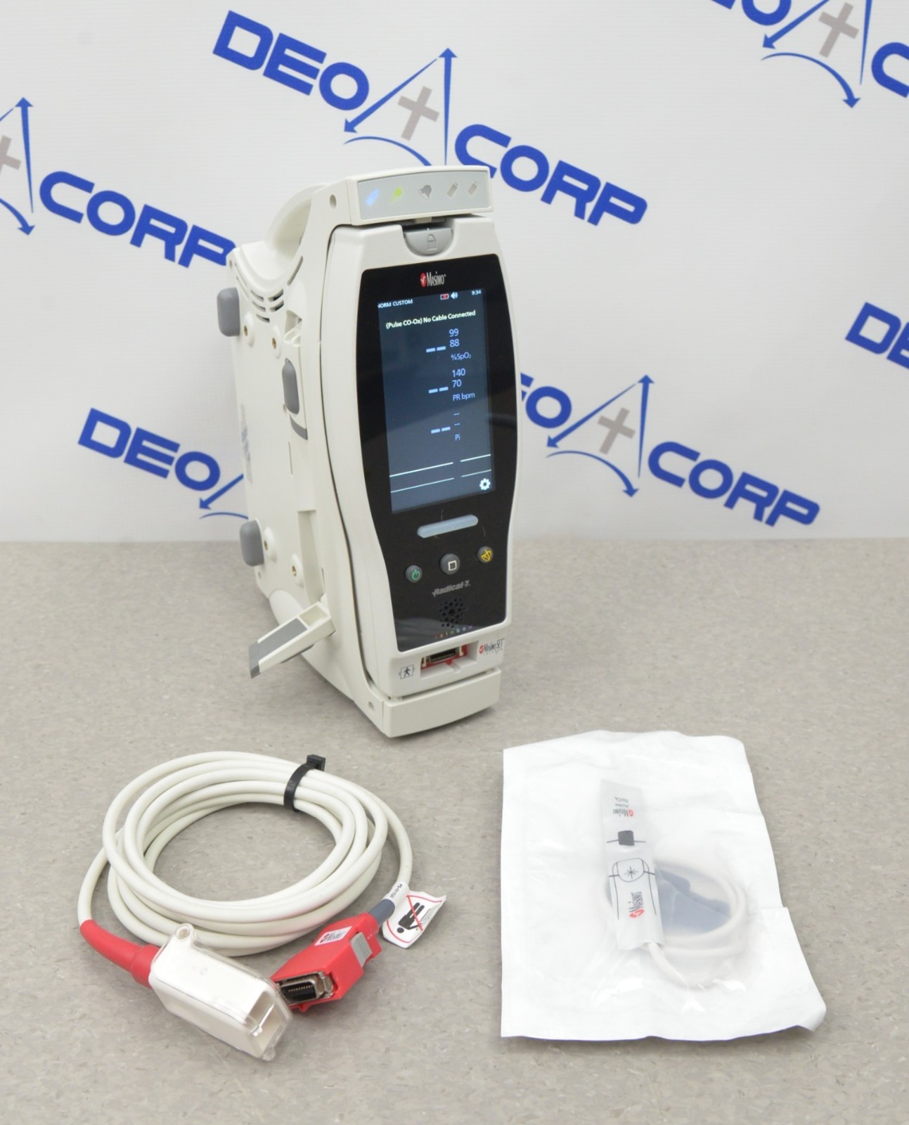 This Masimo Radical-7 Rainbow Touch Screen Signal Extraction Pulse Oximeter W/ RDS-1 Docking Station is in good working condition. The unit powers on properly. The display screen produces a clear image and respond to selection. The DOM is 2020. There are minor scuff marks and one of the kick stands is damaged from previous use (see photos). Does not include a battery. This unit comes with a 30 day satisfaction guarantee. Includes everything in the pictures and nothing else.