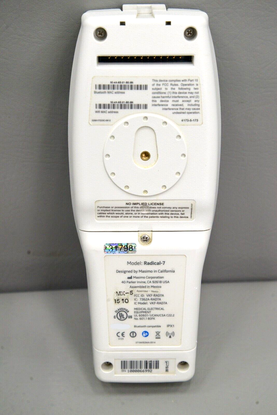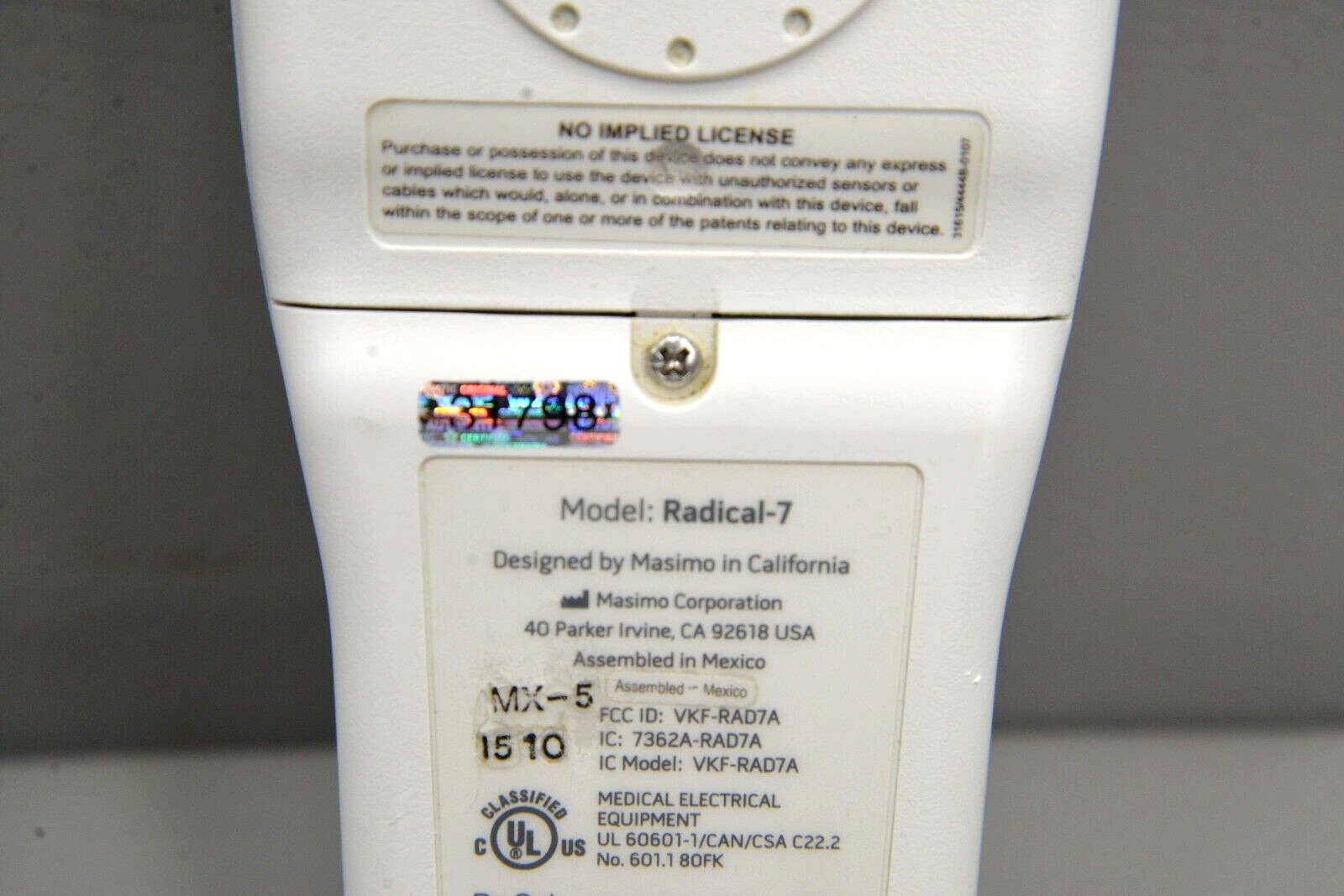 This Masimo Radical 7 Signal Extraction Touch Screen Pulse Oximeter W/ RDS-1 Docking Station is in good working condition. The unit powers on properly. The display screen produces a clear image and respond to touch screen. The DOM is 2015. There are minor scuff marks and a crack in the plastic from previous use (see photos). Does not include a battery. This unit comes with a 30 day satisfaction guarantee. Includes everything in the pictures and nothing else.