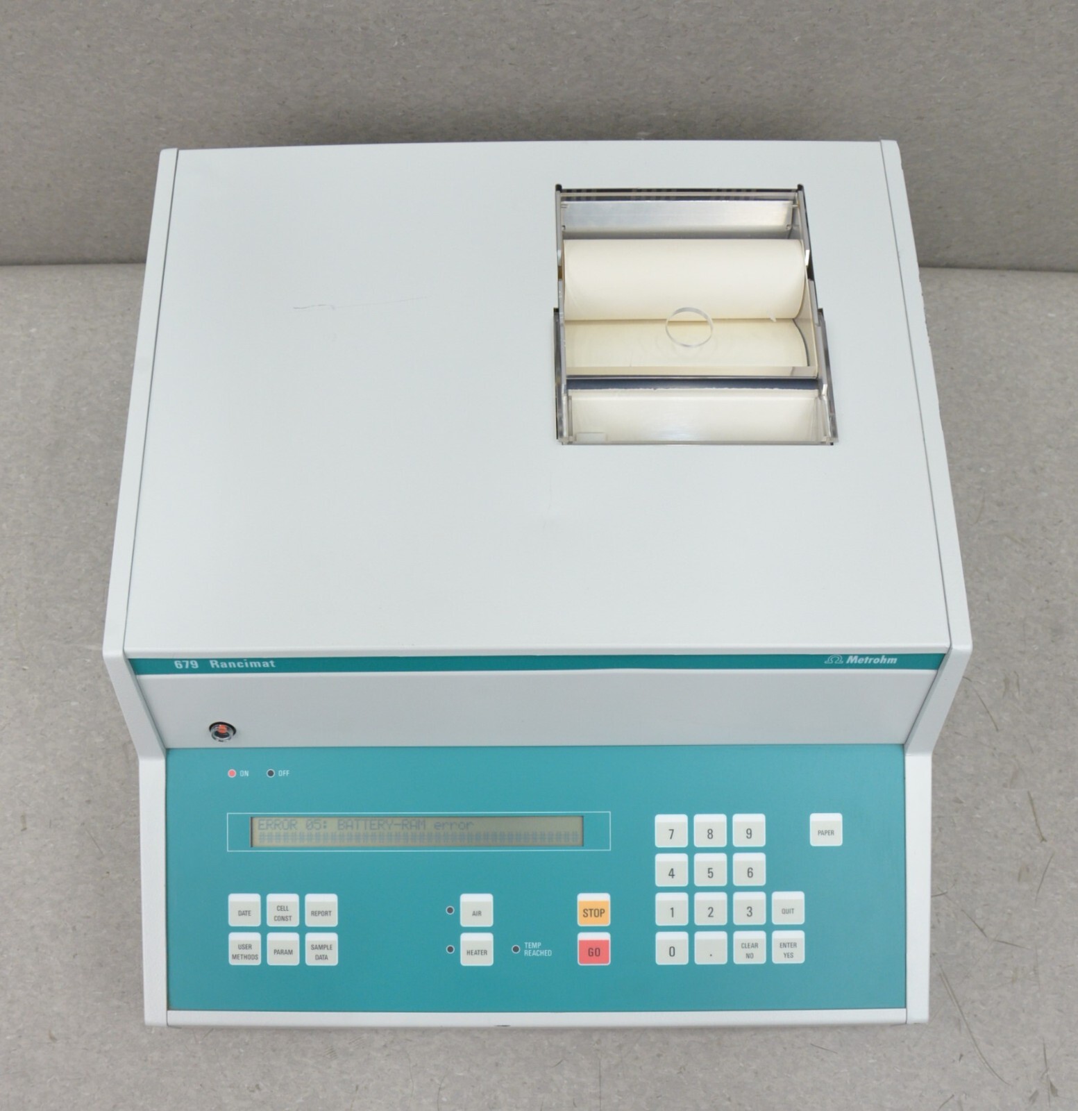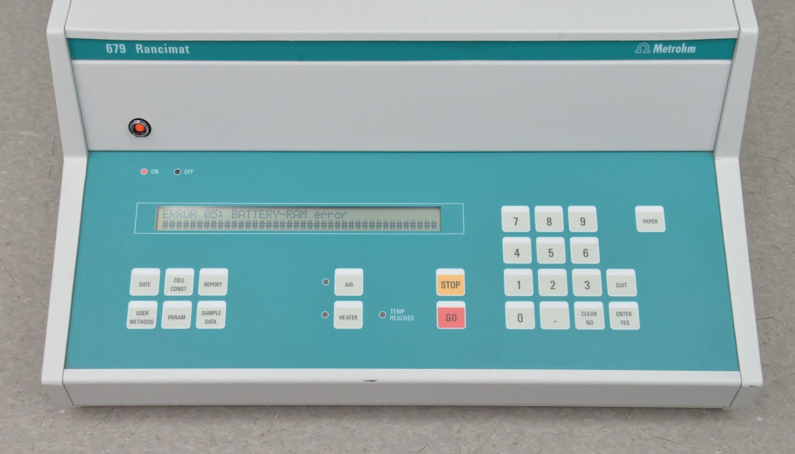 This Metrohm 679 Rancimat Control Unit is in good cosmetic condition. This unit powers on; however, the unit displays error 5 that is a battery-ram error and for this reason it is being sold for parts. There are minor scuff marks from previous use (see photos). Includes everything in the pictures and nothing else.