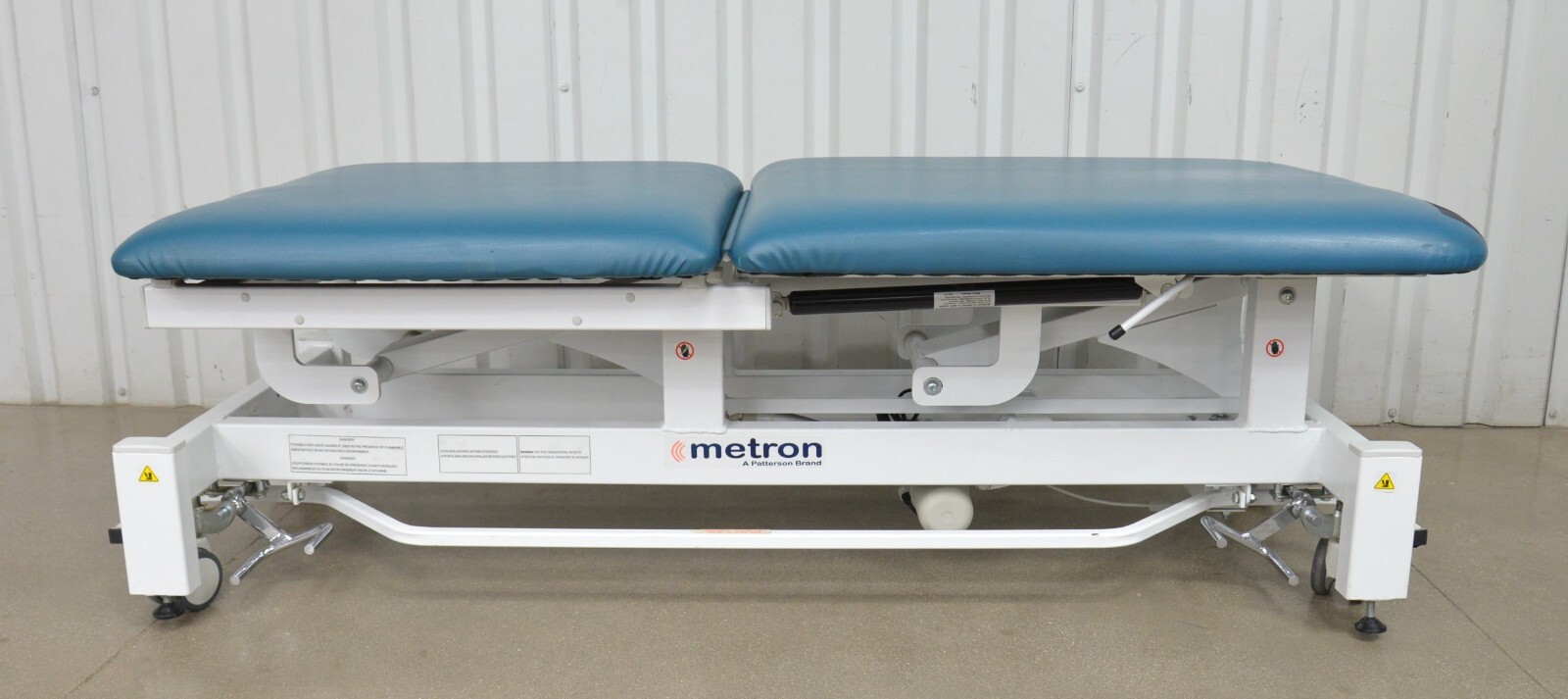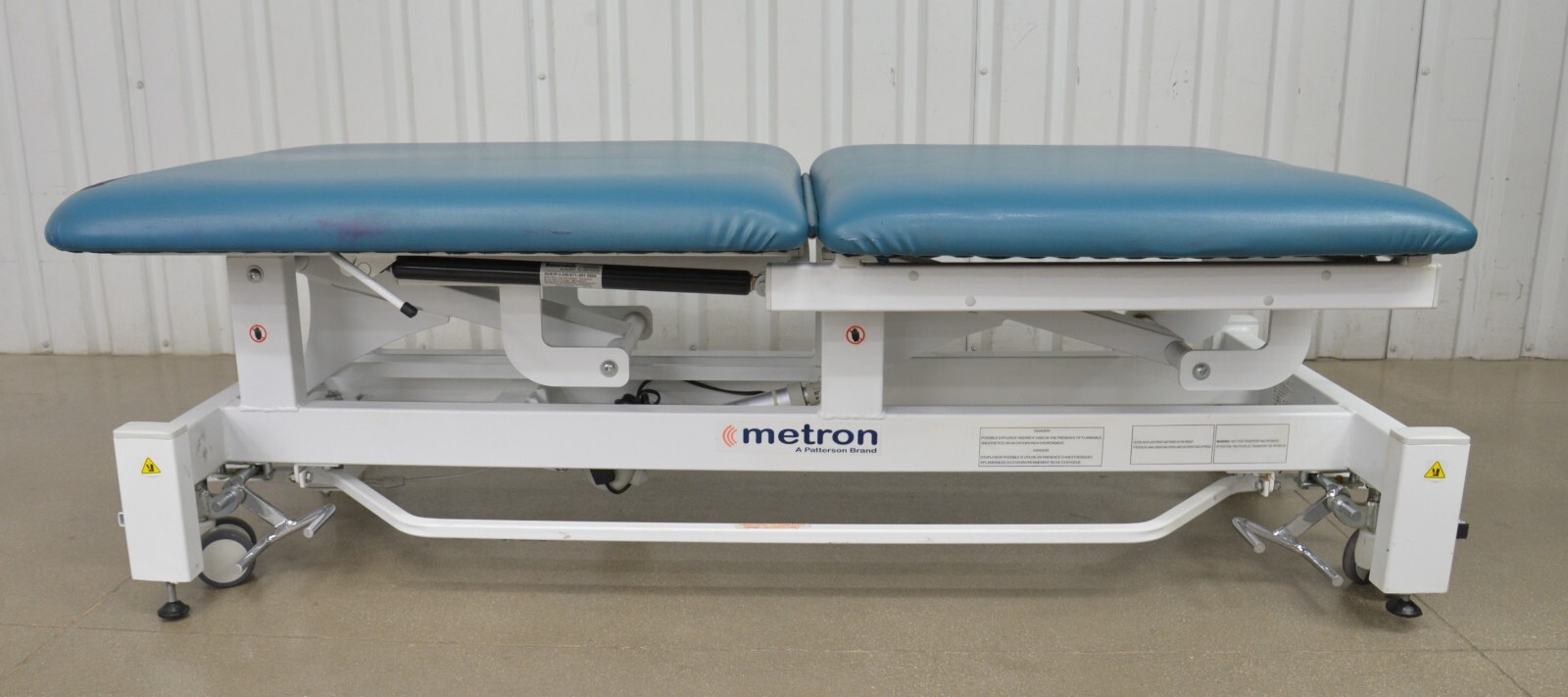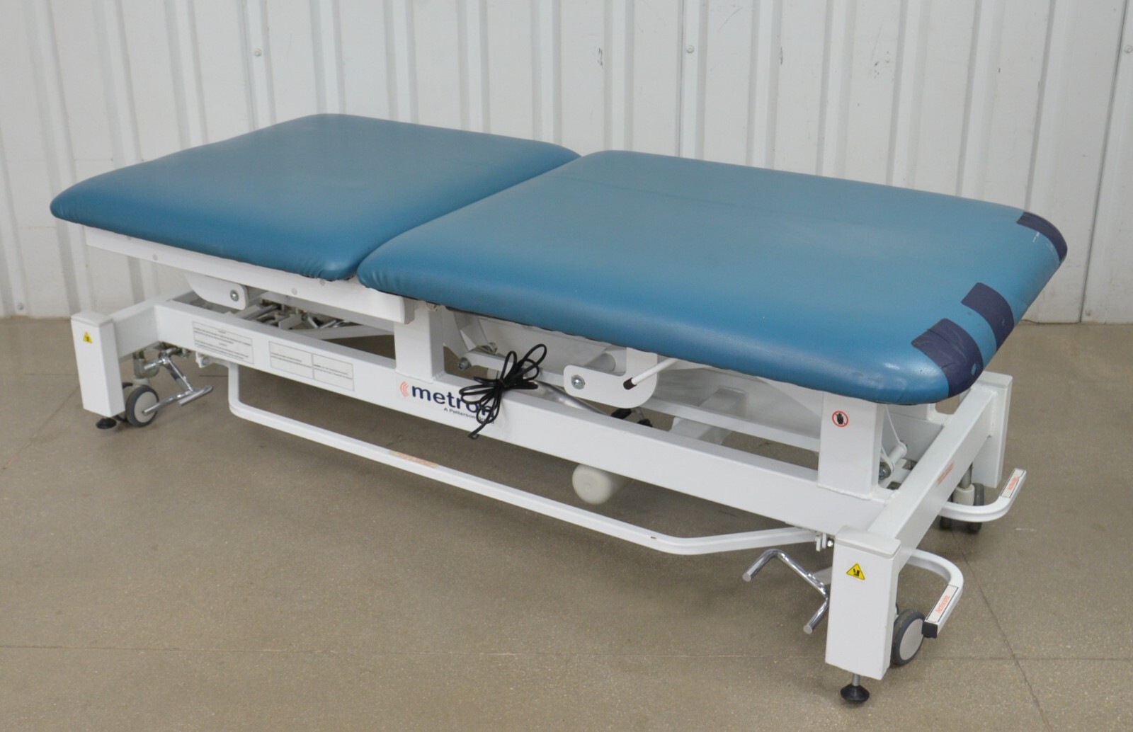 This Metron Elite Aster 3-Section Electric Treatment Table is in good cosmetic condition. The manual adjustments move properly; however this unit does not have a power supply so we can not test further and for this reason it is being sold for parts. The head section is missing. The upholstery has been repaired. There are minor scuff marks from previous use (see photo). Includes everything in the pictures and nothing else.