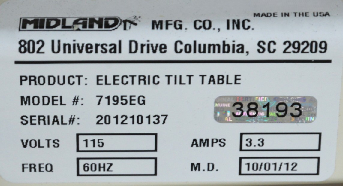 This Midland 7195EG Electric Tilt Table W/ Remote is in good working condition. This unit moves smoothly throughout all range of motion. The foot rest detaches properly. The remote responds to selection. This unit comes with a 30 day satisfaction guarantee. Includes everything in the pictures and nothing else.
