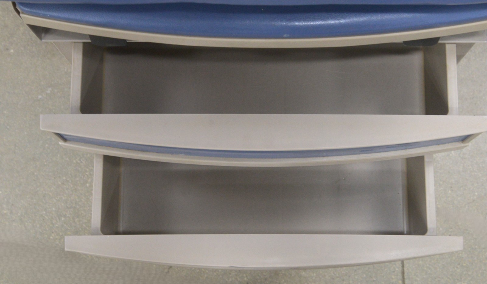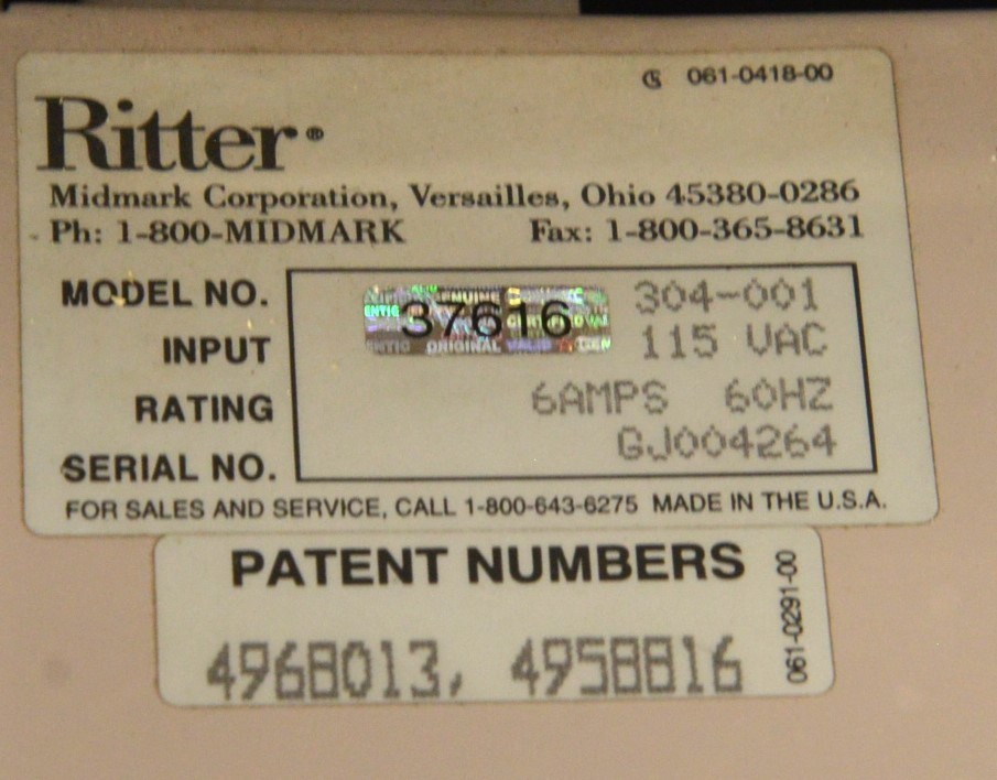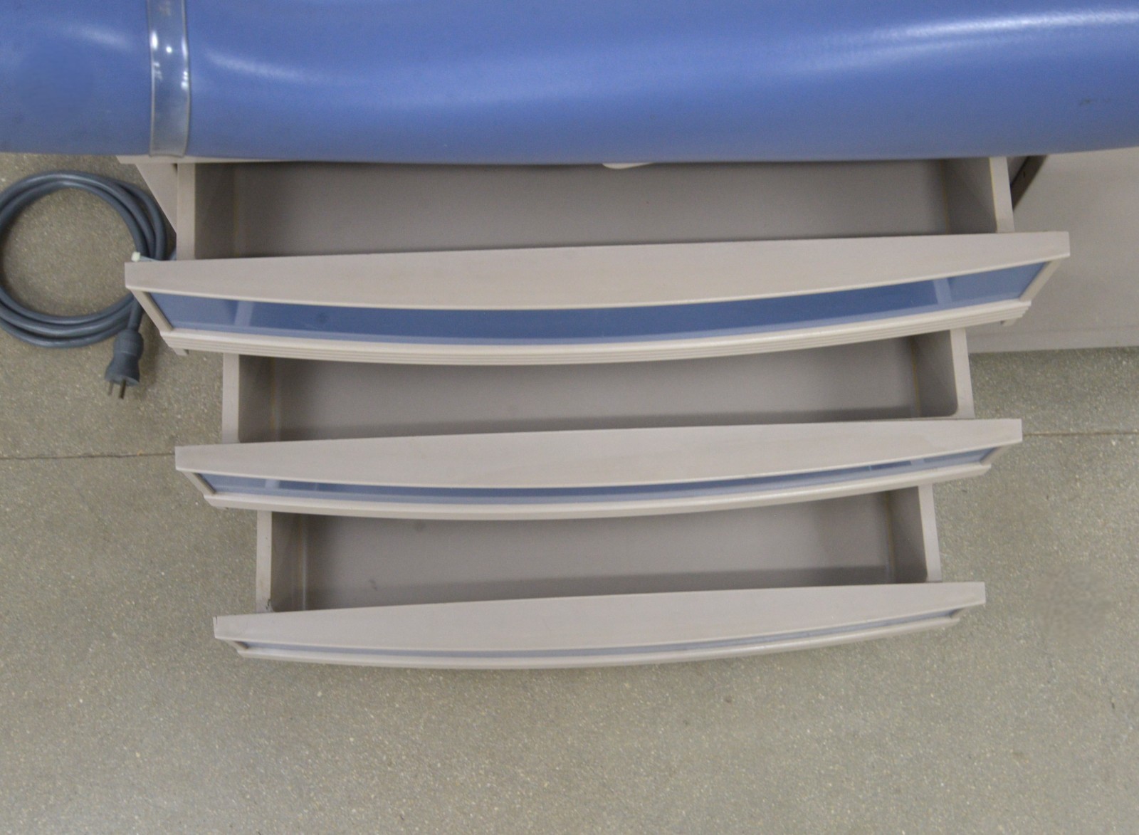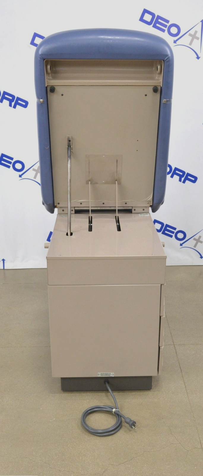 This Midmark 304-001 Barrier Free Manual Exam Table is in great working condition. All manual adjustments move properly. The upholstery has a minor repair on the back of the table on the left side. There are minor scuff marks and slight discoloration from previous use (see photos). This unit comes with a 30 day money back guarantee. Includes everything in the pictures and nothing else.
