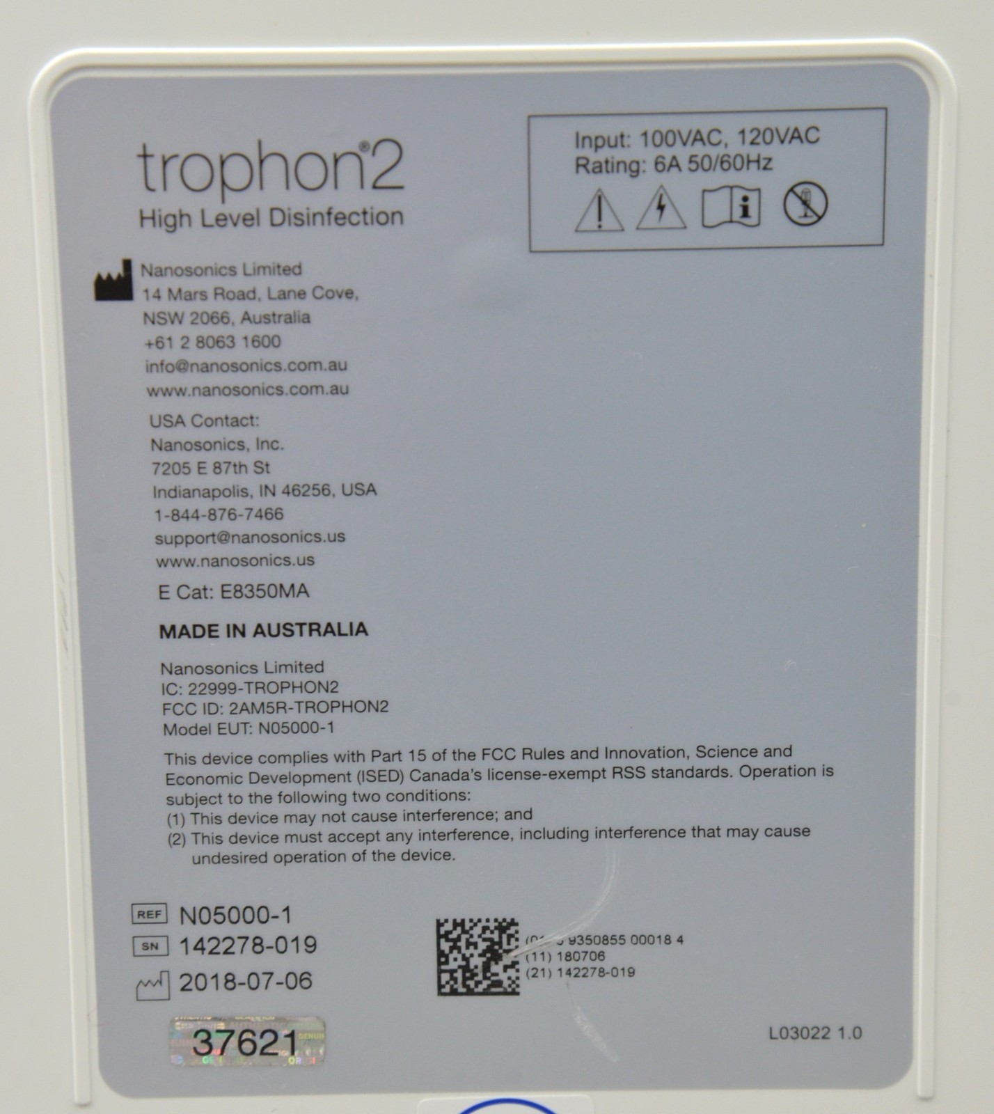 Nanosonics Trophon 2 High-Level Disinfection System N05000-1 2018