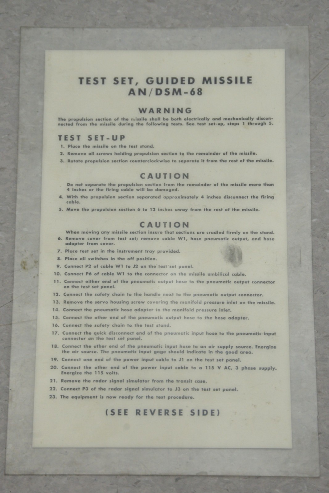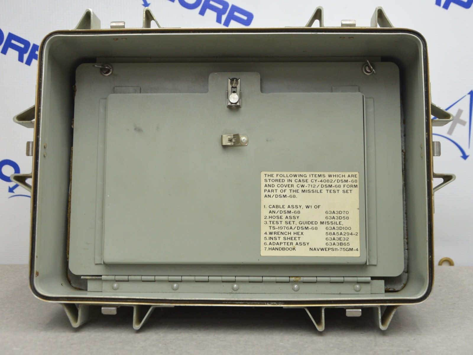 This NAVEWEPS Guided Missile Test Set AN/DSM-68 63A3D100 – 1965 came from a working environment and is in good cosmetic condition. The connection points are clean and in good condition. There are minor scuff marks and a tear in in the power switch cover from previous use (see photo). There is damage to one of the foot rests. This unit comes with a 30 day satisfaction guarantee. Includes everything in the pictures and nothing else.