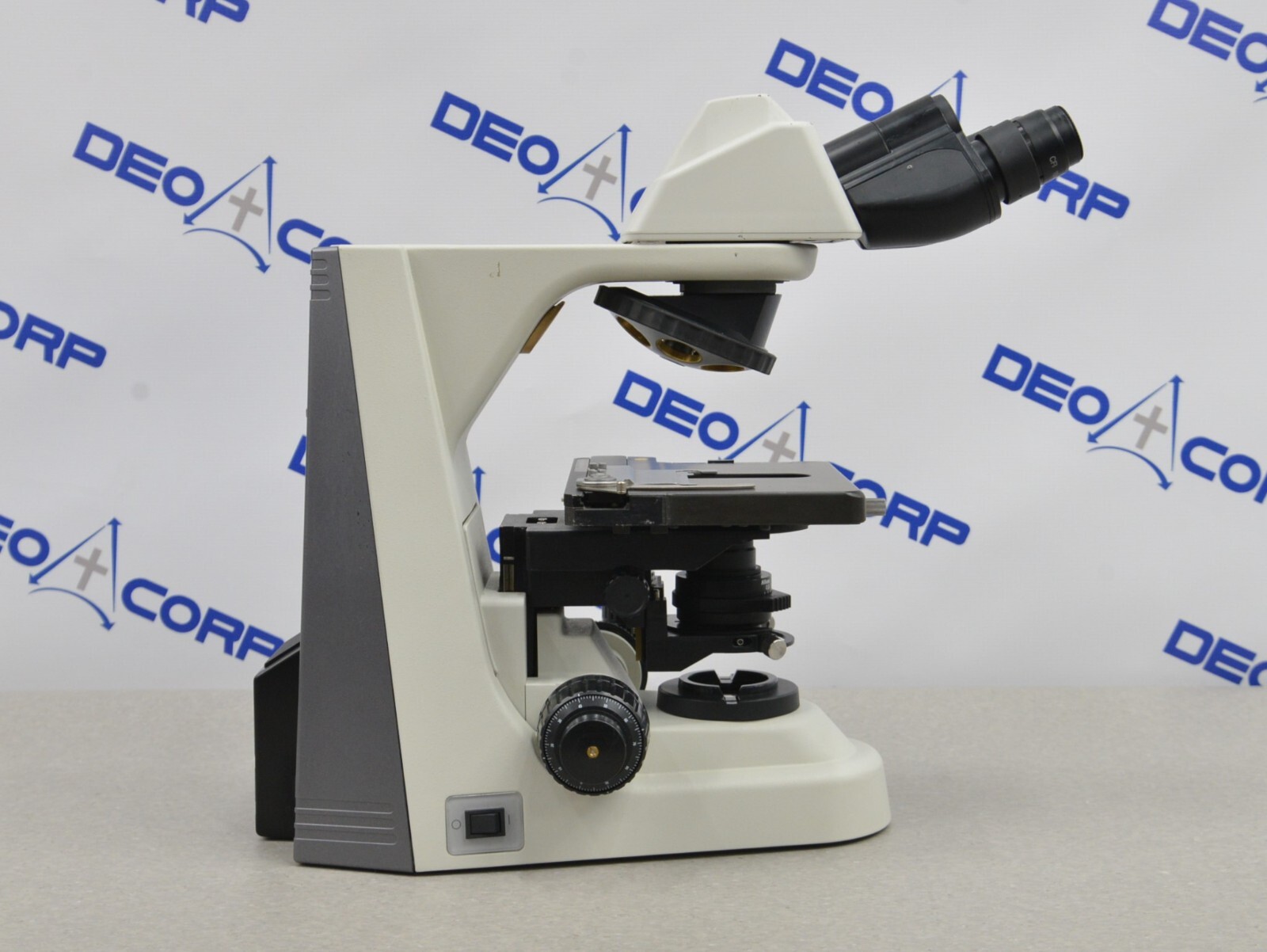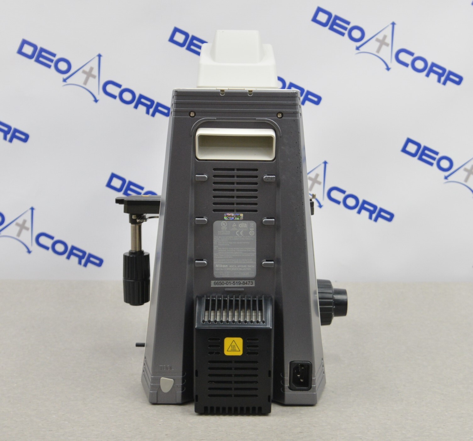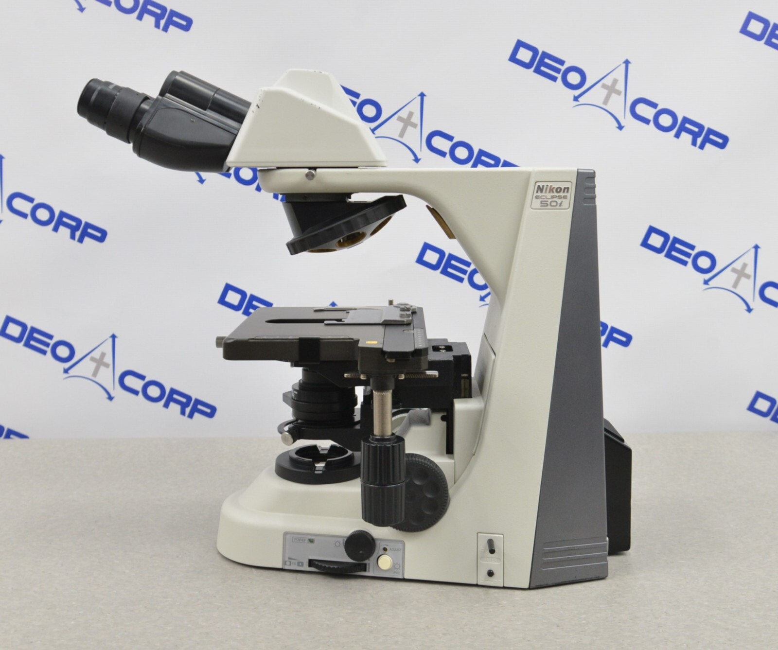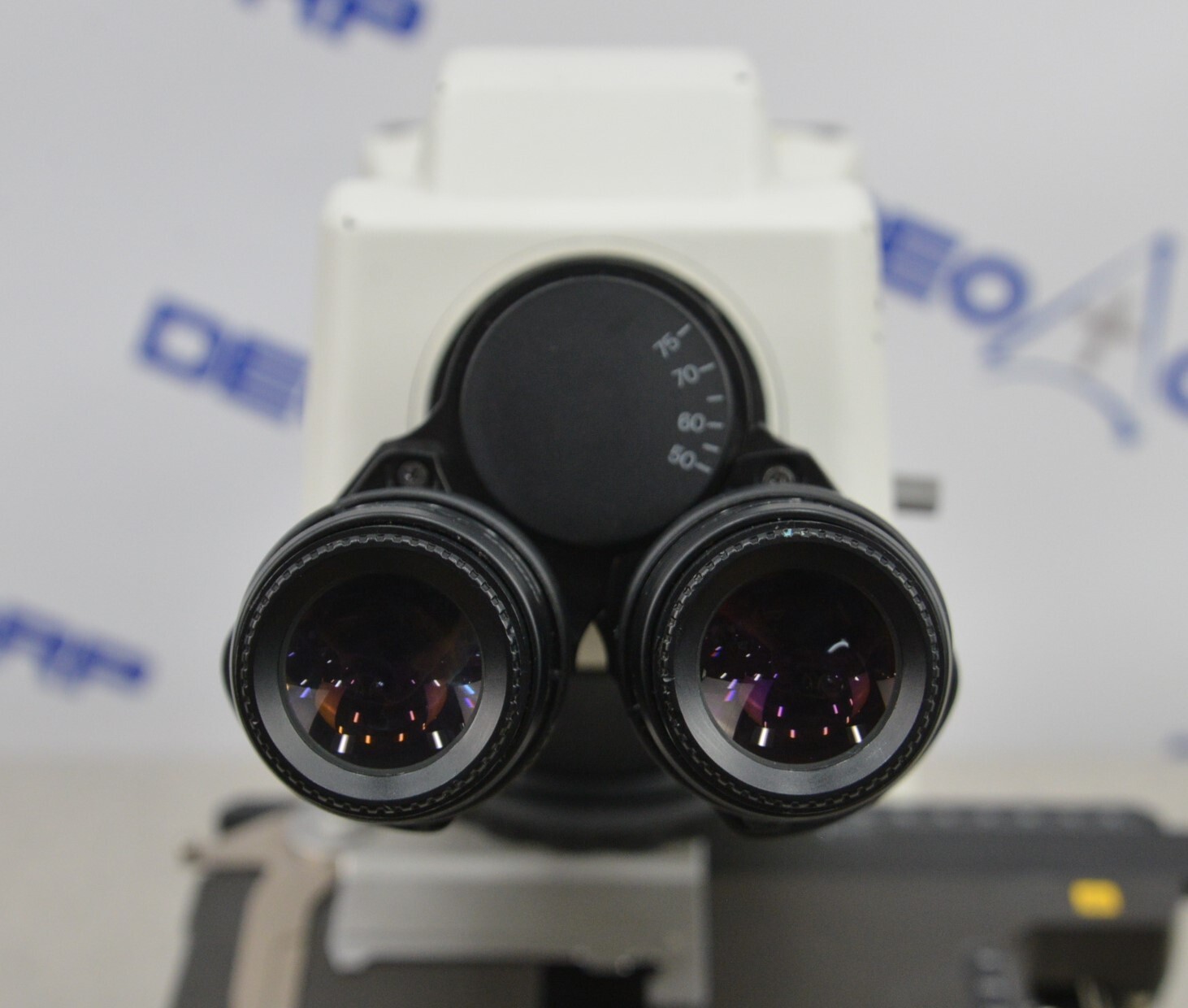 This Nikon Eclipse 50i Upright Microscope W/ Nikon Binocular Head & Accessories is in good working condition. The unit powers on and all adjustments work properly. The lenses have a clear view. One of the lenses is missing a screw. There are some scuff marks from previous use (see photos). This unit comes with a 30 day satisfaction guarantee. Includes everything in the pictures and nothing else.