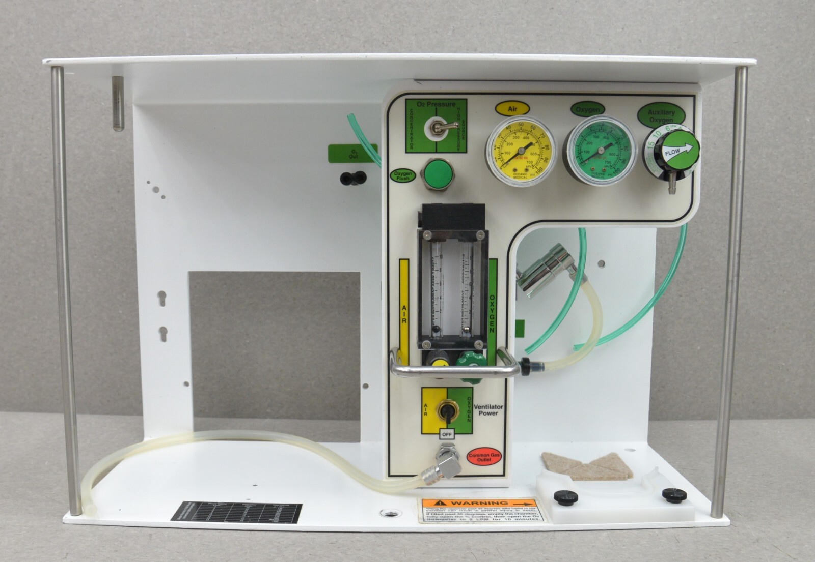 This Oceanic Medical Magellan-2200 Model-2 is in good cosmetic condition. The compressor is broken and has no battery. This unit is missing the vaporizer, ventilator, bellow and scavenger. For this reason the unit is being sold for parts. The connection points are clean and in good condition. There are a few small scuff marks from previous use (see photos). Includes everything in the pictures and nothing else.