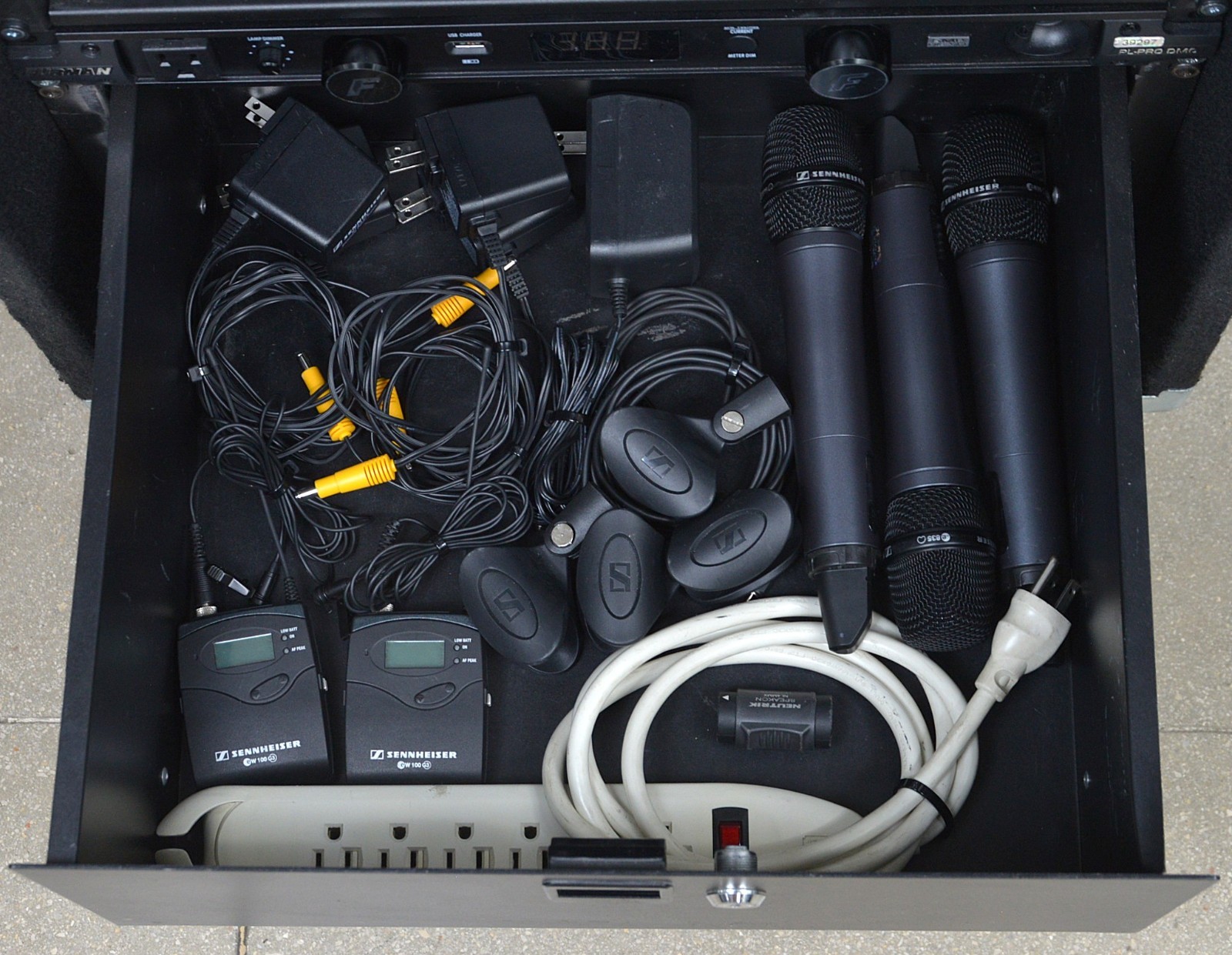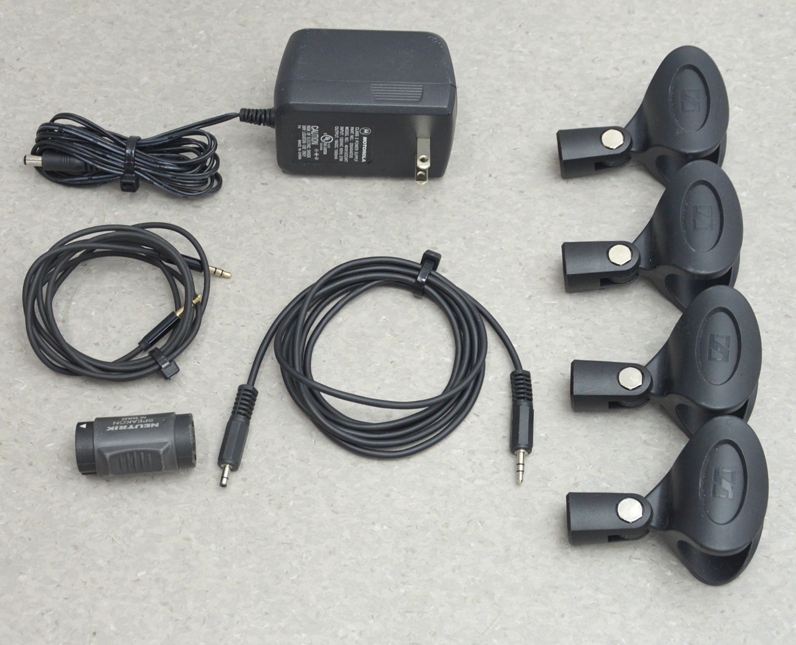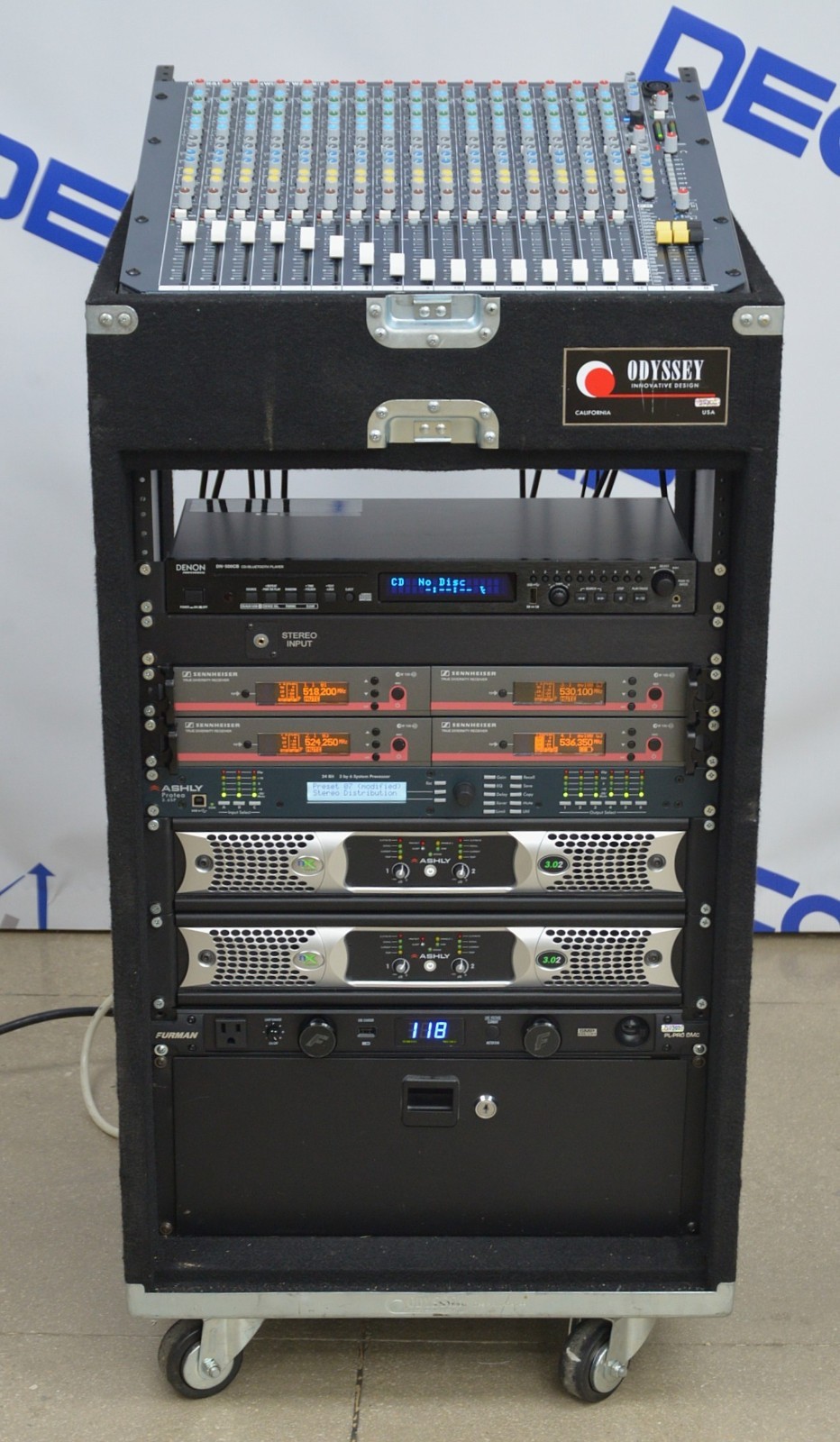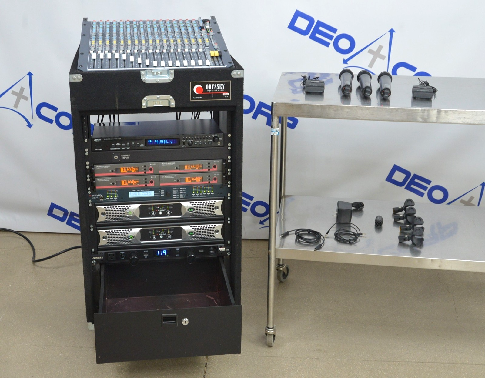 This Odyssey CXP1116W Portable Wireless Microphone System W/ MixWizard WZ4 16:2 Mixer is in great working condition. The whole system powers on and responds properly to selection. All buttons and knobs respond properly and the connections are clean and in good condition. The microphones send a clear signal to the receivers and have a clear sound. The microphones are powered by two AA batteries, batteries not included. There are some minor scuff marks from previous use (see photos). This system comes with a 30 day satisfaction guarantee. Includes everything in the pictures and nothing else.