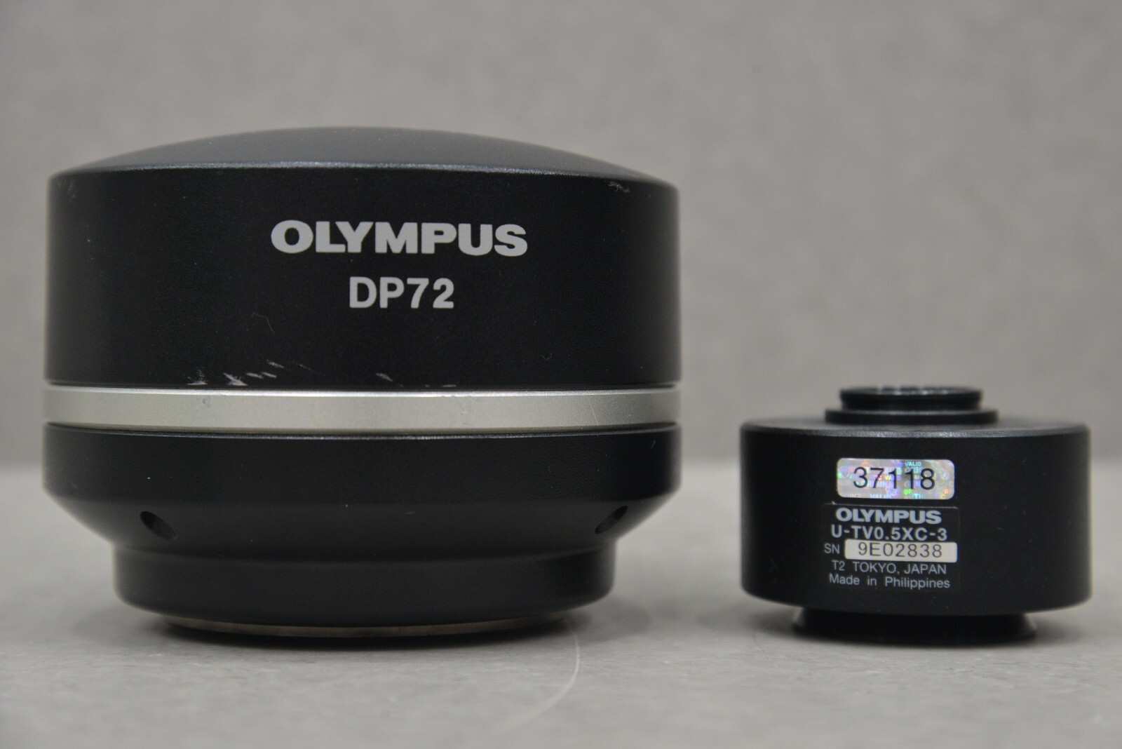 This Olympus Model DP72 Digital Microscope w/ Olympus U-TV0.5XC-3 Camera Adapter is in good condition. The lens is clear on the camera adapter and clean. This camera adapter has a built in reduction lens capable of 1X, 0.63X, 0.5X, and 0.35X. There are some minor scuffs but they do not affect its functionality (see photos). This unit comes with a 30 day satisfaction guarantee. Includes everything in the pictures and nothing else.