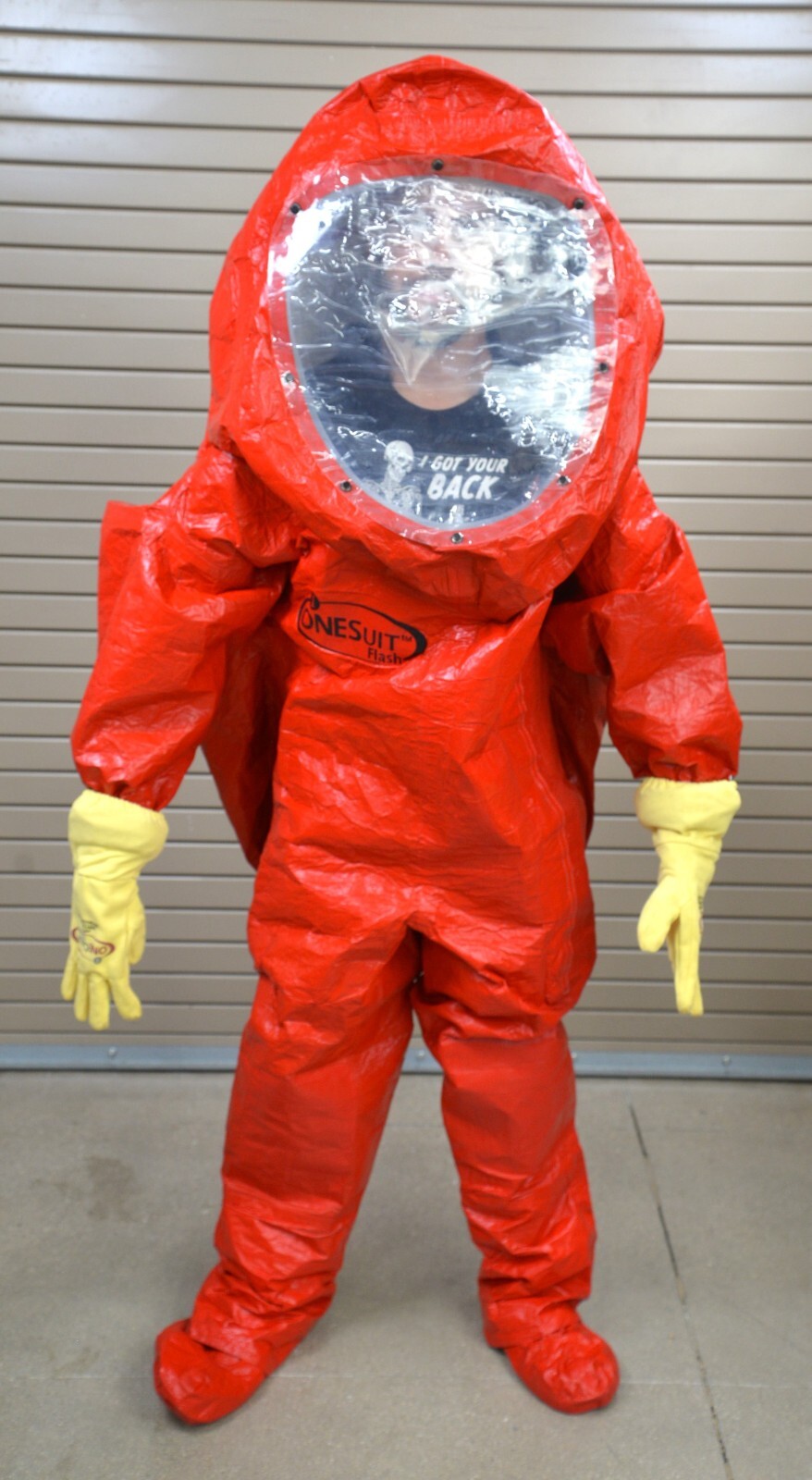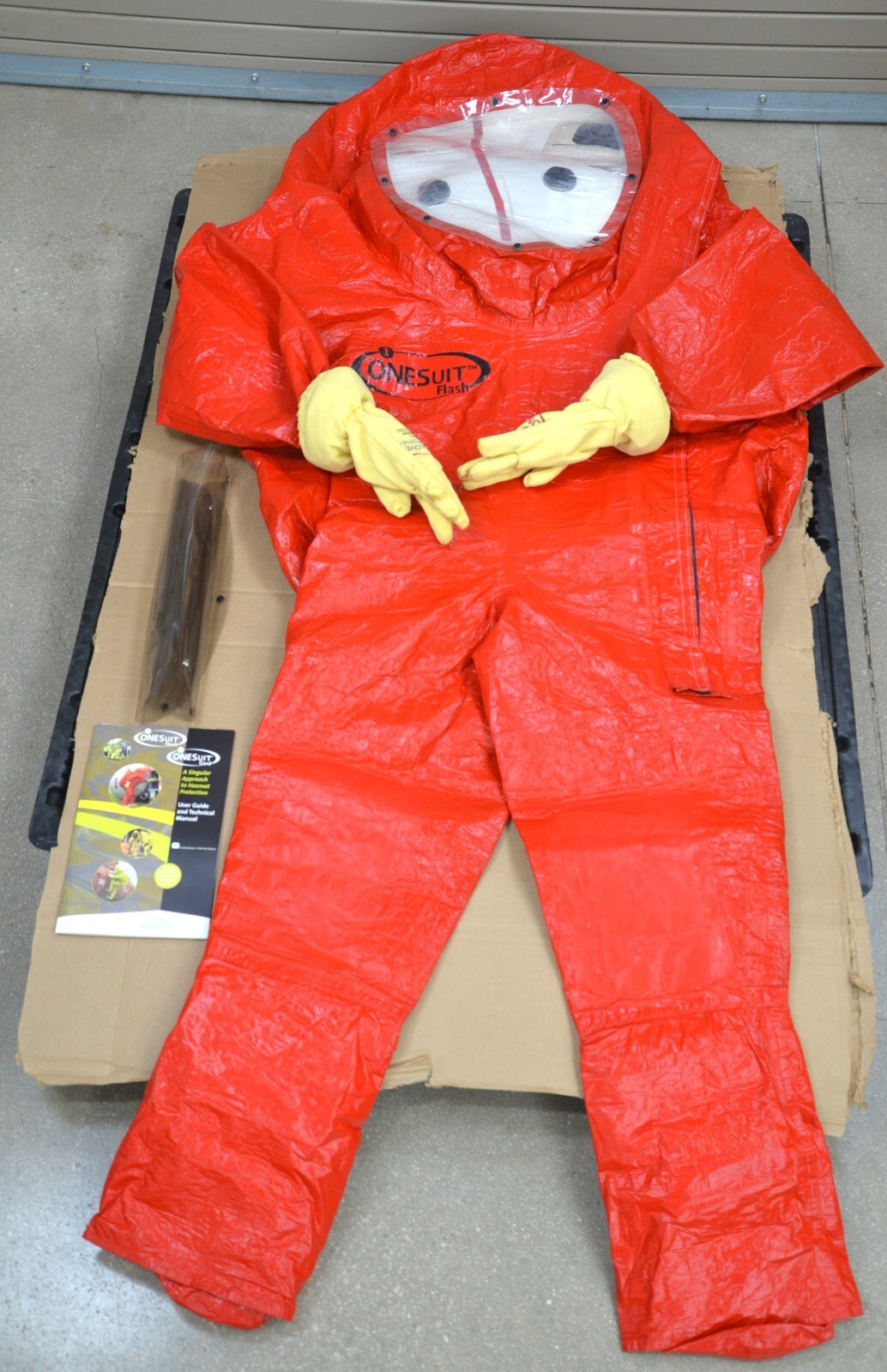 This ONESuit Flash Hazmat Suit is new. One item opened for pictures only. The OneSuit Flash is equipped with flame and abrasion protection and contains an enlarged pod area to accommodate larger SCBA systems. This suit also has an interchangeable exterior and tinted visor. This unit comes with a 30 day satisfaction guarantee.  Includes everything in the pictures and nothing else.