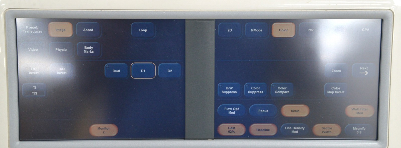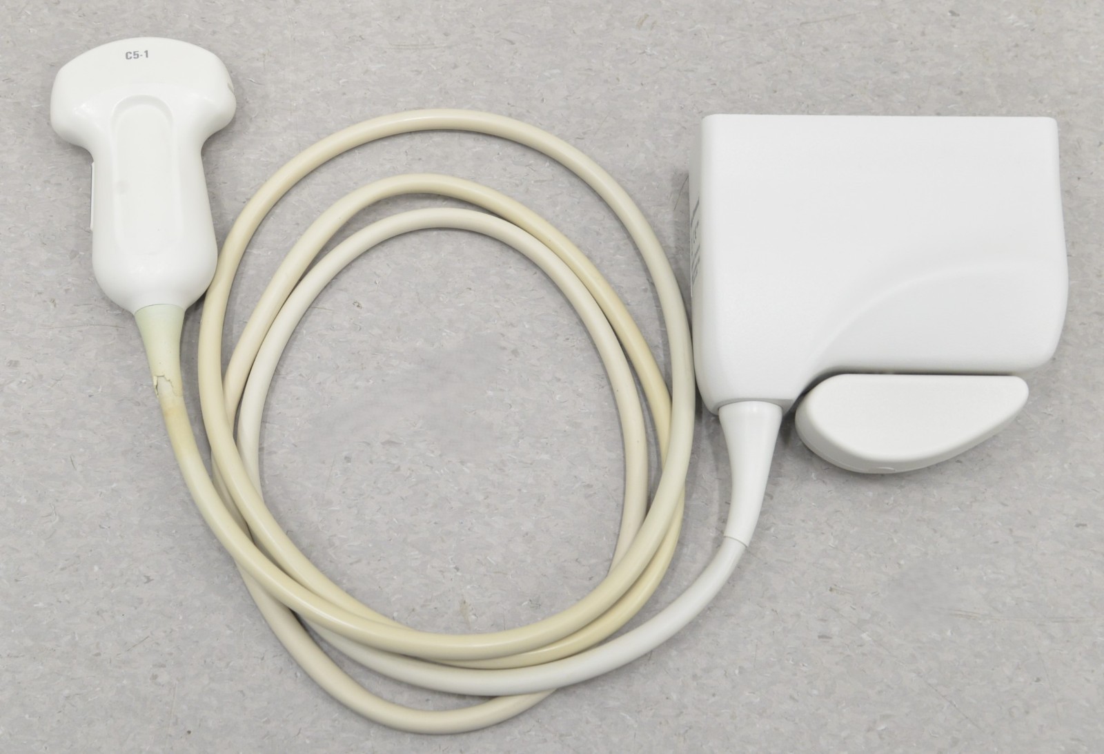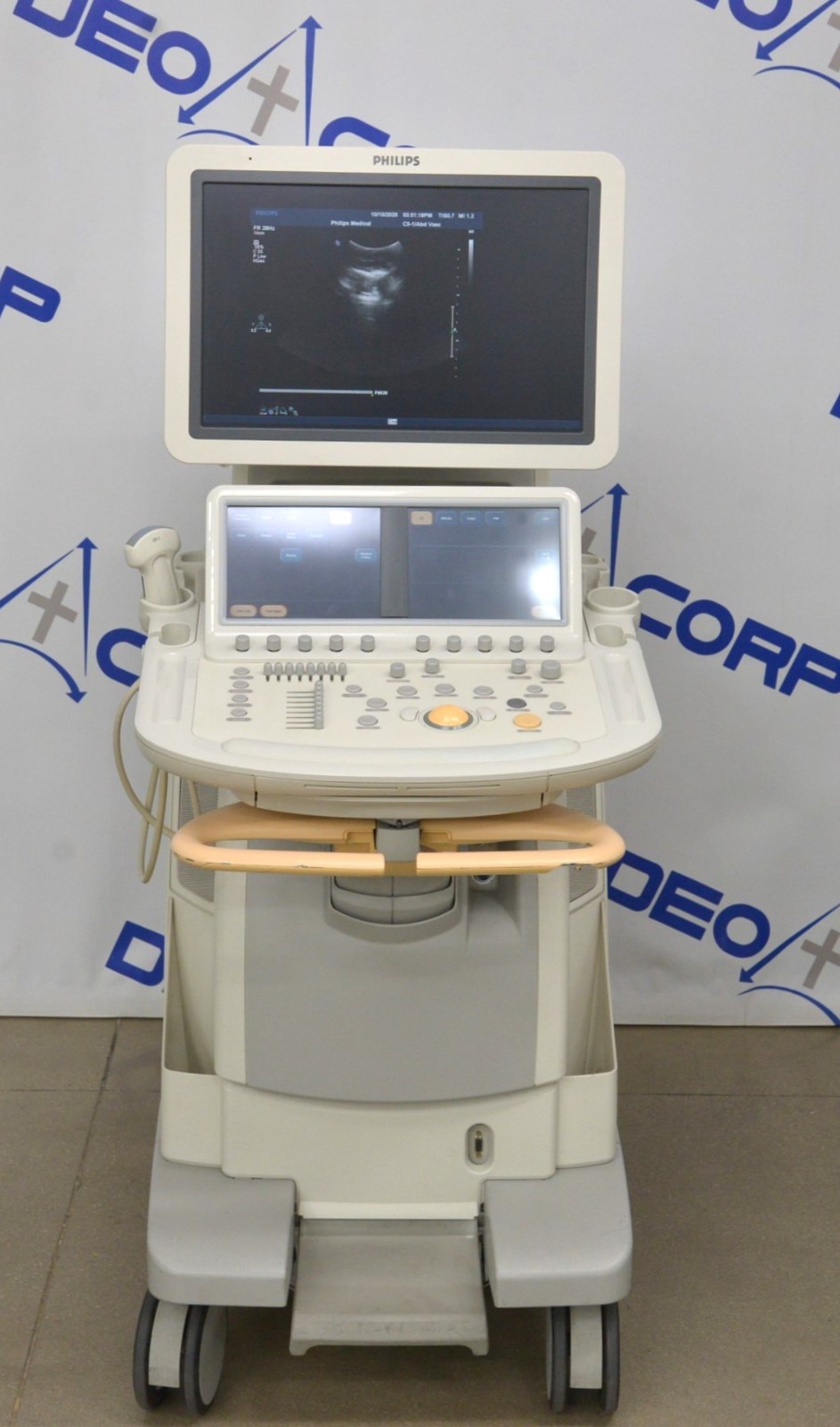 This Philips iE33 Diagnostic System w/ C5-1 Convex Array is in good working condition. The unit powers on properly. The screens produce a clear image and respond properly to all selections. This C5-1 handpiece appears to have delamination. There are some scuff marks and cracks from previous use (see photos). The C5-1 cable jacket has slight damage. This unit comes with a 30 satisfaction guarantee. Includes everything in the pictures and nothing else.